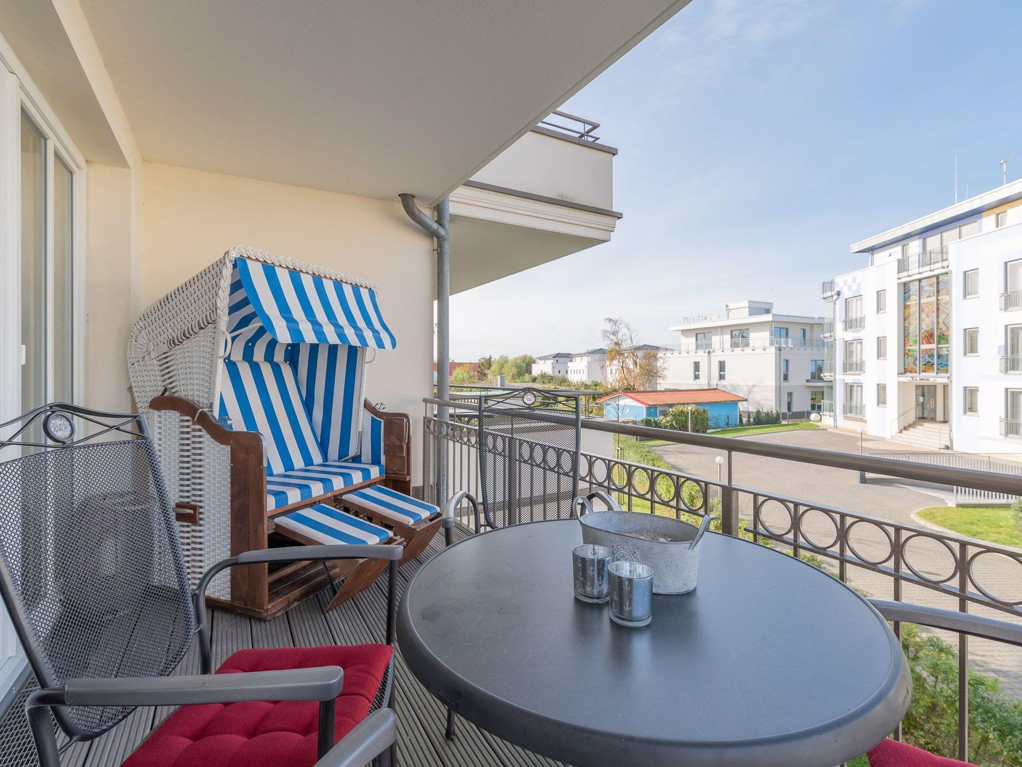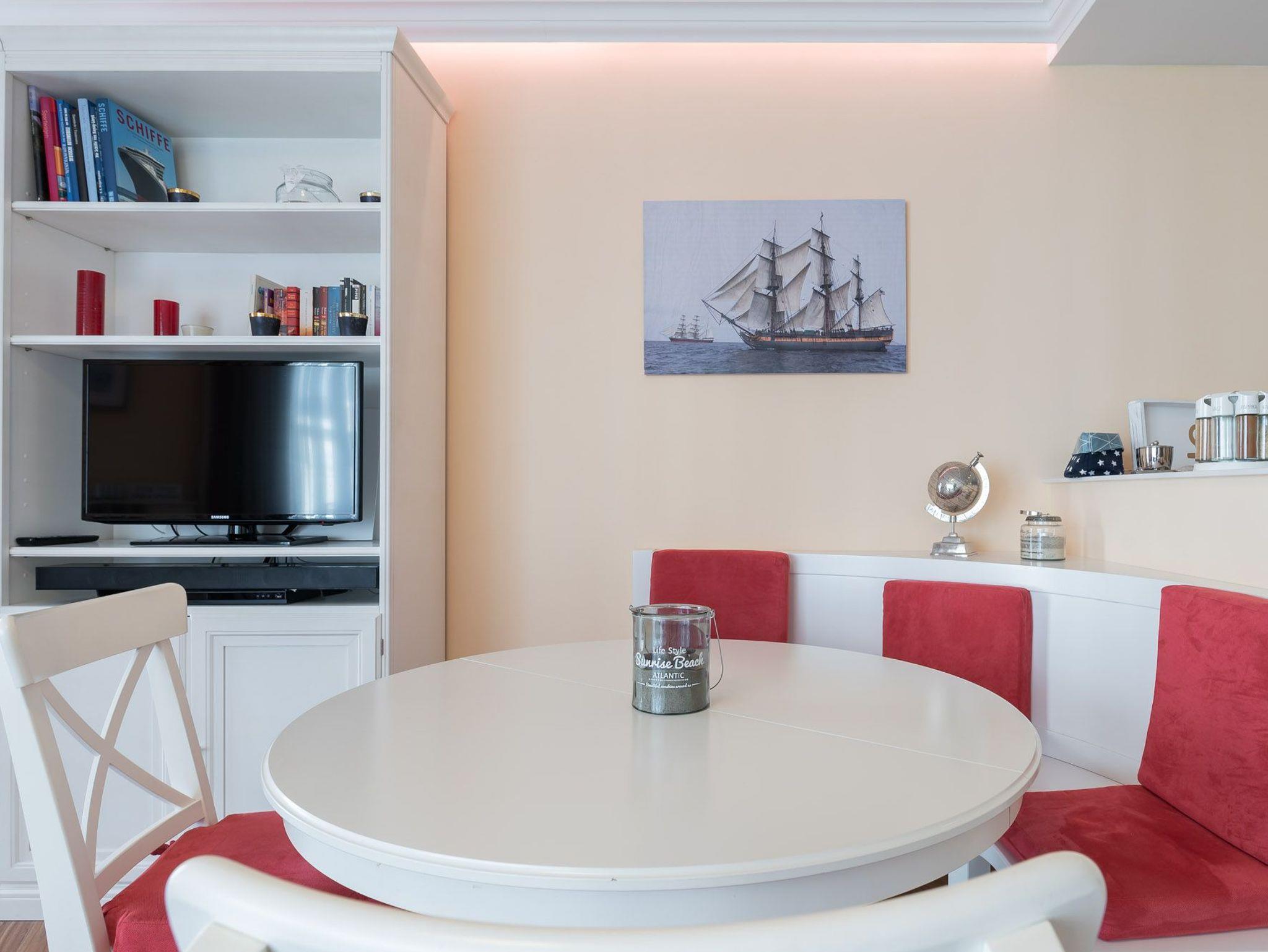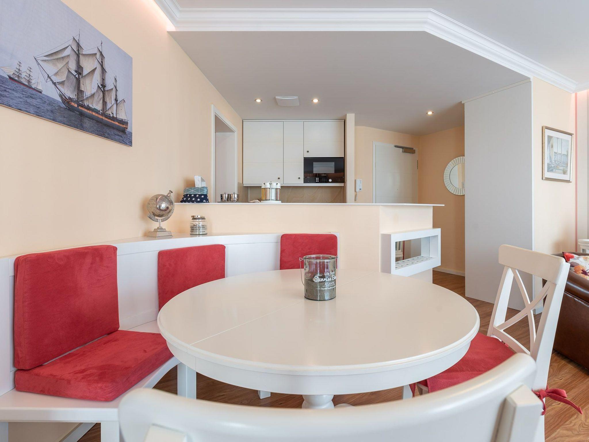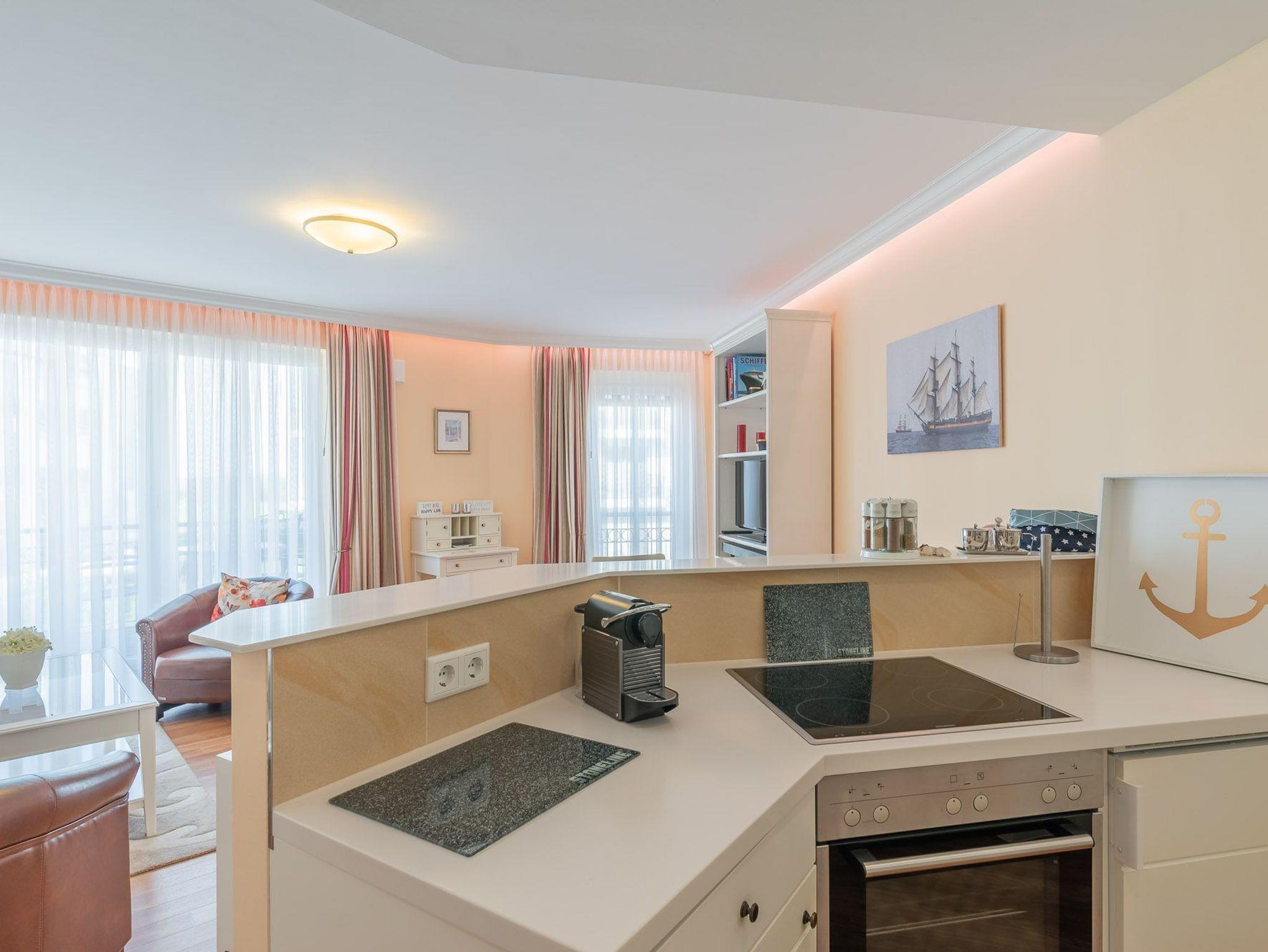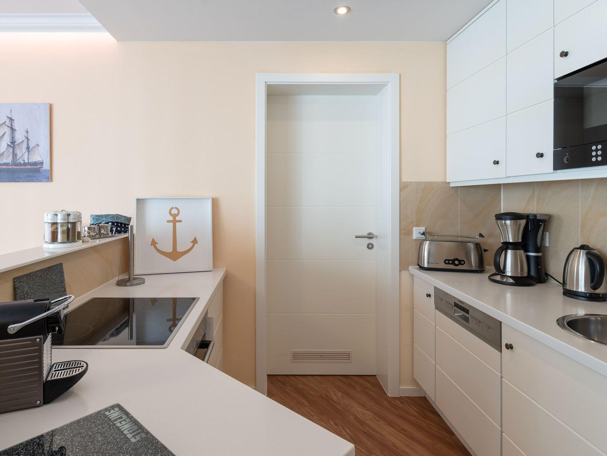Der Wohnbereich der Ferienwohnung ist modern und zeitlos eingerichtet und verfügt über eine gemütliche Schlafcouch, einen Couchtisch, einen Esstisch mit vier Stühlen sowie einen LED-TV und eine Sound-Anlage. Im Schlafzimmer befinden sich neben einem komfortablen Doppelbett (1,80 x 2,00 m) ein weiterer LED-TV, ein geräumiger Einbauschrank, ein Kinderreisebett, ein Kinderstuhl sowie Bügelbrett und Bügeleisen. Die offen gestaltete, hochwertige Einbauküche lässt keine Wünsche offen. Sie verfügt über Geschirrspüler, Kühlschrank mit Gefrierfach, Kaffeemaschine, Nespresso - Maschine, Wasserkocher, Toaster, ausreichend Geschirr und Besteck, 4-Platten-Herd (Ceran) mit Backofen und eine Mikrowelle. Das Badezimmer verfügt über eine bodengleiche Regenfall-Dusche und einen großen Waschtisch mit Wandspiegel, Radio und Föhn. An Herbst- und Wintertagen sorgt in allen Räumen eine Fußbodenheizung für Wärme und Gemütlichkeit. Auf dem möblierten Balkon in Nord-West-Ausrichtung mit Meerblick lassen sich gemütliche Sonnen- und Abendstunden verbringen.