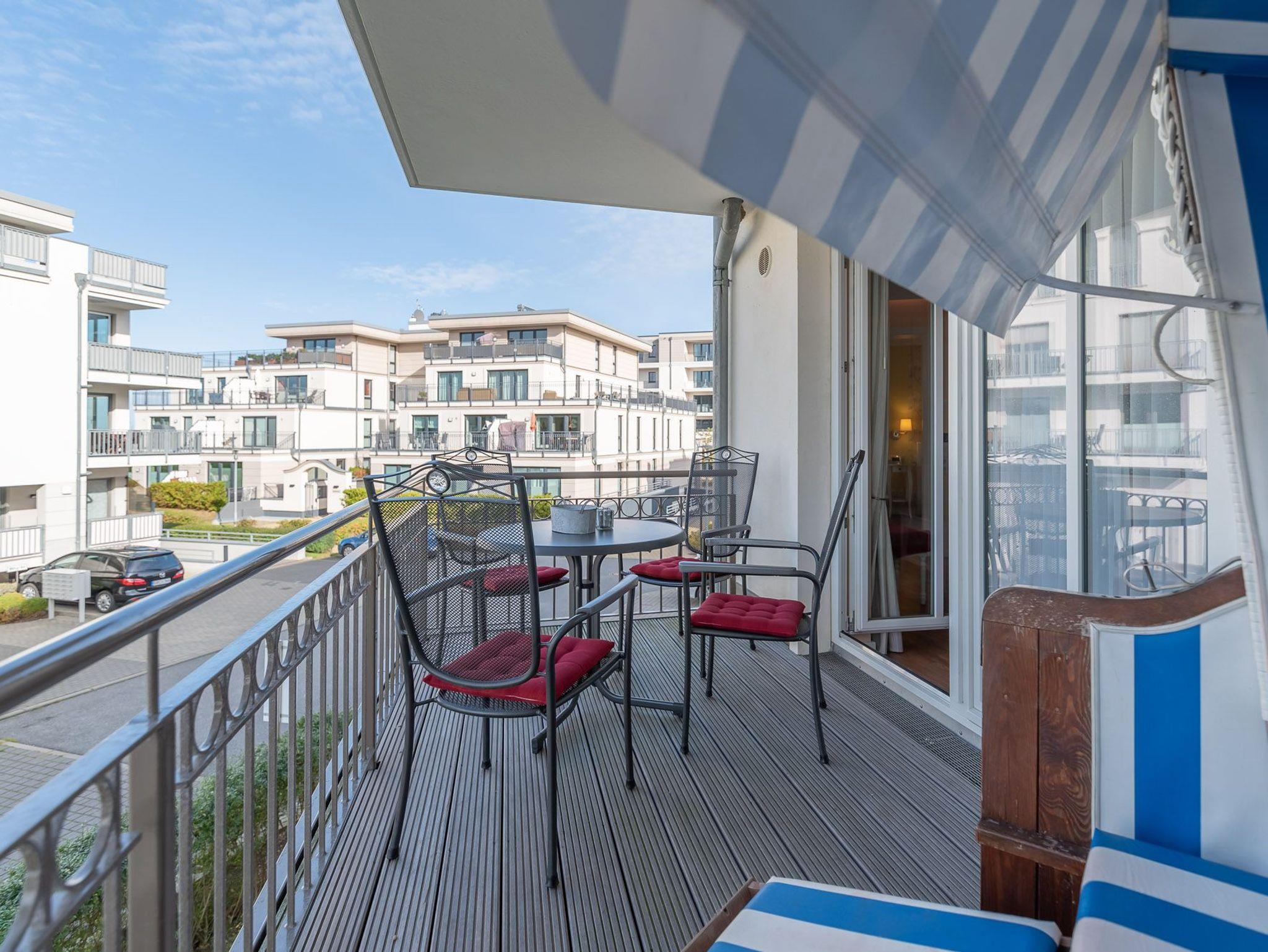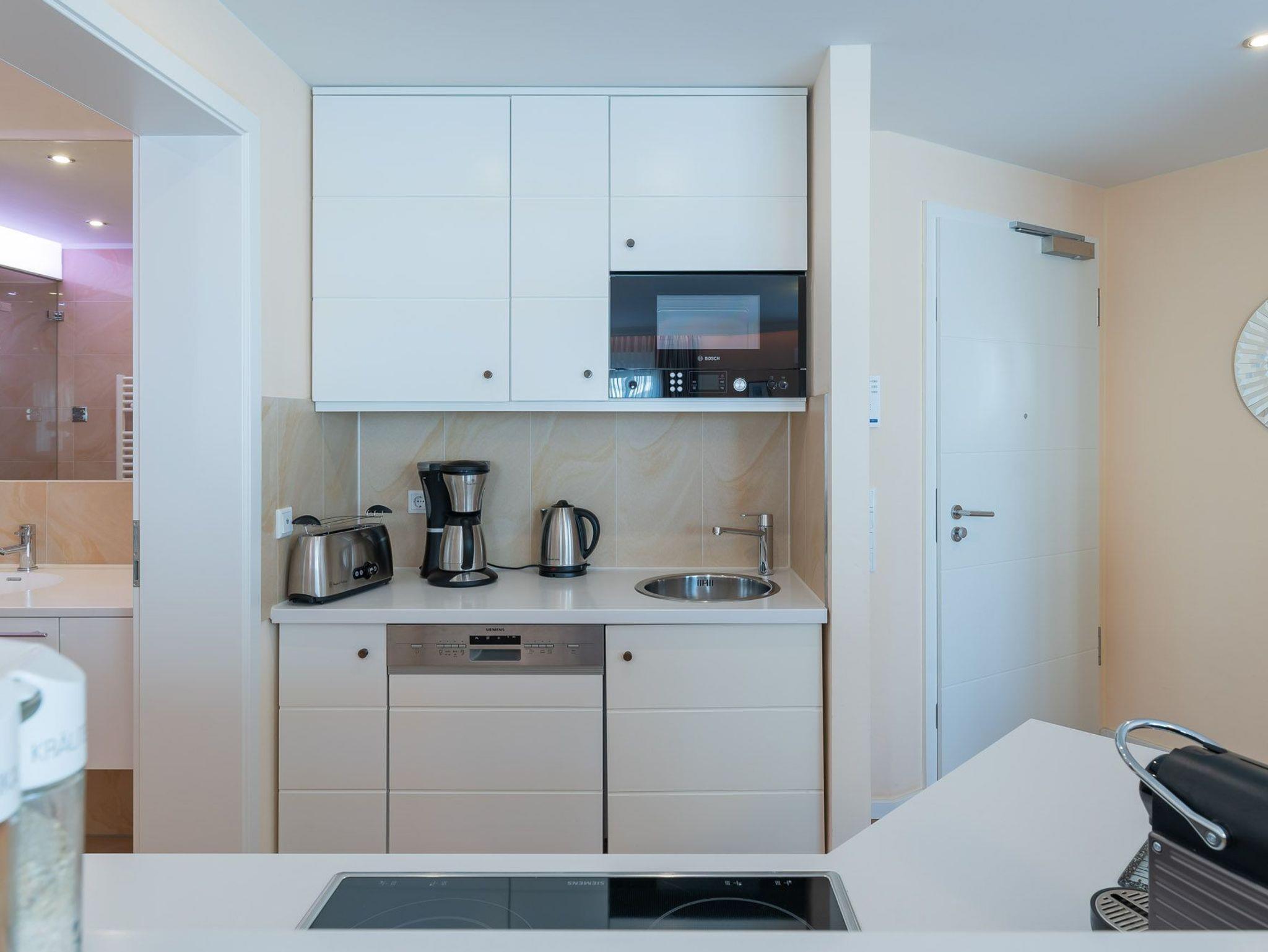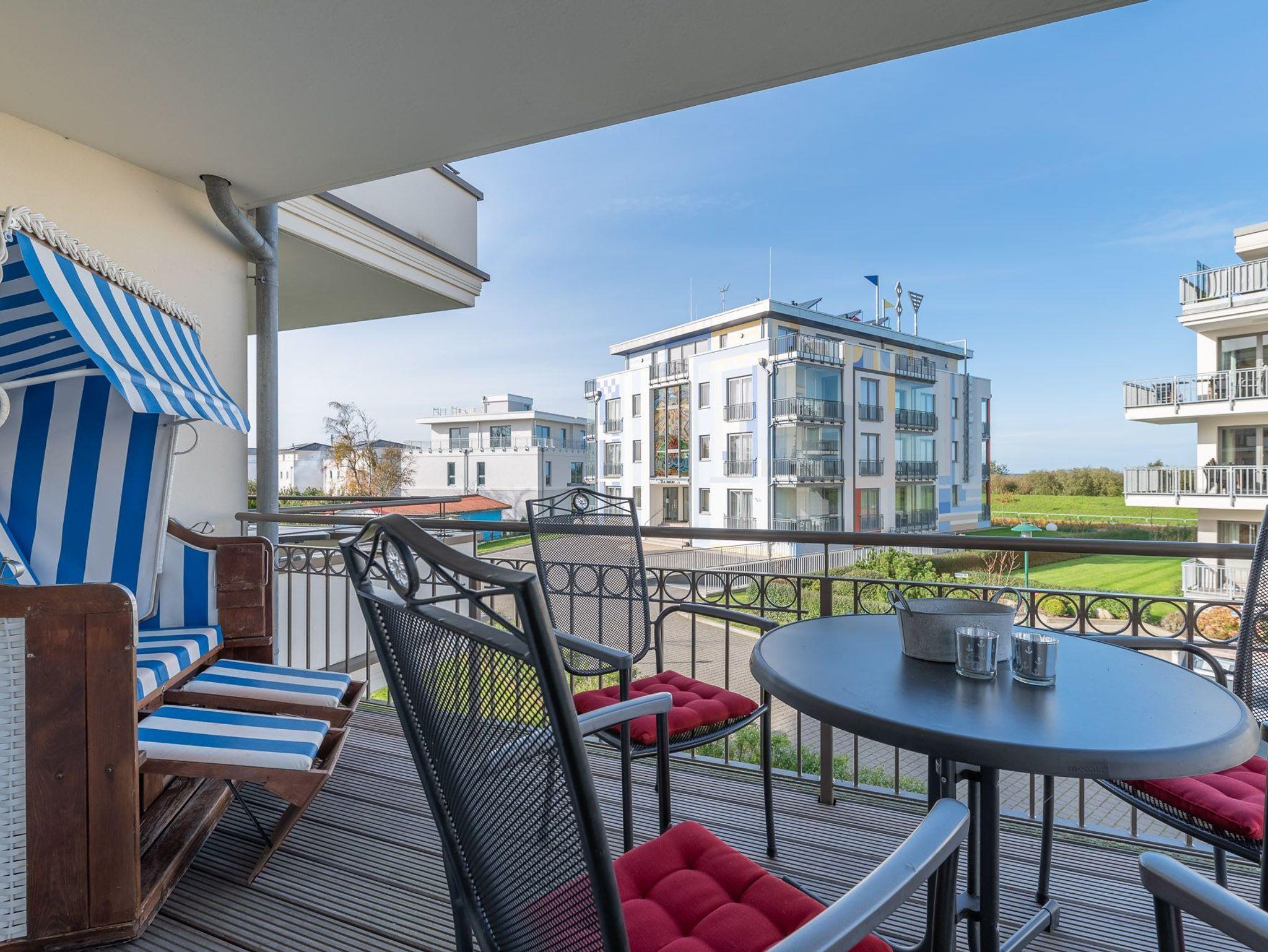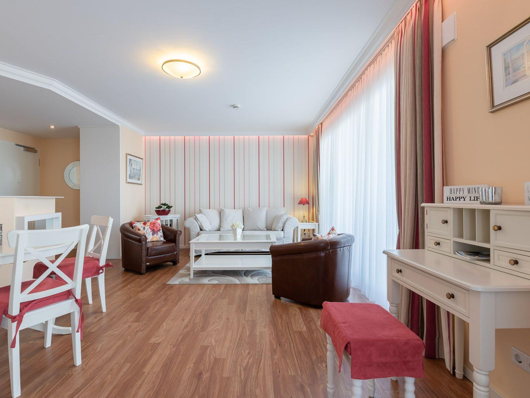 Der Wohnbereich der Ferienwohnung ist modern und zeitlos eingerichtet und verfügt über eine gemütliche Schlafcouch, einen Couchtisch, einen Esstisch mit vier Stühlen sowie einen LED-TV und eine Sound-Anlage. Im Schlafzimmer befinden sich neben einem komfortablen Doppelbett (1,80 x 2,00 m) ein weiterer LED-TV, ein geräumiger Einbauschrank, ein Kinderreisebett, ein Kinderstuhl sowie Bügelbrett und Bügeleisen. Die offen gestaltete, hochwertige Einbauküche lässt keine Wünsche offen. Sie verfügt über Geschirrspüler, Kühlschrank mit Gefrierfach, Kaffeemaschine, Nespresso - Maschine, Wasserkocher, Toaster, ausreichend Geschirr und Besteck, 4-Platten-Herd (Ceran) mit Backofen und eine Mikrowelle. Das Badezimmer verfügt über eine bodengleiche Regenfall-Dusche und einen großen Waschtisch mit Wandspiegel, Radio und Föhn. An Herbst- und Wintertagen sorgt in allen Räumen eine Fußbodenheizung für Wärme und Gemütlichkeit. Auf dem möblierten Balkon in Nord-West-Ausrichtung mit Meerblick lassen sich gemütliche Sonnen- und Abendstunden verbringen.