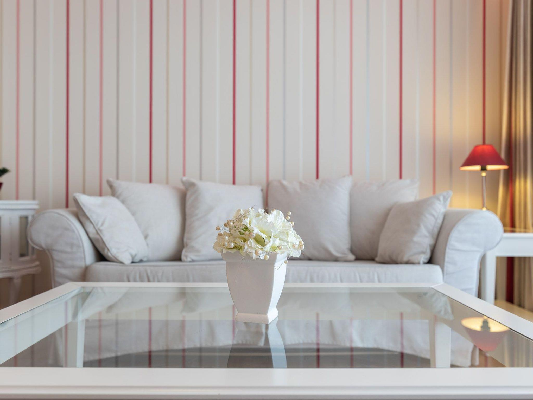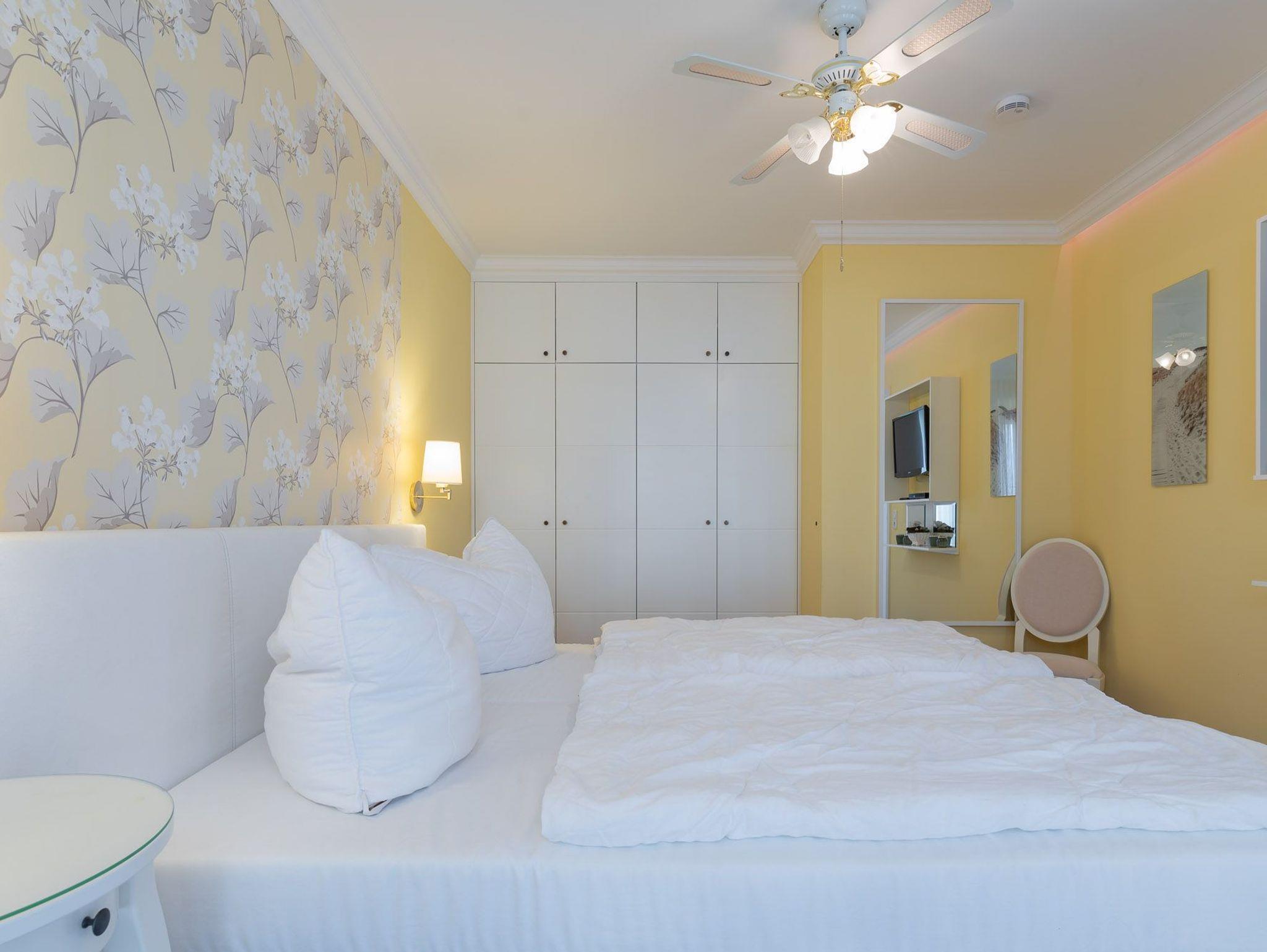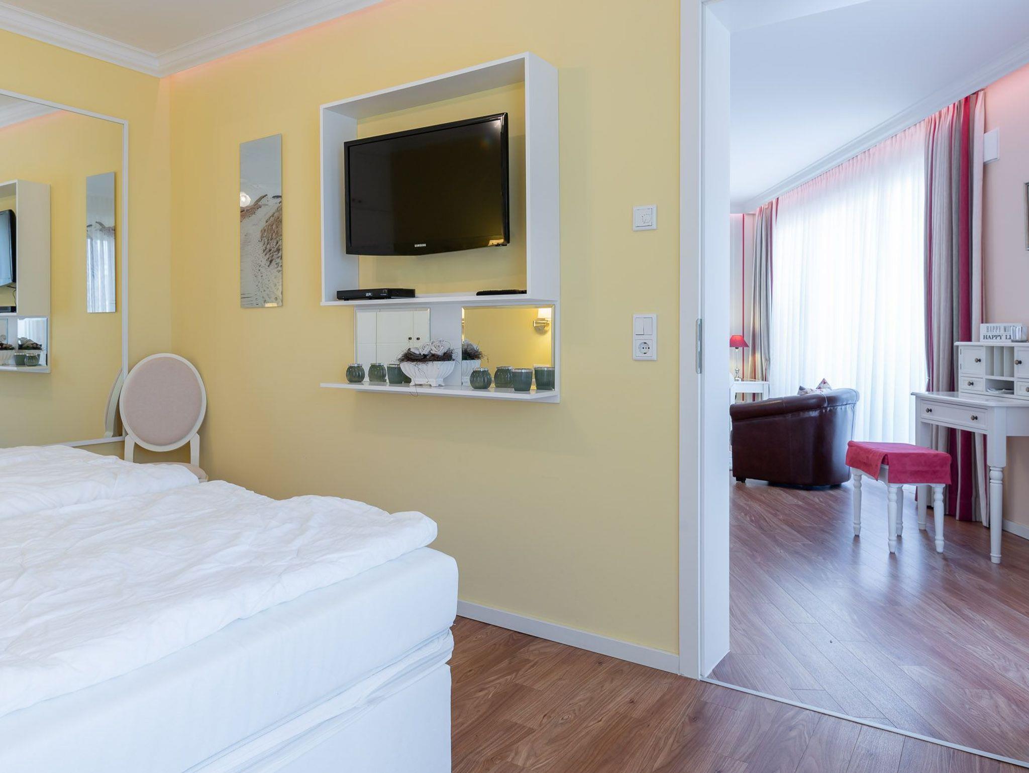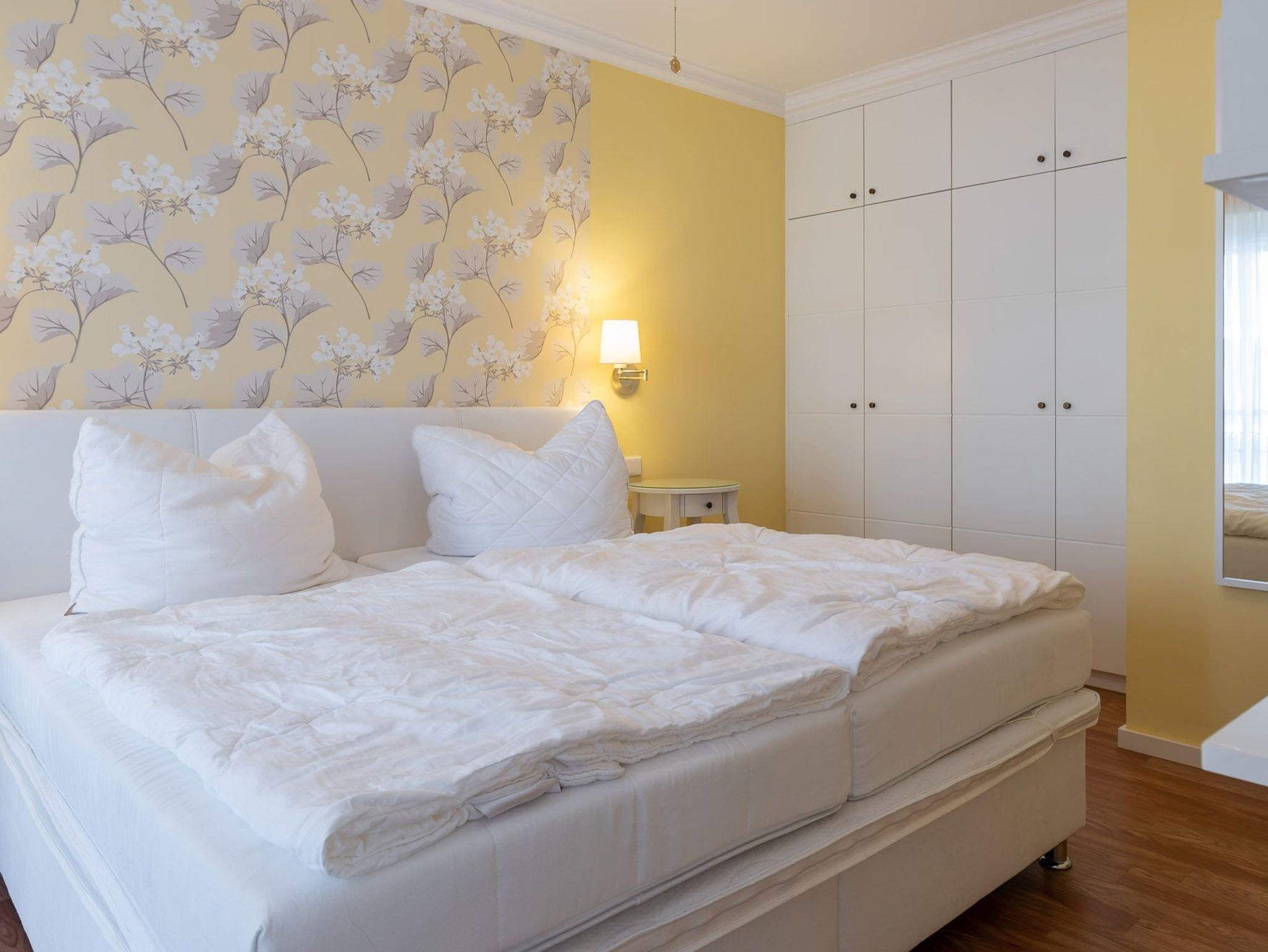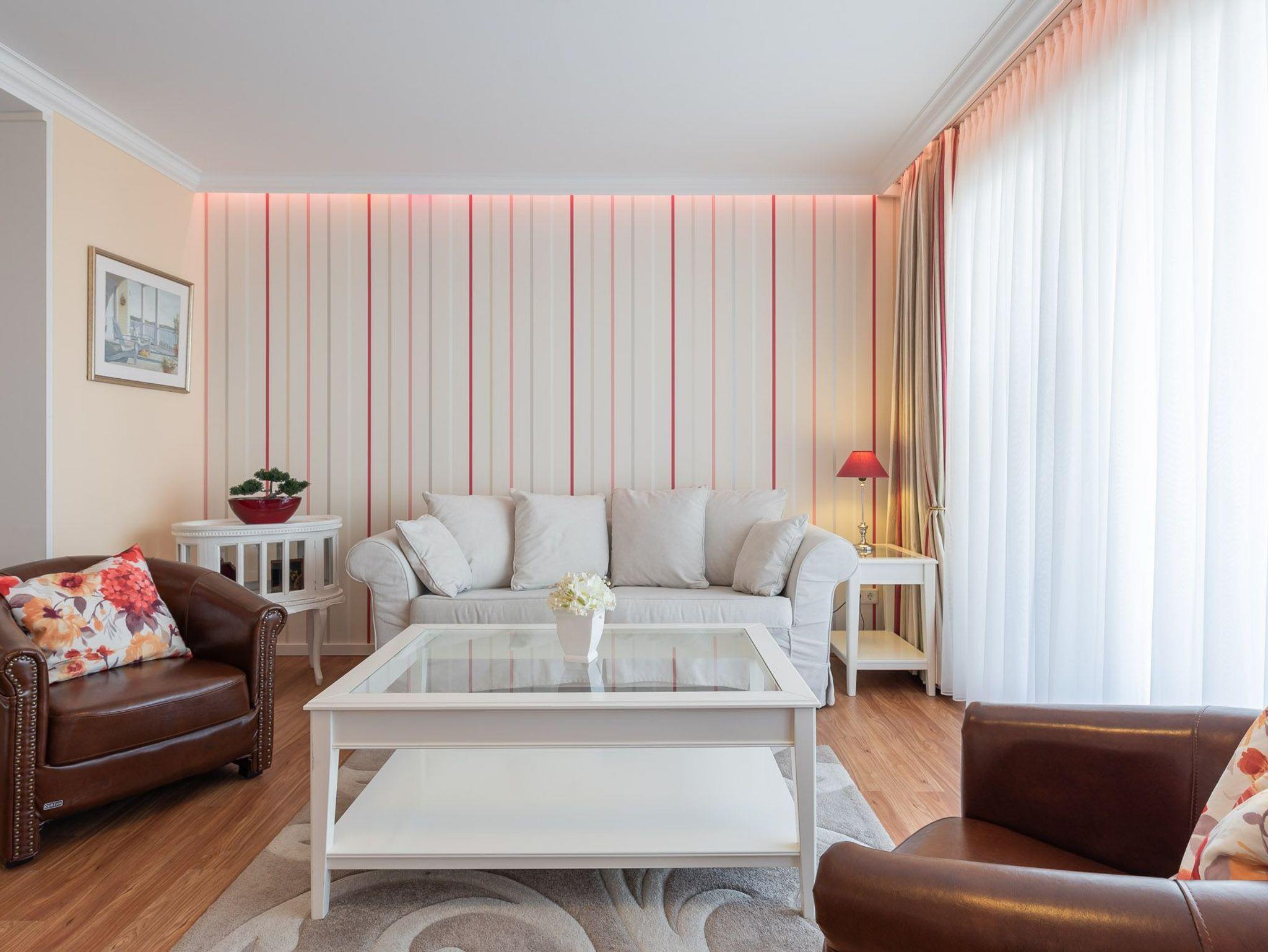Der Wohnbereich der Ferienwohnung ist modern und zeitlos eingerichtet und verfügt über eine gemütliche Schlafcouch, einen Couchtisch, einen Esstisch mit vier Stühlen sowie einen LED-TV und eine Sound-Anlage. Im Schlafzimmer befinden sich neben einem komfortablen Doppelbett (1,80 x 2,00 m) ein weiterer LED-TV, ein geräumiger Einbauschrank, ein Kinderreisebett, ein Kinderstuhl sowie Bügelbrett und Bügeleisen. Die offen gestaltete, hochwertige Einbauküche lässt keine Wünsche offen. Sie verfügt über Geschirrspüler, Kühlschrank mit Gefrierfach, Kaffeemaschine, Nespresso - Maschine, Wasserkocher, Toaster, ausreichend Geschirr und Besteck, 4-Platten-Herd (Ceran) mit Backofen und eine Mikrowelle. Das Badezimmer verfügt über eine bodengleiche Regenfall-Dusche und einen großen Waschtisch mit Wandspiegel, Radio und Föhn. An Herbst- und Wintertagen sorgt in allen Räumen eine Fußbodenheizung für Wärme und Gemütlichkeit. Auf dem möblierten Balkon in Nord-West-Ausrichtung mit Meerblick lassen sich gemütliche Sonnen- und Abendstunden verbringen.