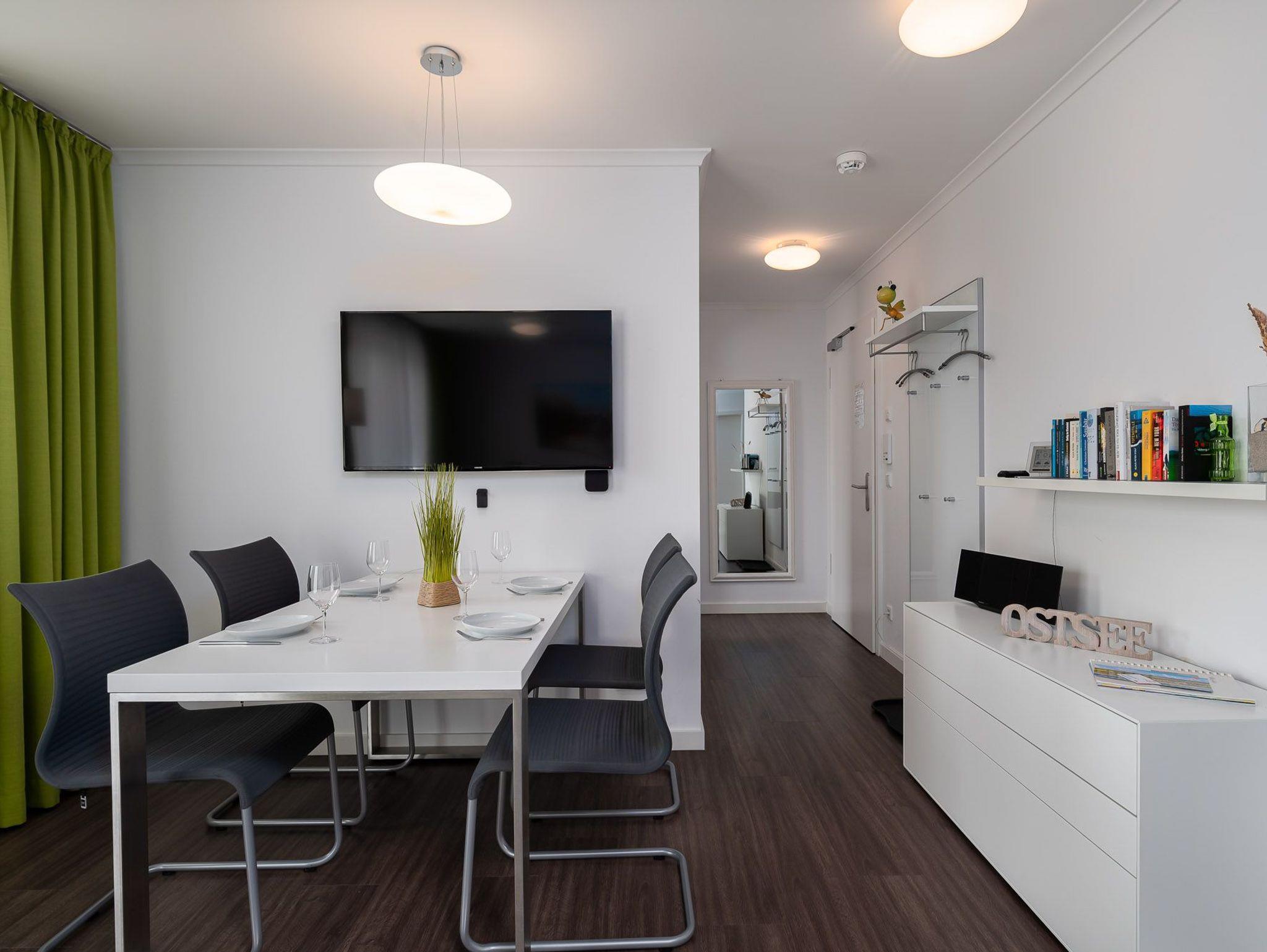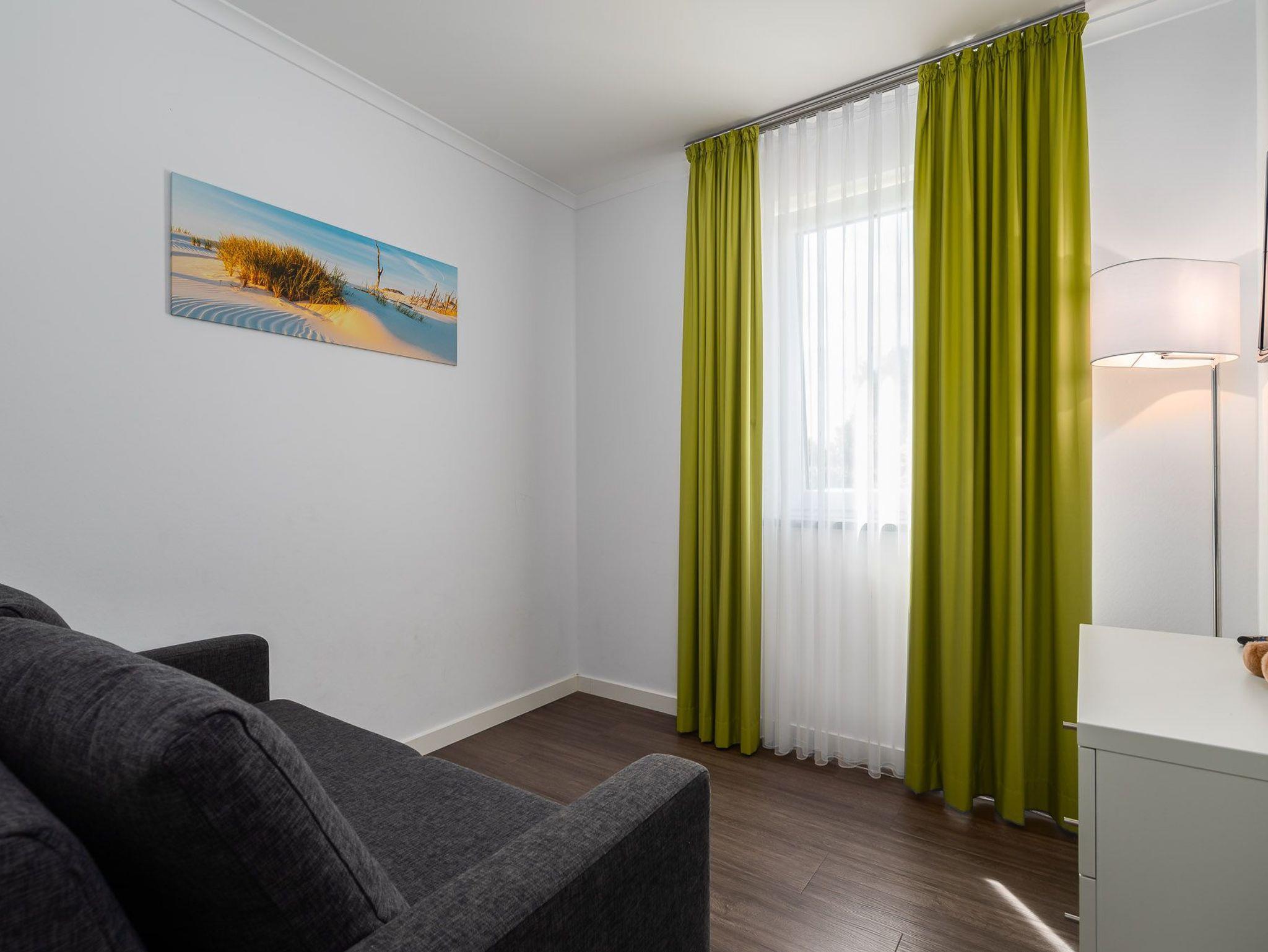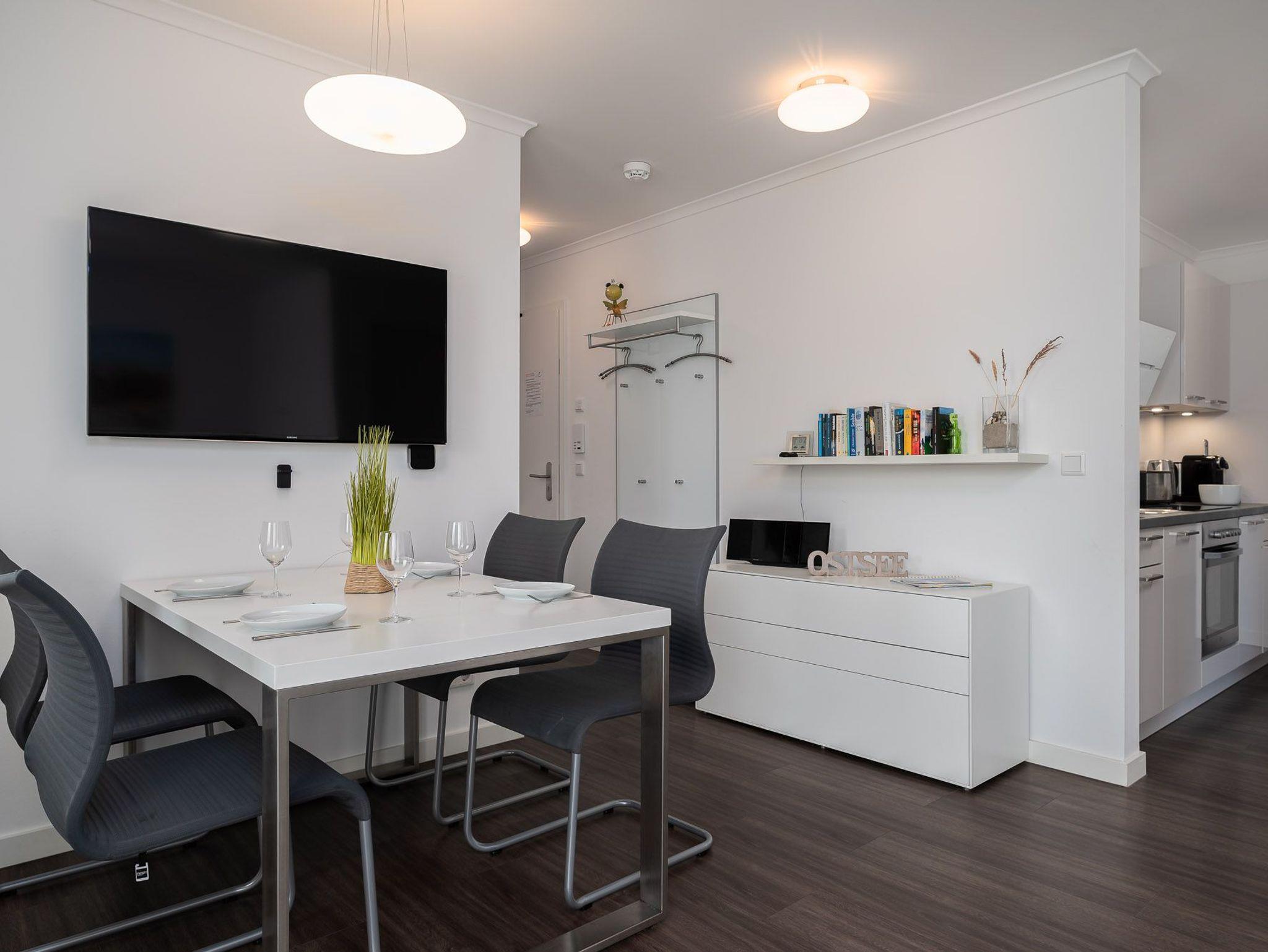 Die liebevoll eingerichtete Wohnung ist bestens ausgestattet. Sogar an Bücher und Spiele wurde gedacht. Der KÜCHENBEREICH verfügt über eine geräumige Kühl- und Gefrierkombination (160 l / 57 l). Eine Nespresso Maschine ist ebenso vorhanden wie ein Milchaufschäumer. Abgerundet wird die Küche neben einem Backofen und leisem Geschirrspüler durch ein Cerankochfeld mit passender Dunstabzugshaube. Zum Essen lädt Sie neben der ansprechenden Möblierung der Terrasse auch der große Esstisch (1,80 m x 1,00 m) im WOHNBEREICH ein. Dieser eignet sich hervorragend, um den Abend im Kreise der Familie mit Gesellschaftsspielen ausklingen zu lassen. Harmonisch abgestimmt wird der Wohnbereich durch eine hochwertige Eck-Couch mit Hocker, so dass alle Urlaubsgäste unserer Ferienwohnung „Schilfgras“ einen gemütlichen Platz finden. Der 50“ Smart TV ist ferner mit Apple TV ausgestattet und bietet die Möglichkeit, Multimedia-Angebote aus dem Internet mittels Ihres Accounts oder iPhone/ iPad zu nutzen. Via Screen Share können Multimedia PC Inhalte auf den TV projiziert werden. Zudem steht Ihnen eine Soundanlage mit CD-Player zur Verfügung, welche Sie auch per Bluetooth mit Ihrem Endgerät verbinden können. Im ERSTEN SCHLAFZIMMER finden Sie ein komfortables Doppelbett (180 cm x 200 cm/ zwei 7-Zonen-Matratzen) mit integrierten Leselampen sowie einen geräumigen viertürigen Kleiderschrank. Auch hier steht Ihnen ein 50“ Smart-TV zur Verfügung. Das ZWEITE SCHLAFZIMMER ist mit Bedacht auf die jüngeren Familienmitglieder mit einer hochwertigen Schlafcouch (integrierter Matratze 150 cm x 200 cm inkl. Lattenrost) so eingerichtet, dass auch hier die Möglichkeit besteht, genügend Platz zum Spielen und Chillen zu finden. Im Siteboard ist zusätzlicher Stauraum vorhanden. Des Weiteren ist hier ebenfalls ein 32“ Smart-TV vorhanden. Das BAD MIT FENSTER ist mit einer ebenerdigen Regenwalddusche, einem beleuchten großen Wandspiegel und Waschtisch ausgestattet. Weiterhin gibt es eine ABSTELLKAMMER. Die Wohnung verfügt über eine Fußbodenheizung sowie eine kontrollierte Wohnraumlüftung. Zur Ferienwohnung „Schilfgras“ gehören Fahrradständer direkt vor dem Haus und ein KOSTENFREIER PKW-AUSSENSTELLPLATZ. HINWEISE: Das kostenfreie WLAN in der Unterkunft ist ausschließlich für die Verwendung von Social Media und den Austausch von Bildern mit Familie und Freunden gedacht. Die Nutzung zum Streamen von Filmen ist nicht vorgesehen. Die Wohnung ist eine Nichtraucherwohnung. Es sind KEINE HAUSTIERE erlaubt. Wäscheset, Kinderreisebett und Kinderhochstuhl können kostenpflichtig zugebucht werden. Sichern Sie sich einen der begehrten STRANDKÖRBE (Anfang Mai-Ende August) und buchen Sie jetzt zu besonderen Konditionen (12,00 € pro Tag oder 75,00 € pro Woche).