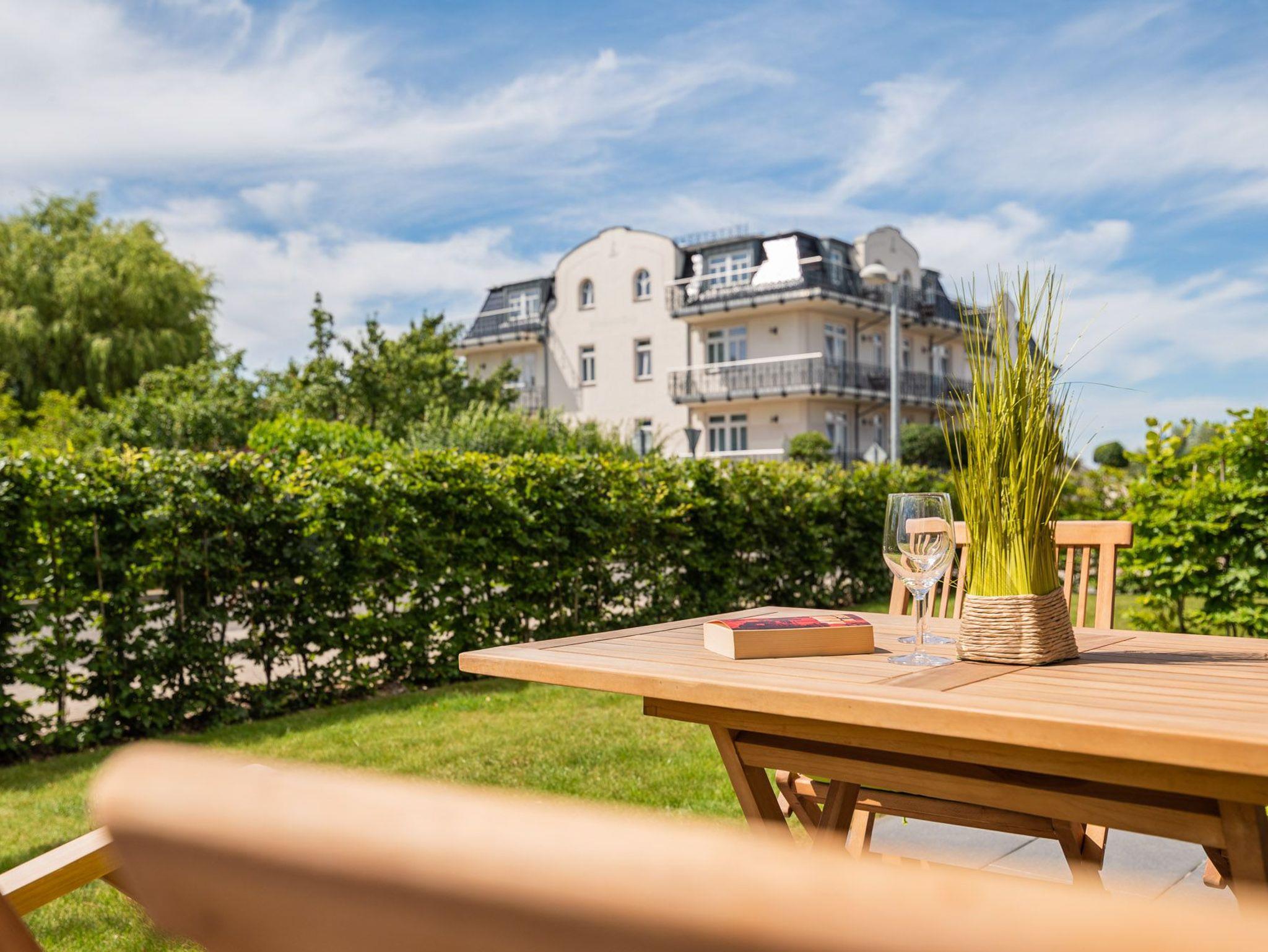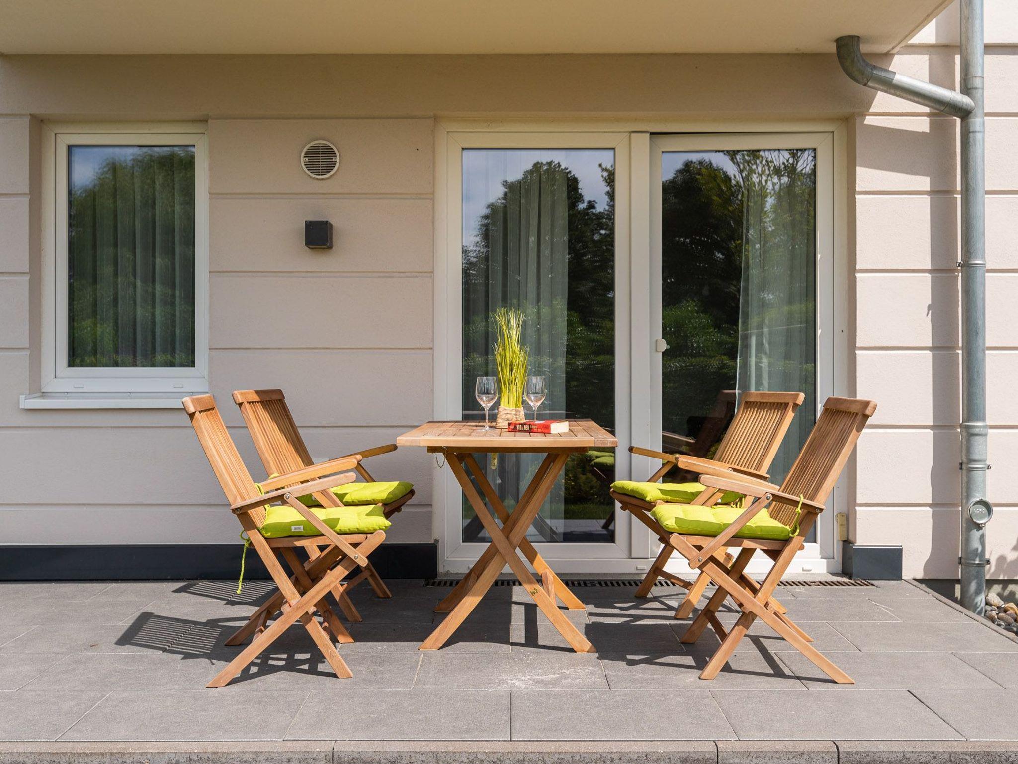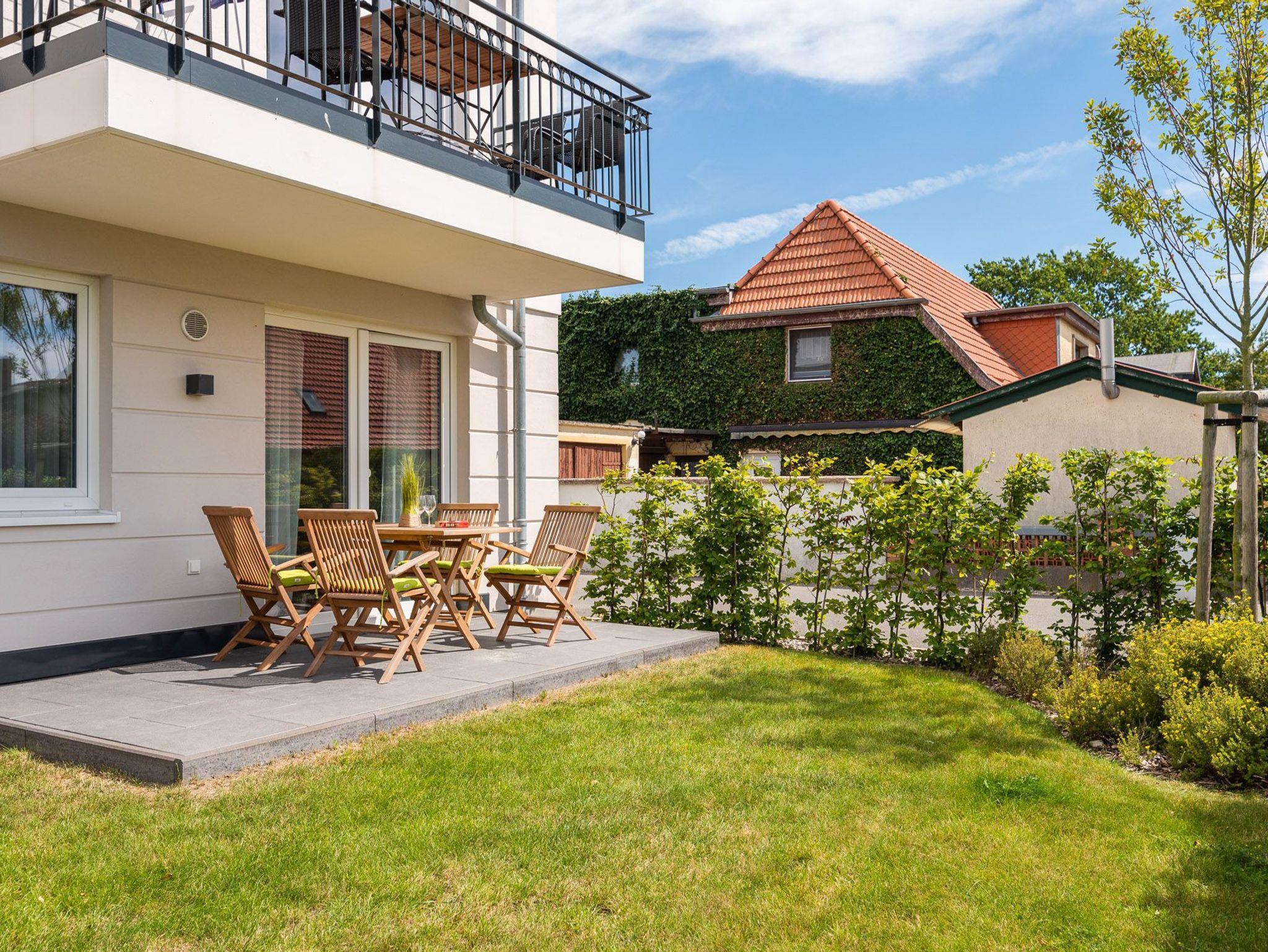 Die im Erdgeschoss gelegene Wohnung befindet sich in Strandnähe (100 m) und besitzt eine nach Südwesten ausgerichtete Terrasse mit Sonne bis spät am Abend. Auf dem Sitzbereich mit angrenzender großer Rasenfläche stehen moderne Gartenmöbel zum Essen und Relaxen für 4 Personen zur Verfügung.