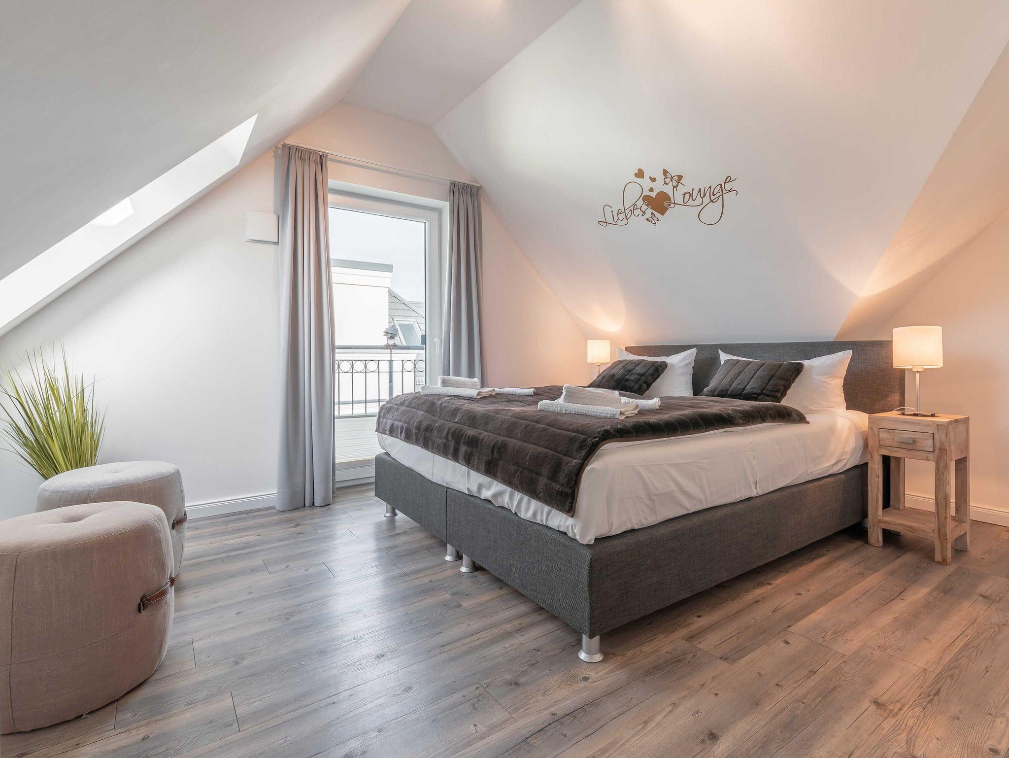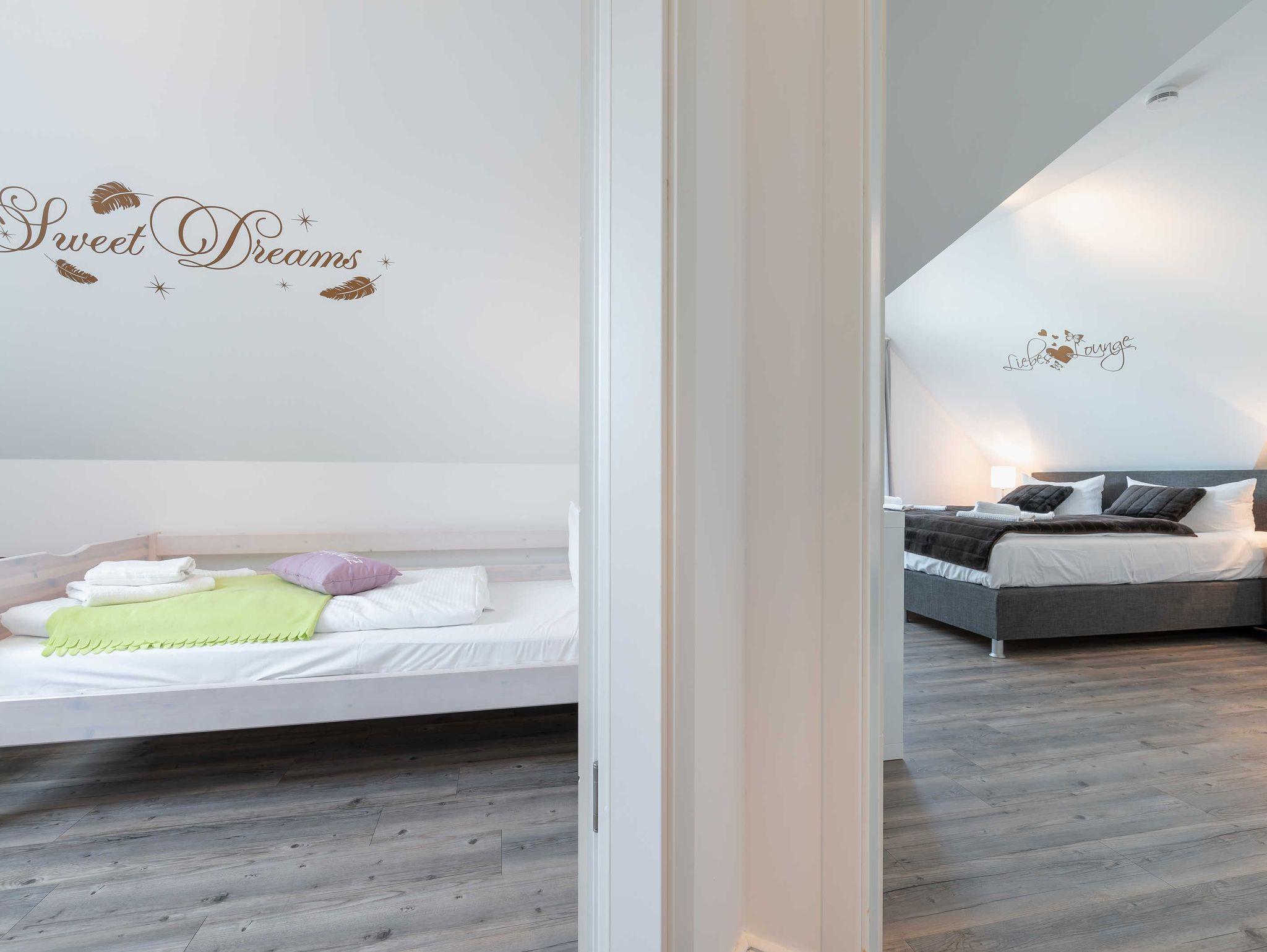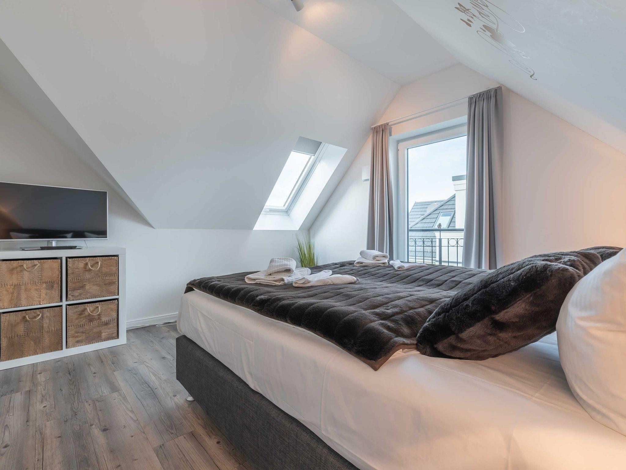 Die modern und großzügig eingerichtete sonnige 3-Zimmer-Wohnung befindet sich im Dachgeschoss der Residenz Seestern. Im Wohnraum finden Sie eine zweiteilige hochwertige Couchgarnitur zum Relaxen. Zur Unterhaltung stehen Ihnen ein großer Flachbild TV, eine Hifi Anlage bluetoothfähig, einem BluRay-Player sowie DVD´s, CD´s und eine Spielesammlung zur Verfügung. Der offene Essbereich verfügt über einen großen Tisch mit vier Stühlen. Die separate großzügige Küche ist mit einer modernen Einbauküche mit Geschirrspüler, Kühlschrank mit Gefrierfach, Backofen mit Cerankochfeld und Mikrowelle ausgestattet. Neben Kaffeemaschine, Wasserkocher und Toaster ist auch eine Tchibo - Cafissimo Kapselmaschine vorhanden. Das modern eingerichtete Schlafzimmer mit dem großzügigen Boxspringbett (2,00 m x 1,80 m) verfügt ebenso über einen große Flachbild TV, einen geräumigen Schrank und eine Kommode. Sie haben direkten Zugang zum großzügigen Duschbad. Im zweiten Schlafzimmer stehen zwei Einzelbetten (2,00 m x 0,90 m) sowie ein kleiner Schrank. Das zweite Duschbad ist vom Flur aus zu betreten. Beide Duschbäder haben eine bodengleiche Dusche und einen großen Waschtisch mit Spiegel. Es gibt außerdem eine große Abstellkammer für Koffer und Taschen. Der große Süd-Balkon lädt zum Verweilen ein. Es erwartet Sie ein großer Esstisch mit vier Stühlen und Lounge-Möbeln zum Relaxen. Von beiden Balkonen können Sie den weiten Blick auf das Meer genießen.