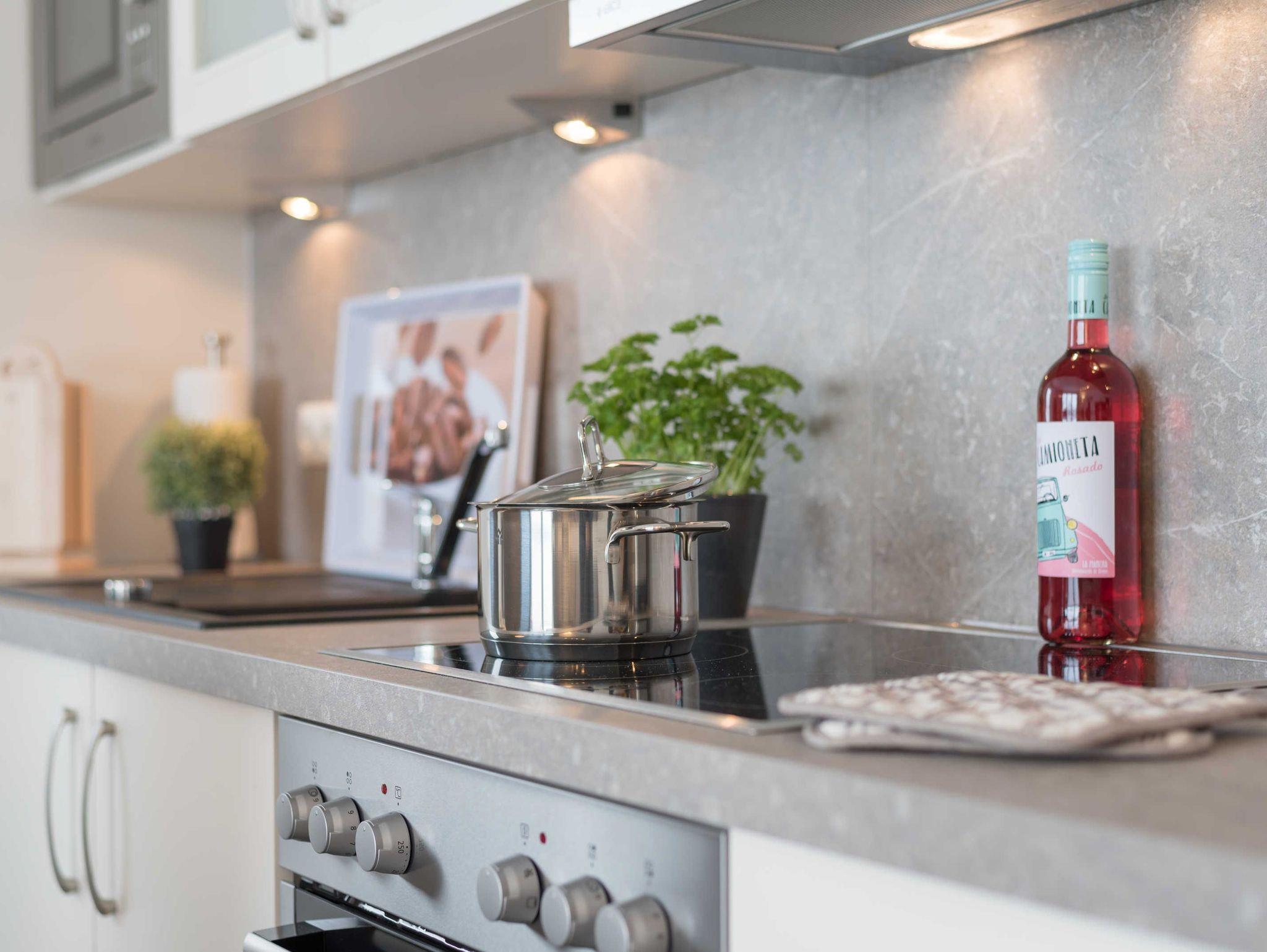 Die hochwertige, moderne Einbauküche verfügt über einen Geschirrspüler, einen Kühl- und Gefrierschrank, einen Backofen, ein Cerankochfeld, eine Mikrowelle, einen Toaster, eine Kaffeemaschine und einen Wasserkocher. Eine Geschirr-, Koch- und Zubehörausstattung - vom Mixer bis zum Eierbecher - ist vorhanden.