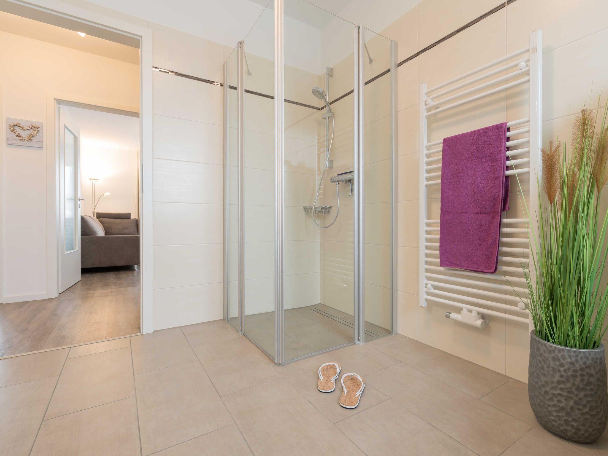 Das helle Badezimmer mit Fenster und bodengleicher Dusche besticht mit einem Waschtisch inklusive großem Spiegel, einen Waschtischunterschrank, einem Haartrockner und einem Handtuchheizkörper. Eine Waschmaschine steht ebenso zur Verfügung. Zudem befinden sich Bügelbrett und Bügeleisen im Abstellraum der Wohnung. So können Sie den Heimweg bereits mit schrankfertiger Wäsche antreten.