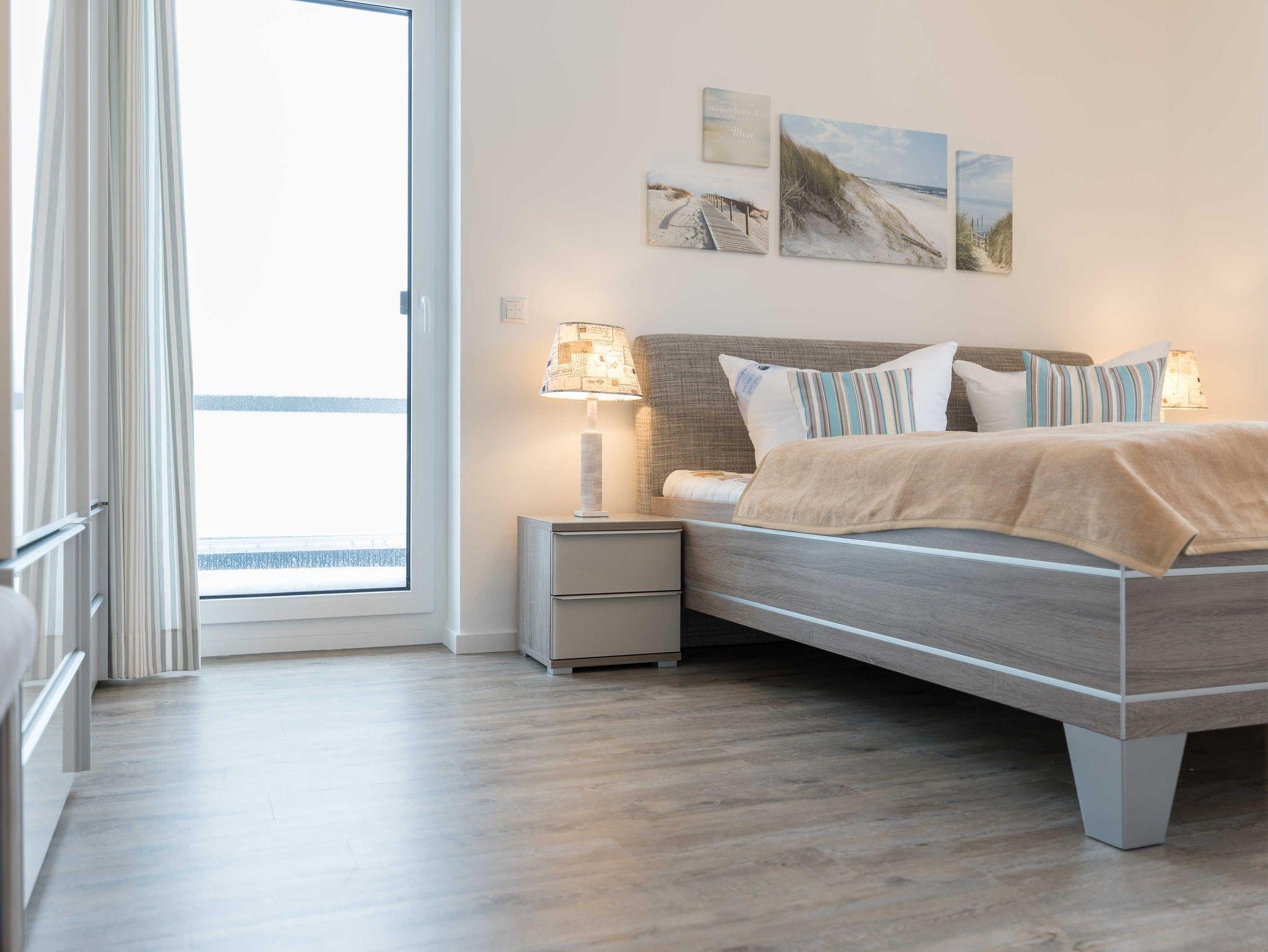 Die Ferienwohnung verfügt über zwei separate Schlafräume. Im Schlafzimmer mit Zugang zur Dachterrasse befindet sich ein großzügiges Doppelbett mit zwei einzelnen Matratzen (je 0,90 x 2,00 m) und ein geräumiger Kleiderschrank. Im zweiten Schlafzimmer erwarten Sie zwei Einzelbetten (je 1,00 x 2,00 m), ein TV mit Blu-Ray-Player und ein weiterer Kleiderschrank. Alle Terrassen- und Fensterelemente verfügen über Rollläden mit Motoren, welche neben dem sommerlichen Sonnenschutz gerade für Kleinkinder und Babys für hohen Schlafkomfort sorgen.