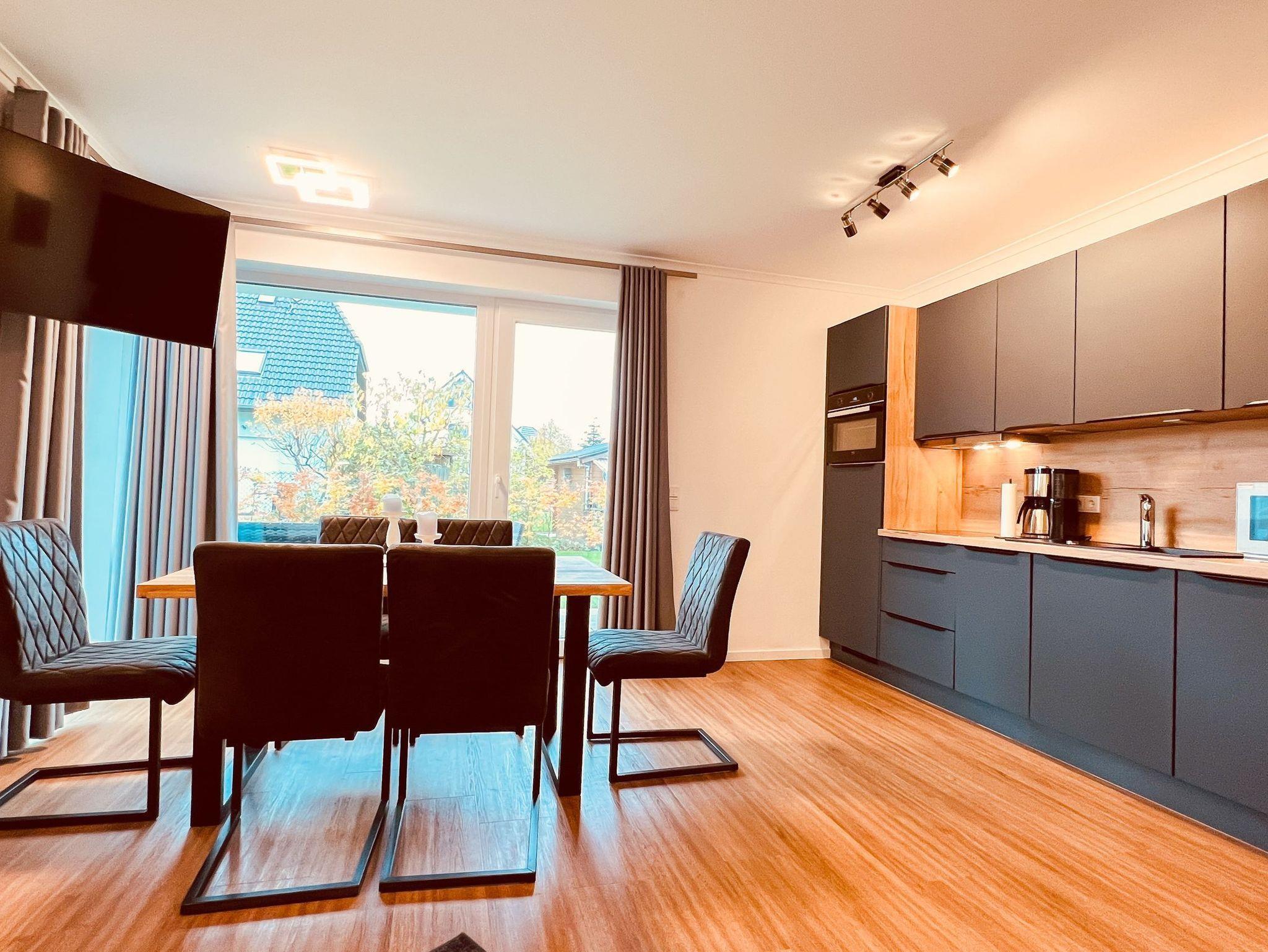 Über den Eingangsbereich gelangen Sie in den offenen Wohn- und Essbereich. Die moderne Einbauküche ist mit allen wichtigen Dingen ausgestattet: Geschirrspüler, Backofen, Mikrowelle, Kühlschrank, Toaster, Wasserkocher und Kaffeemaschine. Eine Geschirr-, Koch- und Zubehörausstattung ist natürlich ebenfalls vorhanden. Der Essbereich umfasst 6 bequeme Sitzplätze und lädt neben dem Essen zum längeren Verweilen ein. Das lichtdurchflutete Wohnzimmer mit bodentiefen Fenstern bietet ausreichend Platz und verfügt über eine bequeme Couch, auf welcher es sich wunderbar entspannen lässt. Ein ruhiger Platz zum Lesen sowie ein TV runden die Entschleunigung im Urlaub ab.