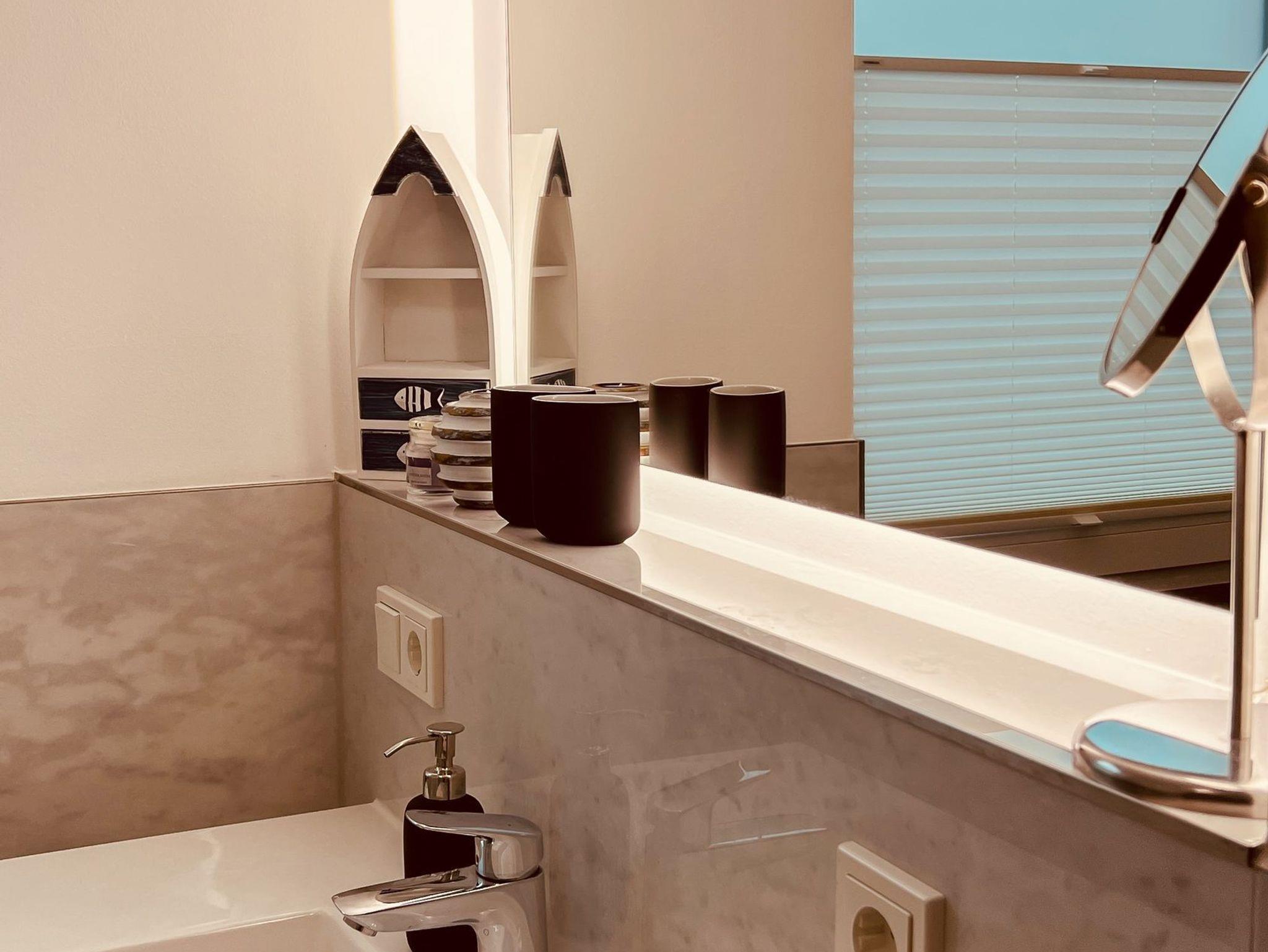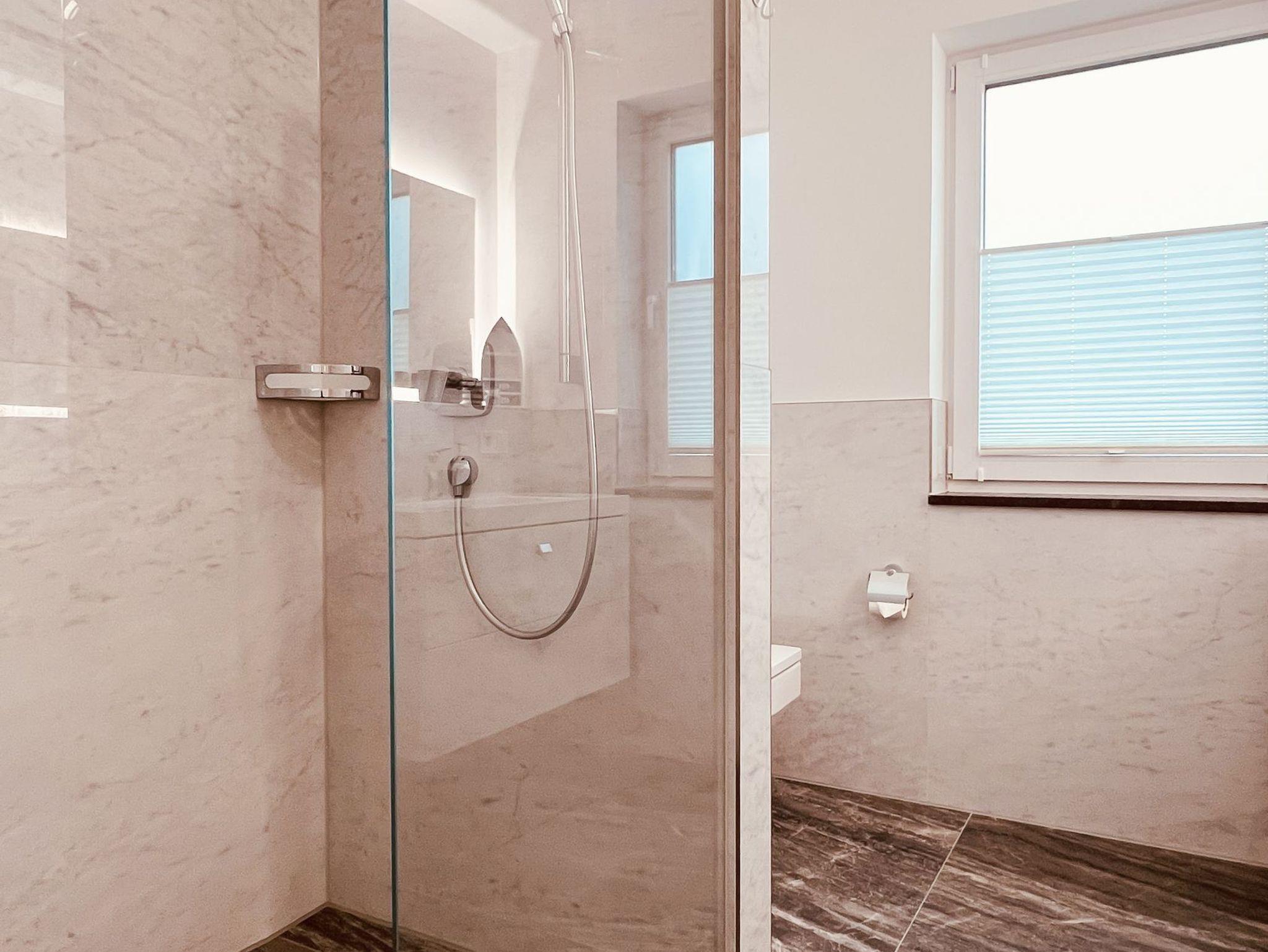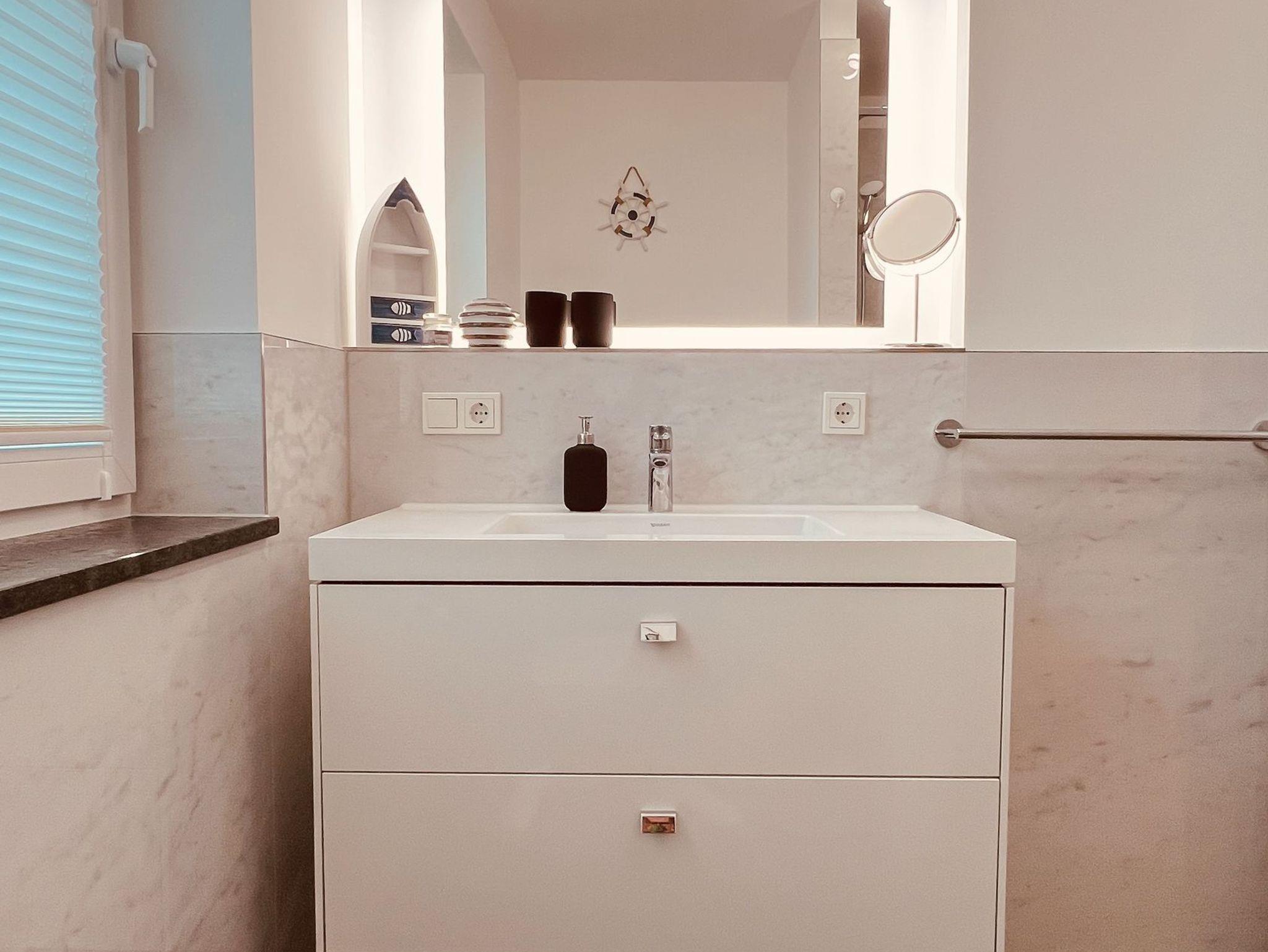 Das helle Badezimmer ist ausgestattet mit einer ebenerdigen Dusche, einem Waschtisch inklusive großem Spiegel sowie einem Haartrockner.