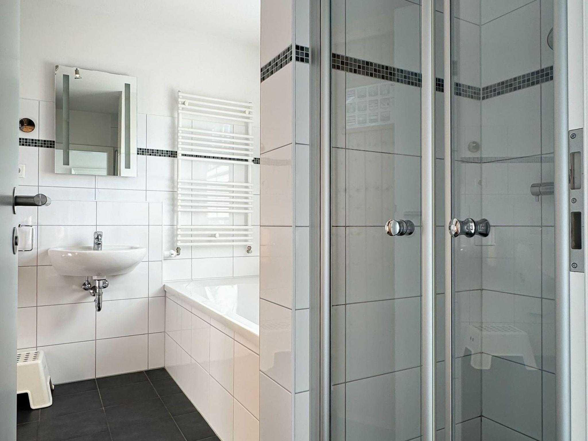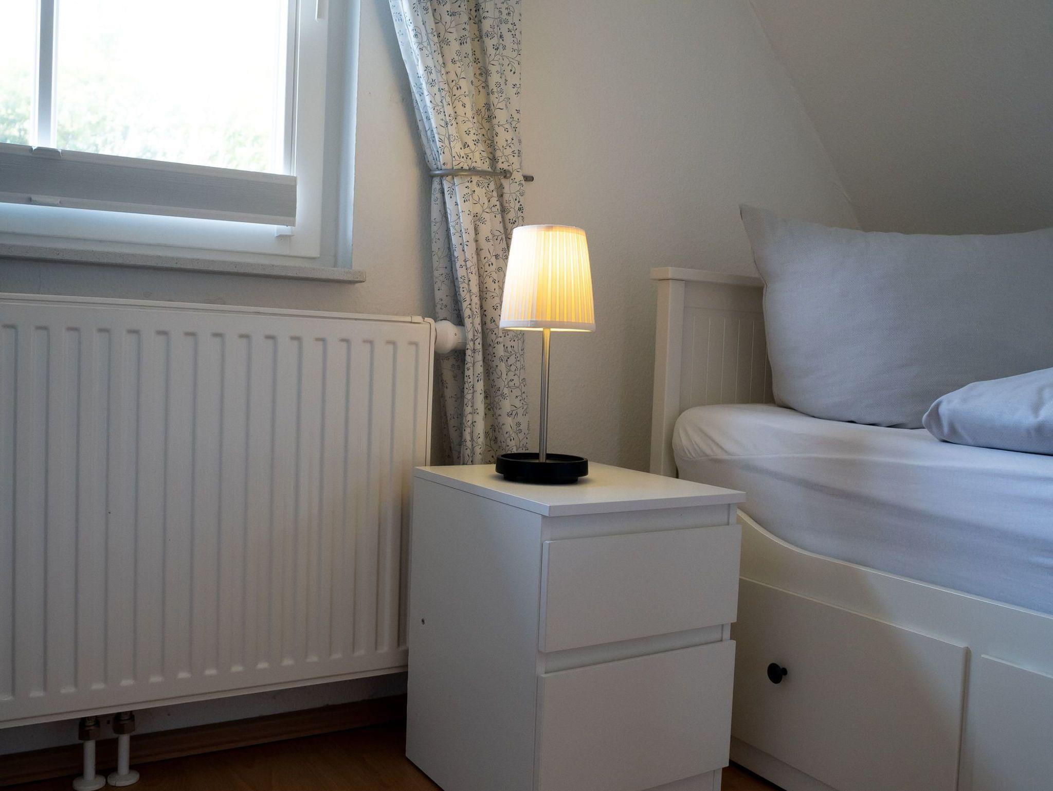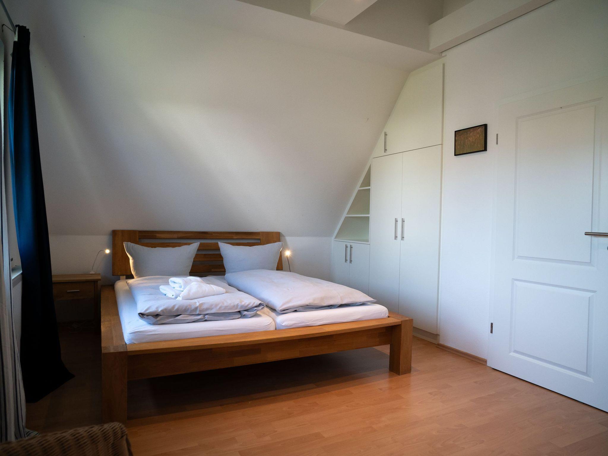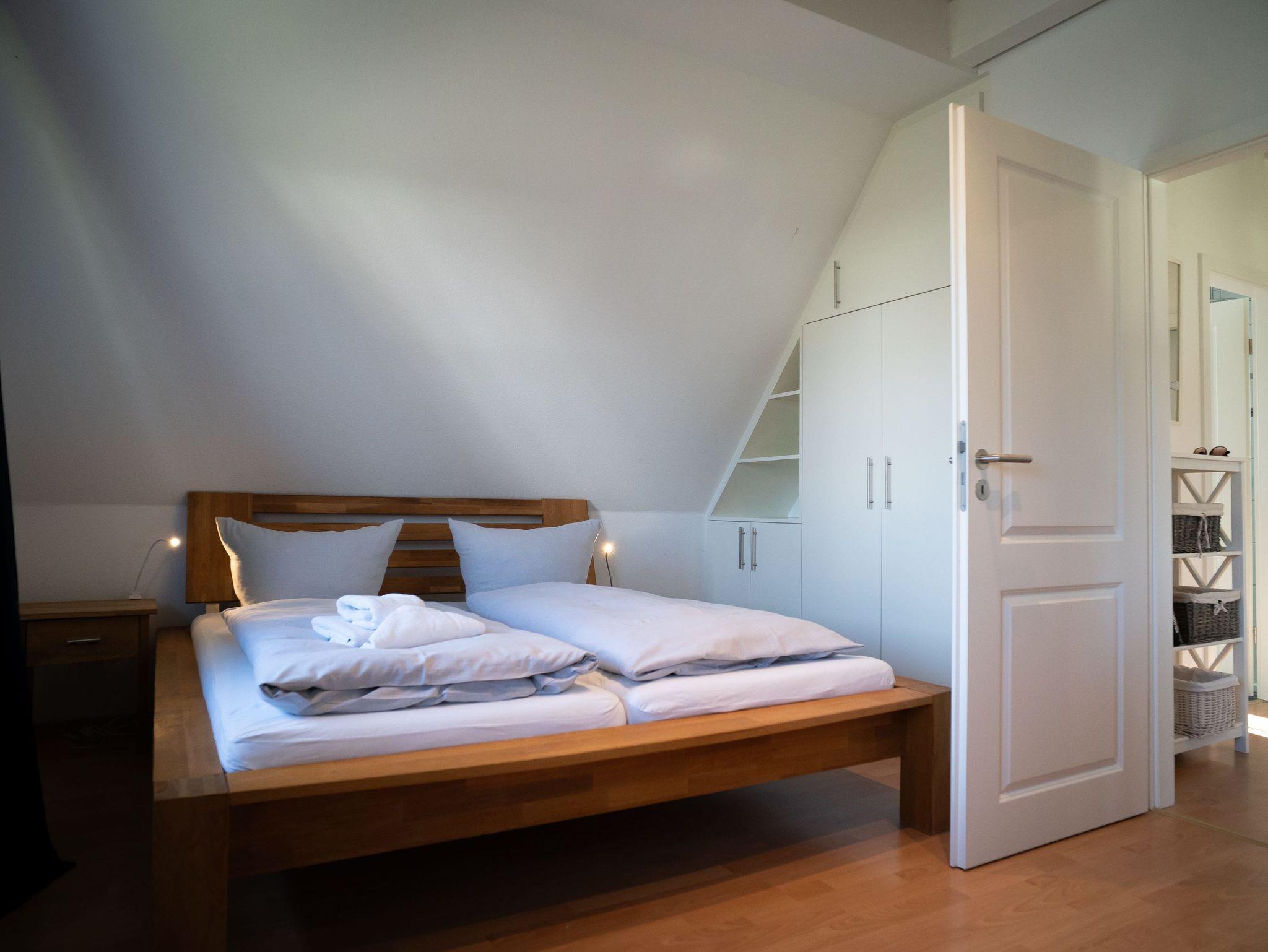In das Obergeschoss des Hauses gelangen Sie über eine Treppe vom Wohnbereich aus. Dort befinden sich die gemütlichen Schlafzimmer. Das erste Zimmer ist mit zwei Einzelbetten, ein weiteres Schlafzimmer mit einem Doppelbett ausgestattet. Im dritten Schlafzimmer befindet sich neben dem Einzelbett ein Auszieh-Rollbett für zwei weitere Personen. Ein weiteres Duschbad befindet sich in der oberen Etage. Für unsere kleinen Gäste stehen ein Kinderreisebett und ein Kinderhochstuhl bereit.