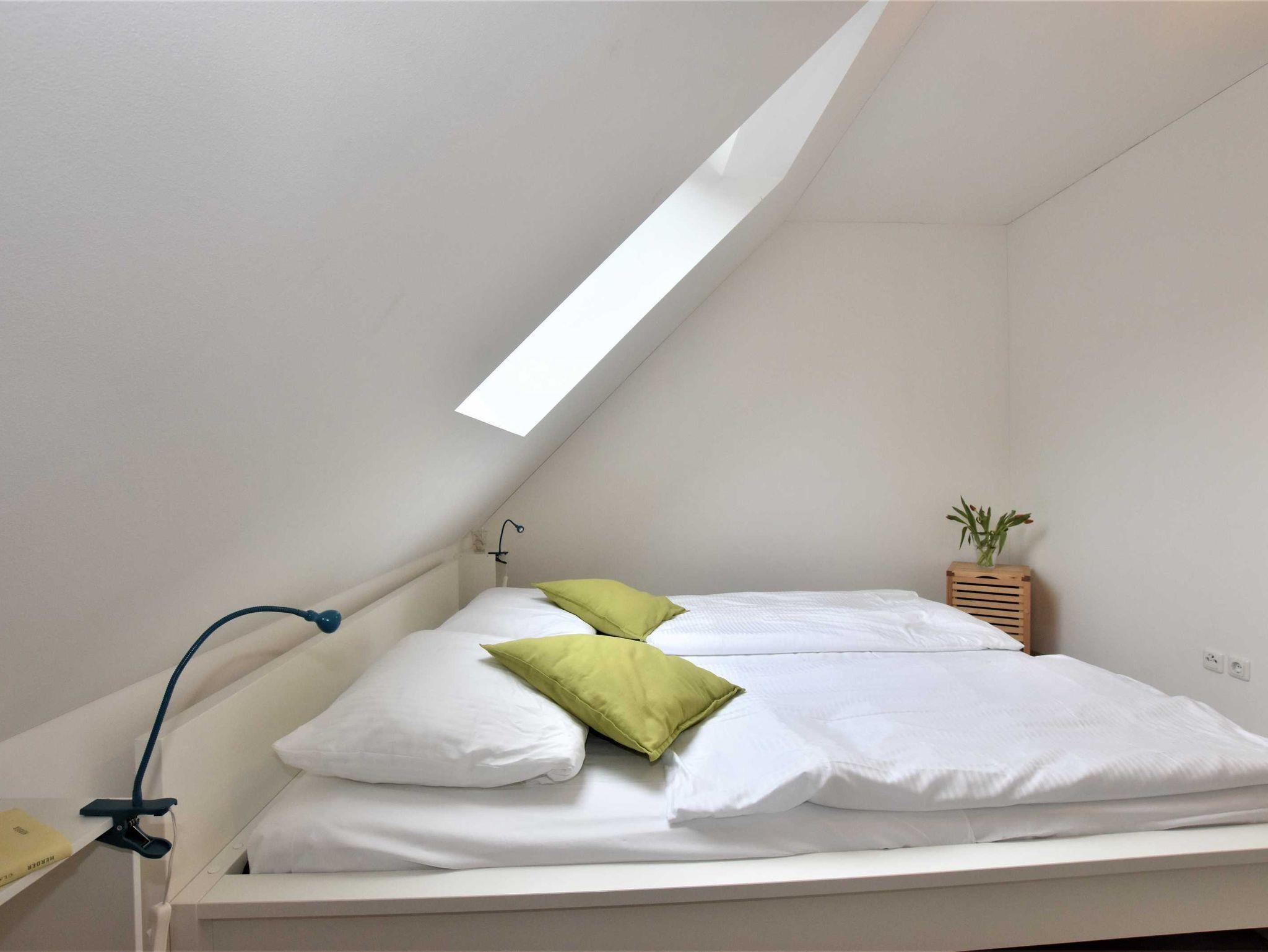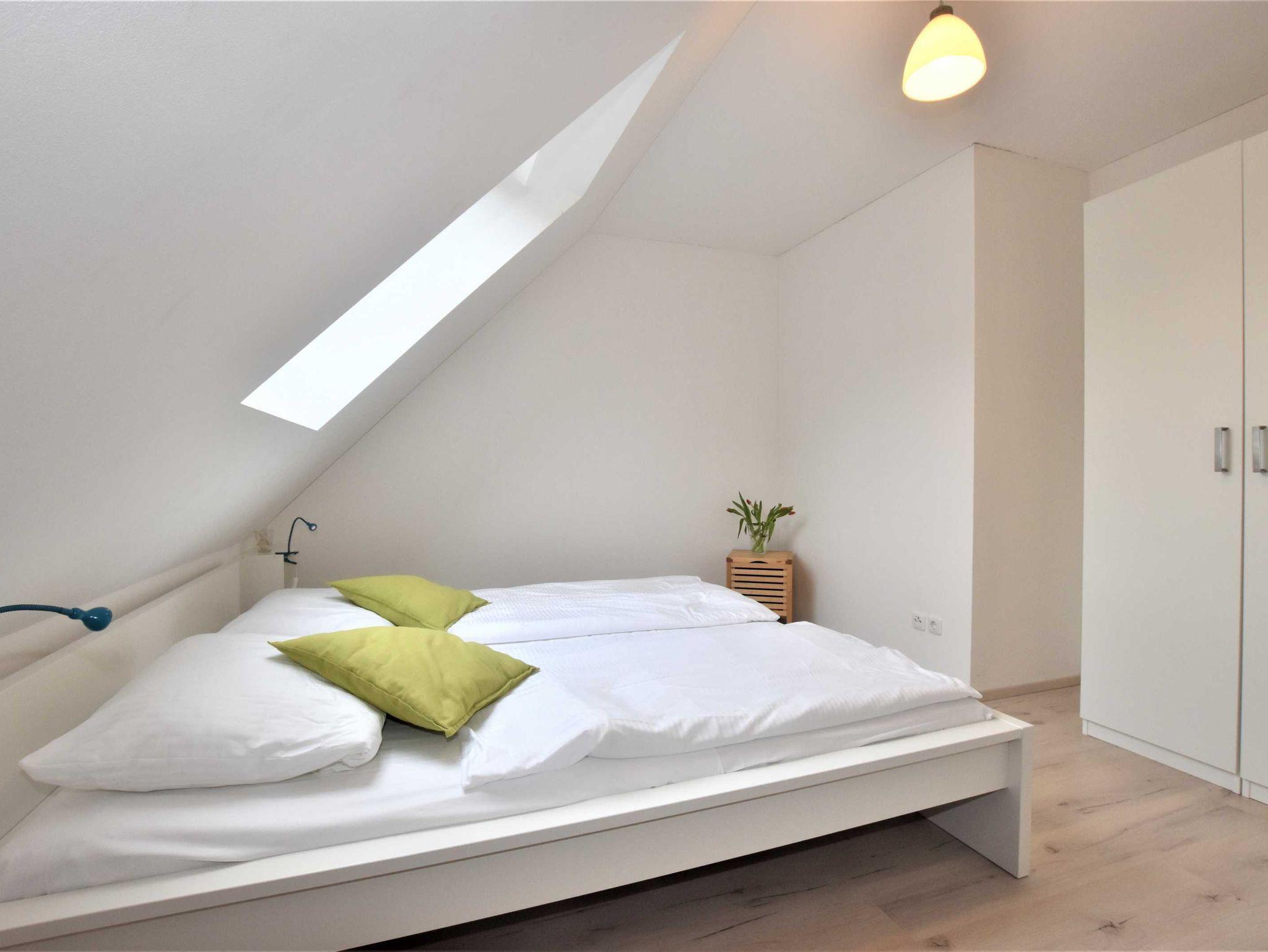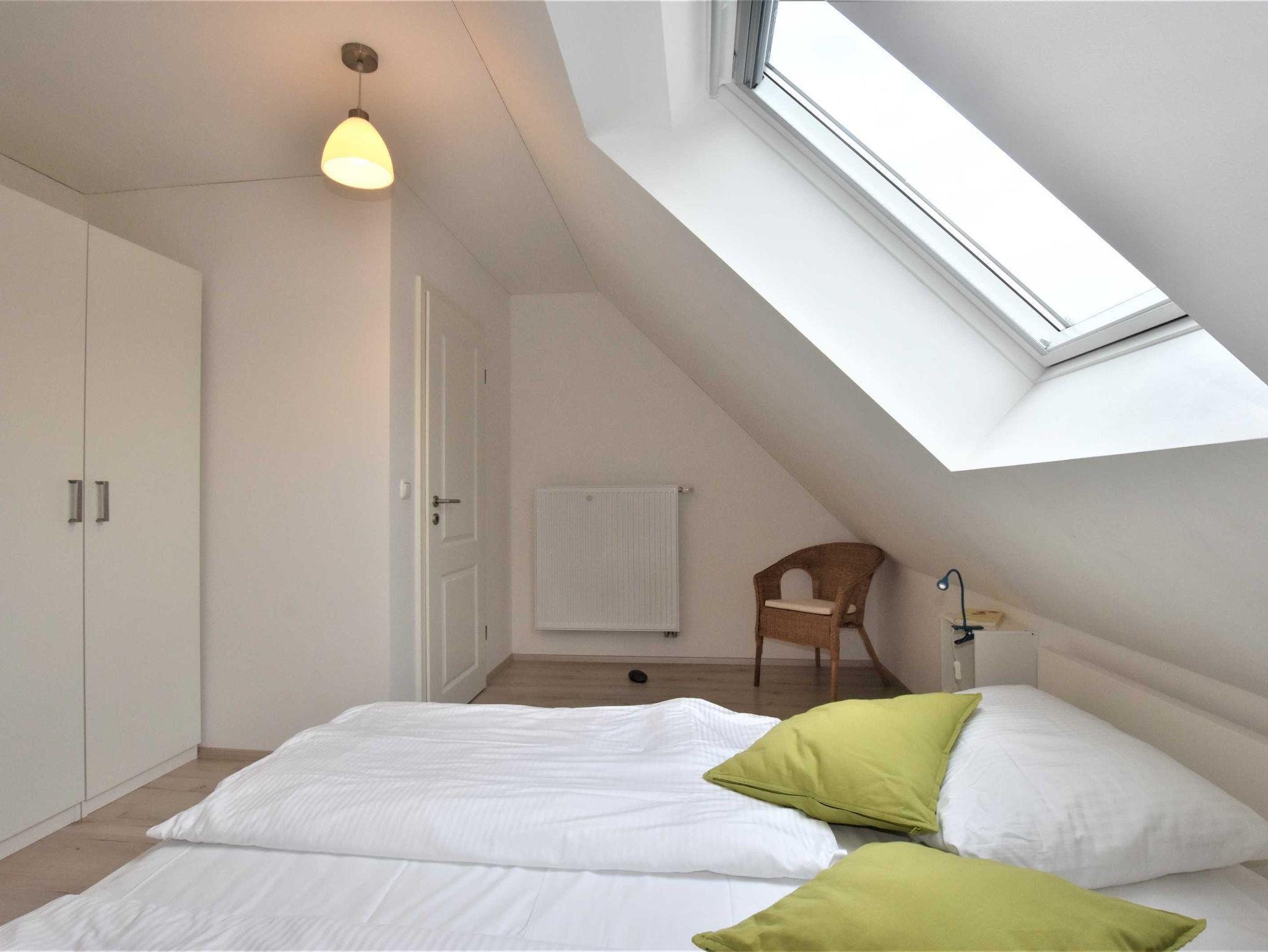 Im oberen Bereich des Ferienhauses: In das Obergeschoss gelangt man je über einen hellen und freundlichen Treppenbereich. Hier befinden sich insgesamt vier separate Schlafzimmer. Diese sind je mit einem Doppelbett (1,80 x 2 m) und ausreichend Stauraum im Kleiderschrank ausgestattet. Zwei Schlafzimmer verfügen außerdem über ein zusätzliches TV- Gerät.