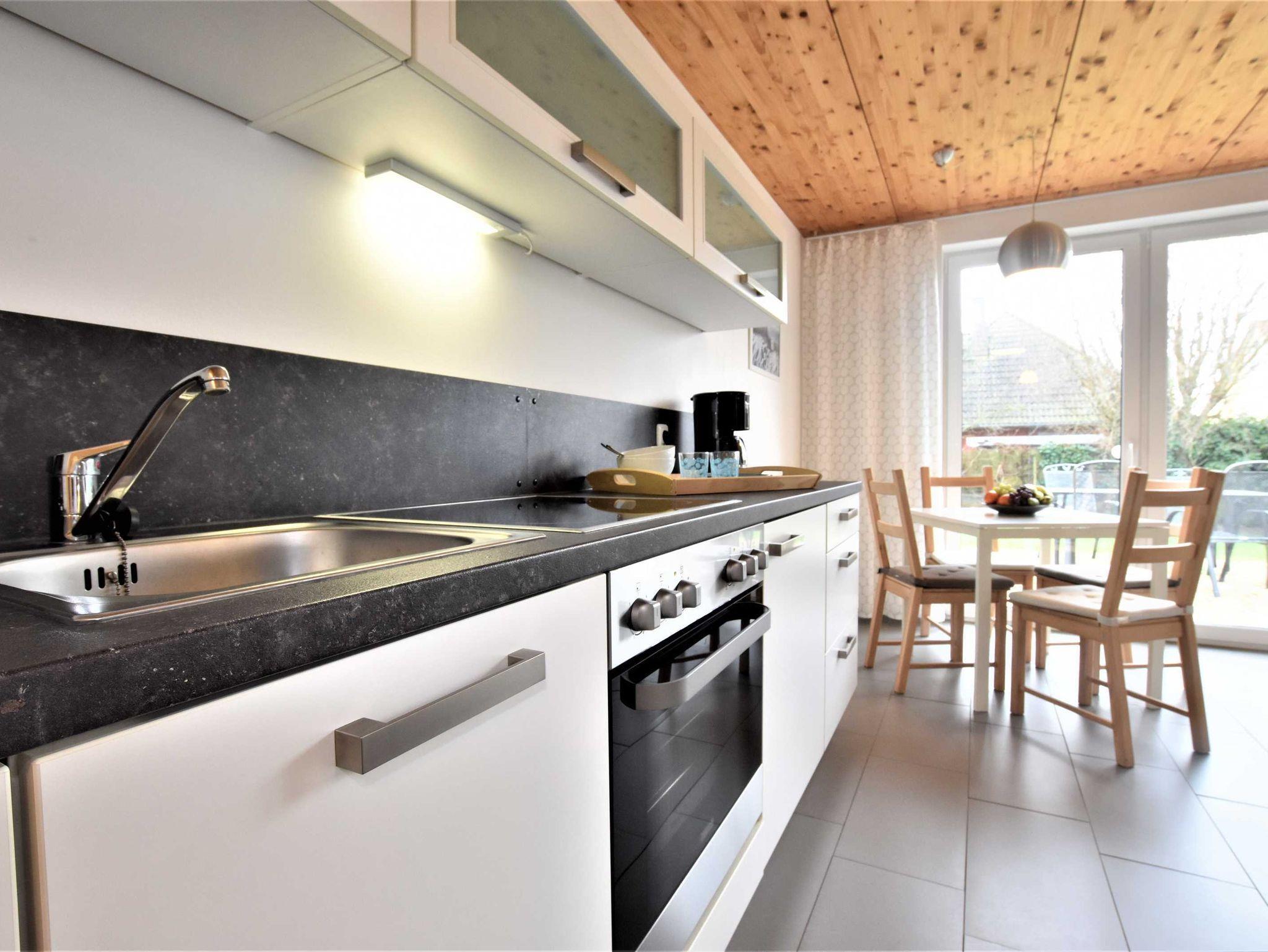 Im unteren Bereich des Ferienhauses: zwei großzügige Wohn- Essbereiche mit einer umfangreich ausgestatteten Küche (4- Plattenherd, Backofen, Kaffeemaschine, Wasserkocher, Kühlschrank, Geschirrspüler, Toaster), Esstisch und gemütliche Sofaecke mit TV (inkl. Radio und USB- Anschluss). Zwei Bäder mit Dusche und WC.