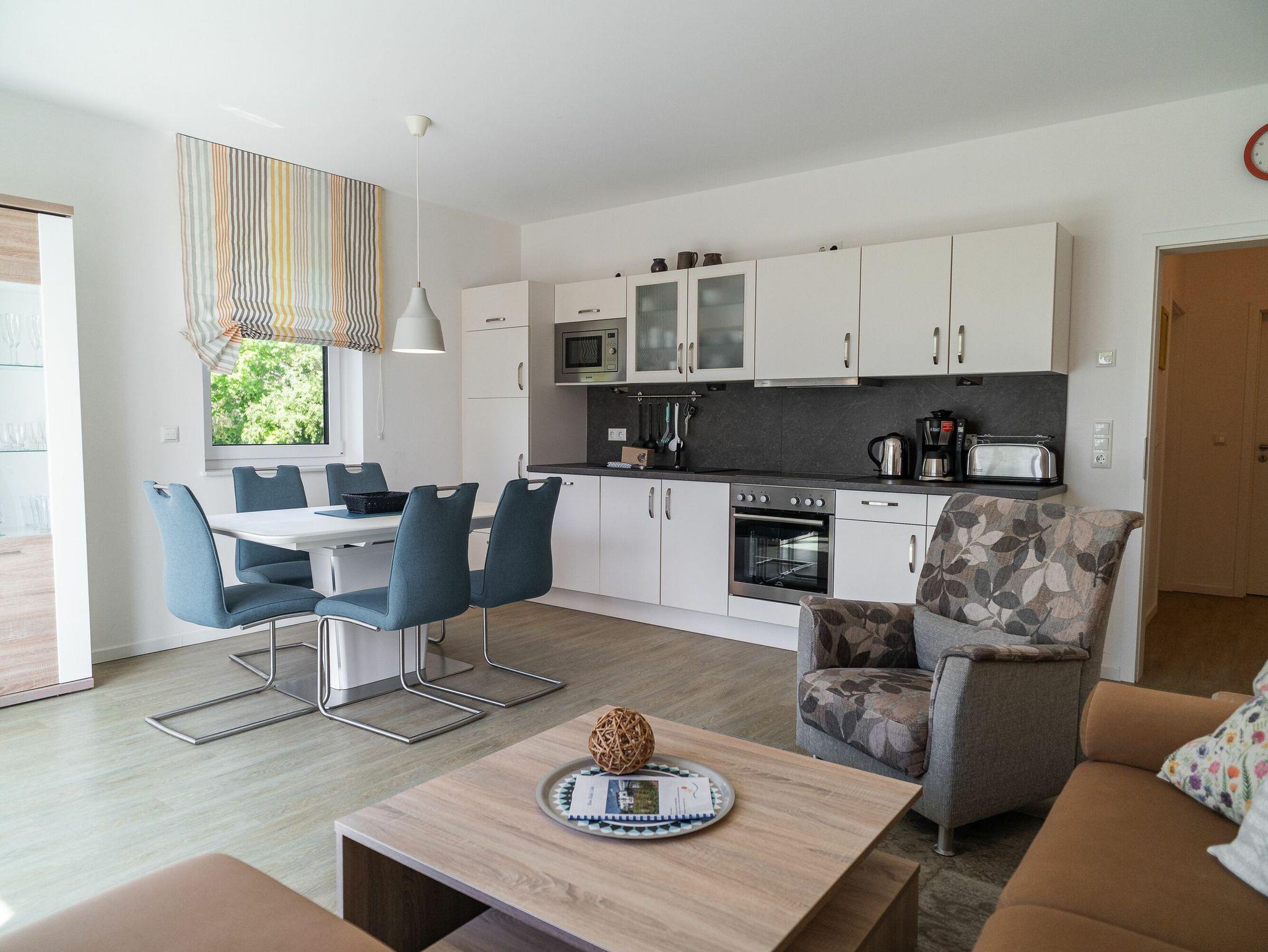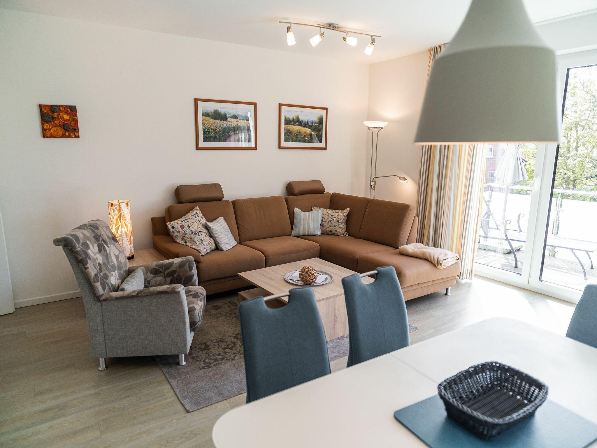 Im hellen und geschmackvoll eingerichteten Wohnzimmer laden eine gemütliche Eckcouch mit passendem Sessel sowie ein großer Esstisch, der für vier Personen bequem Platz bietet, zum Verweilen ein. Bücher und Gesellschaftsspiele befinden sich ebenfalls in der Wohnung. Weiterhin gehören ein LED-TV, ein DVD-Player sowie eine kleine Stereo-Anlage zur technischen Austattung. Vom Wohnzimmer aus gelangen Sie auf den Balkon. Genießen Sie hier ein gemütliches Frühstück in angenehmer Morgensonne, Balkonmöbeln und Sonnenschirm sind vorhanden.