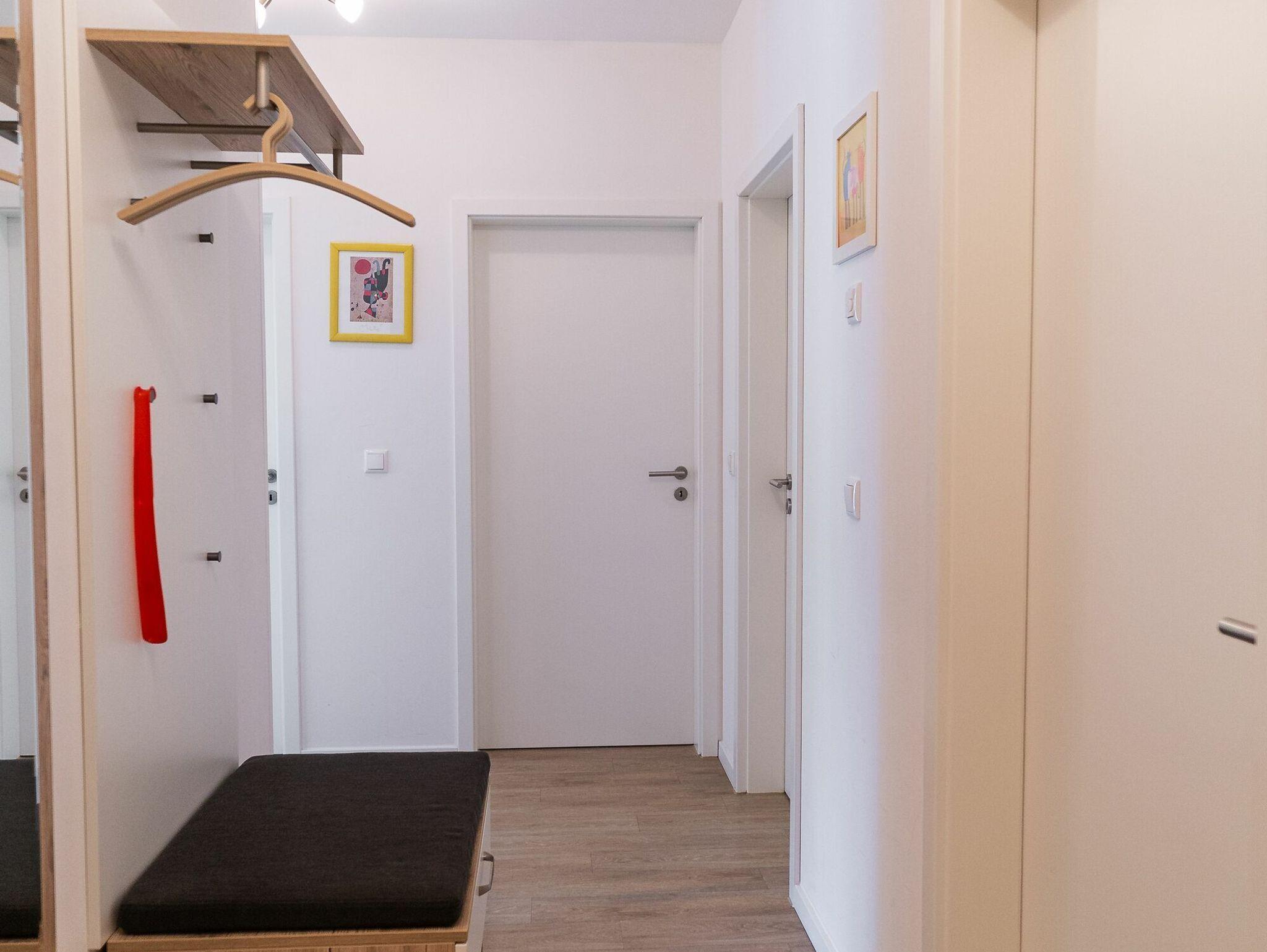 Im eigenen Wirtschaftraum in der Wohnung befindet sich eine Waschmaschine und der Wäschetrockenständer mit Bügelbrett und Bügeleisen.