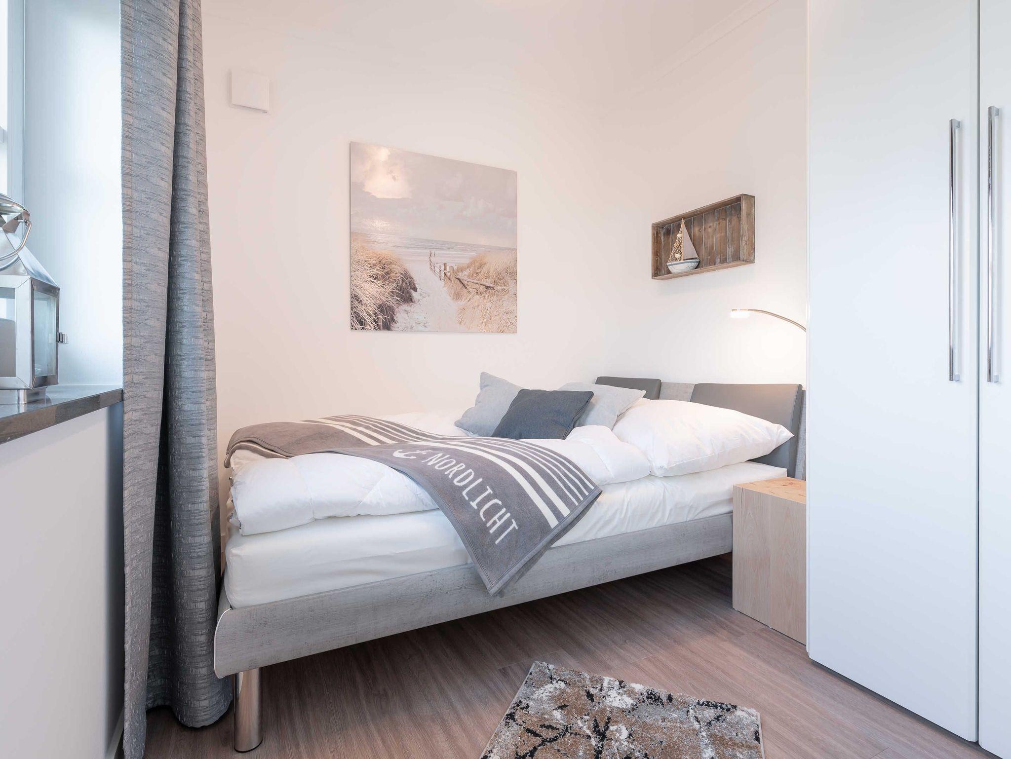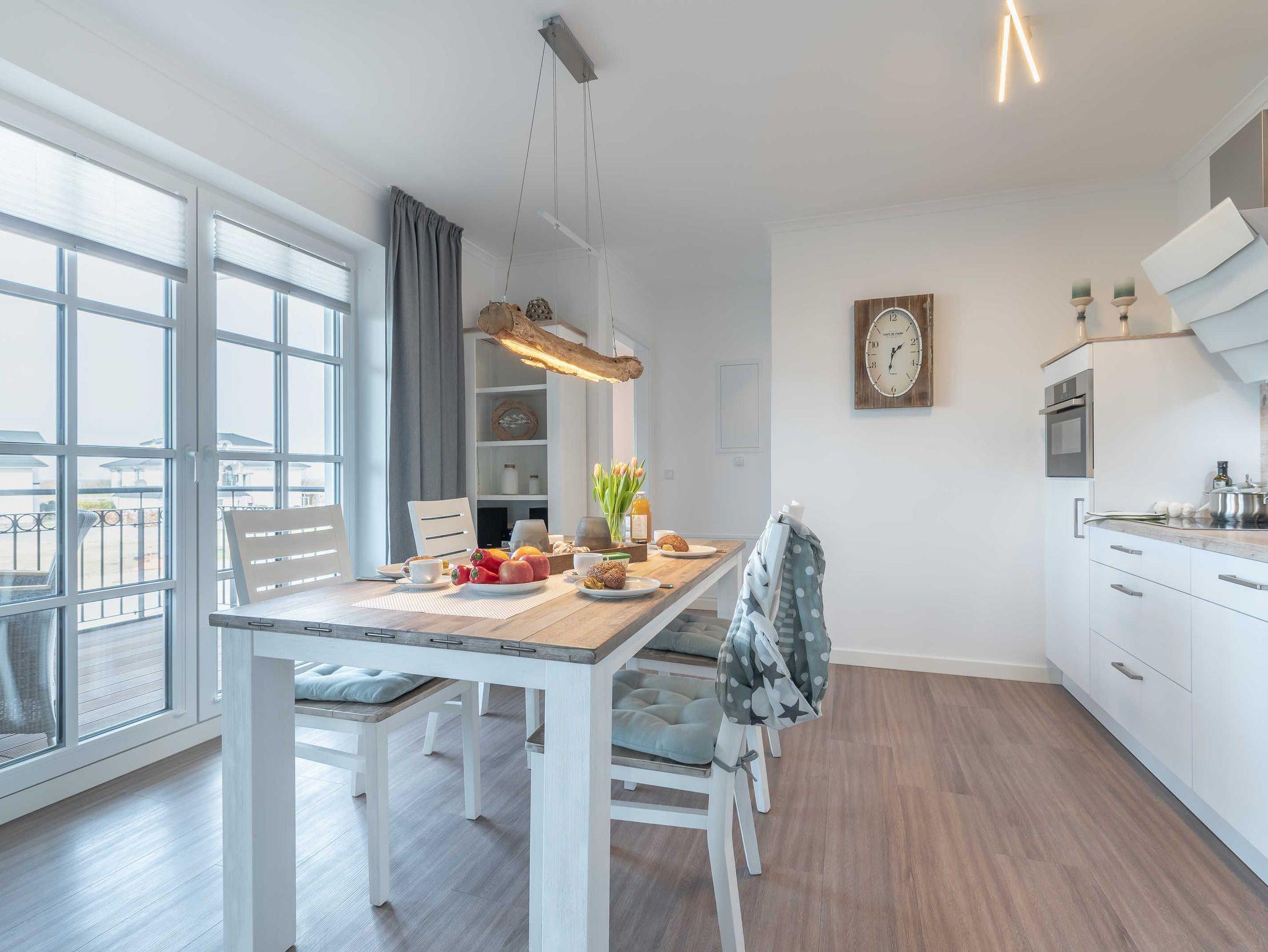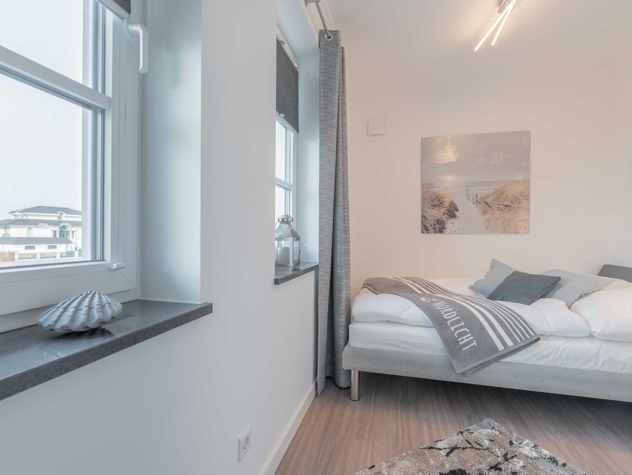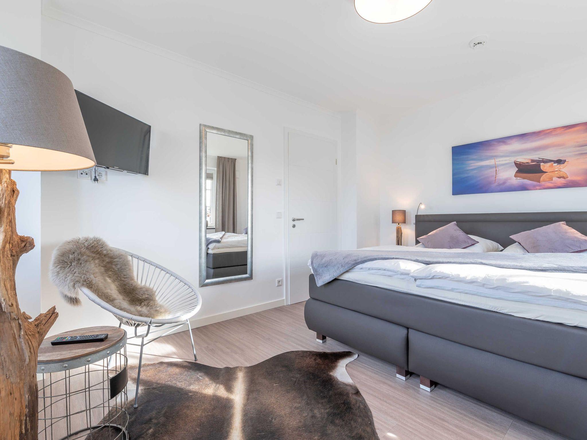 Die modern und liebevoll ausgestattete Unterkunft bietet ausreichend Platz für Familien oder Freundesgruppen mit bis zu vier Erwachsenen. Im Wohnzimmer sind eine Couch mit passendem Sessel und ein Esstisch mit vier Stühlen vorhanden. Zur Unterhaltung stehen ein 49 Zoll Flat-Screen-TV, ein Blu-Ray-Player und eine Mini-Stereoanlage zur Verfügung. In der voll ausgestatteten Küchenzeile finden Sie alles, was Sie für einen entspannten Aufenthalt benötigen: 4-Platten Cerankochfeld, Backofen mit integrierter Mikrowelle, Kühlschrank mit Tiefkühlfach, Geschirrspüler, Kaffeemaschine, Wasserkessel, Tassimo-Kapselmaschine und Toaster. Das erste Schlafzimmer ist mit einem komfortablen Boxspring Bett (180 x 200 cm) und einem Schwebetürenschrank sowie einem weiteren Flat-Screen-TV ausgestattet. Im zweiten Schlafzimmer befinden sich ein Doppelbett (140 x 200 cm) und ein eigener Kleiderschrank. Beide Schlafzimmer sind mit Verdunklungsplissees ausgestattet. Das Bad ist besticht mit einer bodengleichen Dusche mit Regenbrause, einem Handtuchheizkörper und einem Waschtisch mit großem Spiegel, Ablage und Fön. Vom Wohnraum aus haben Sie Zugang zum großzügigen Balkon mit Tisch und vier Stühlen. Von hier aus können Sie den Meerblick genießen und bei einem Glas Wein die herrliche Abendsonne beobachten. An kühlen Herbst- und Wintertagen sorgt eine Fußbodenheizung für Wärme und Gemütlichkeit.