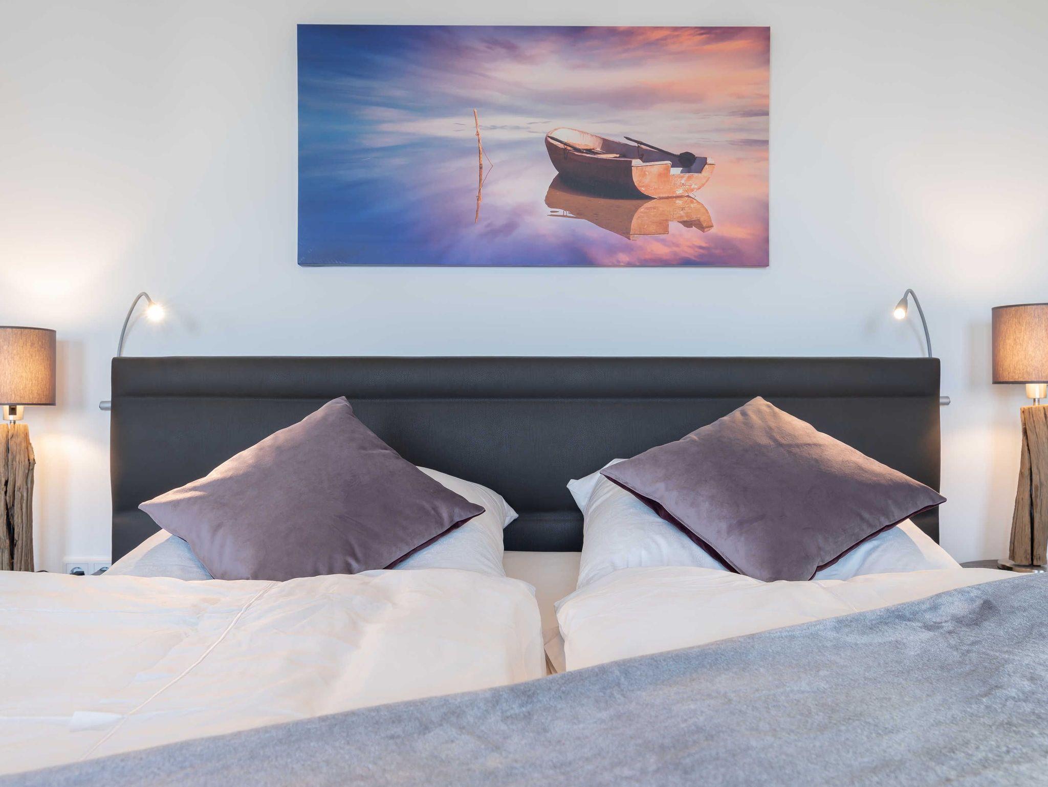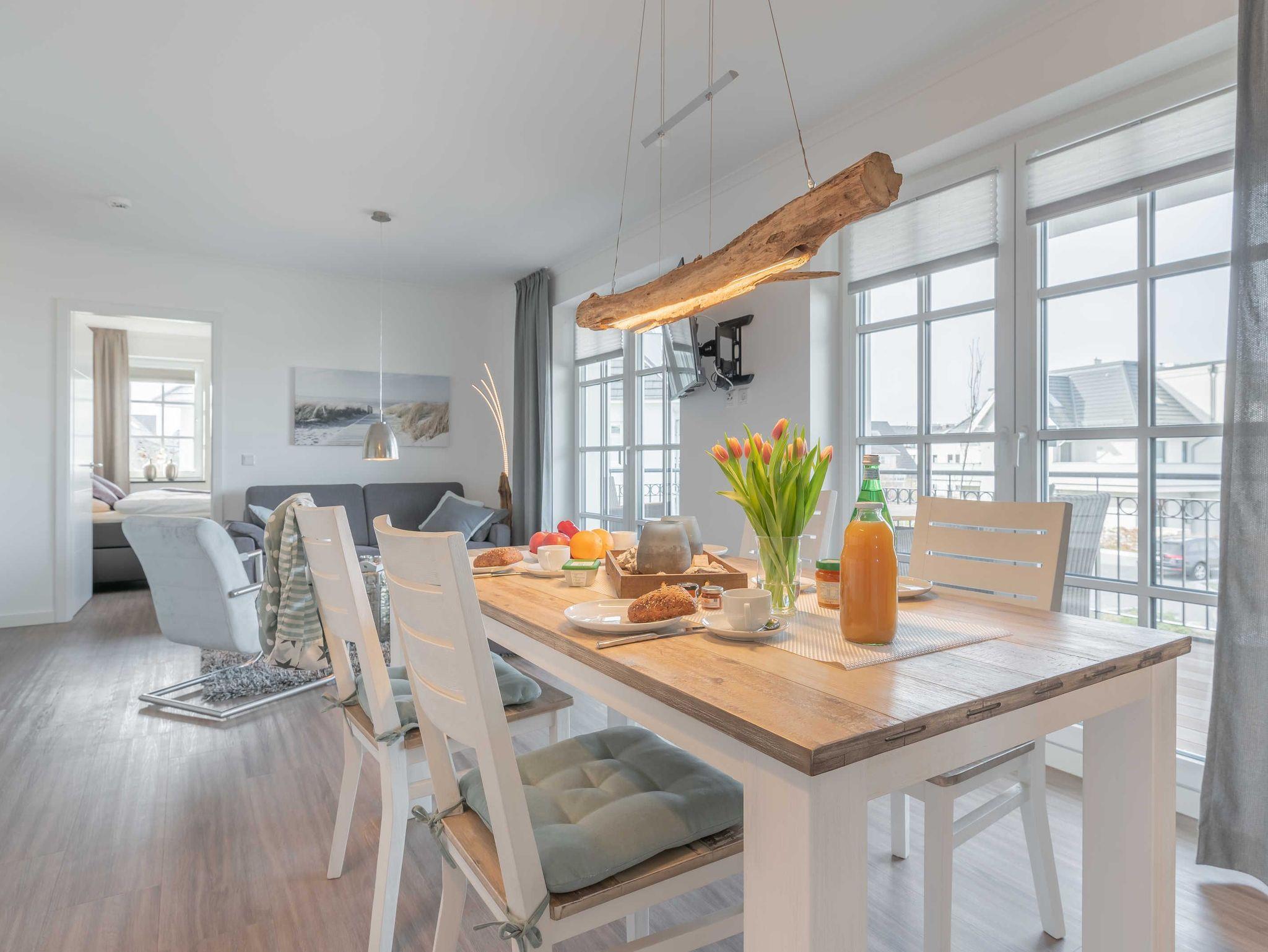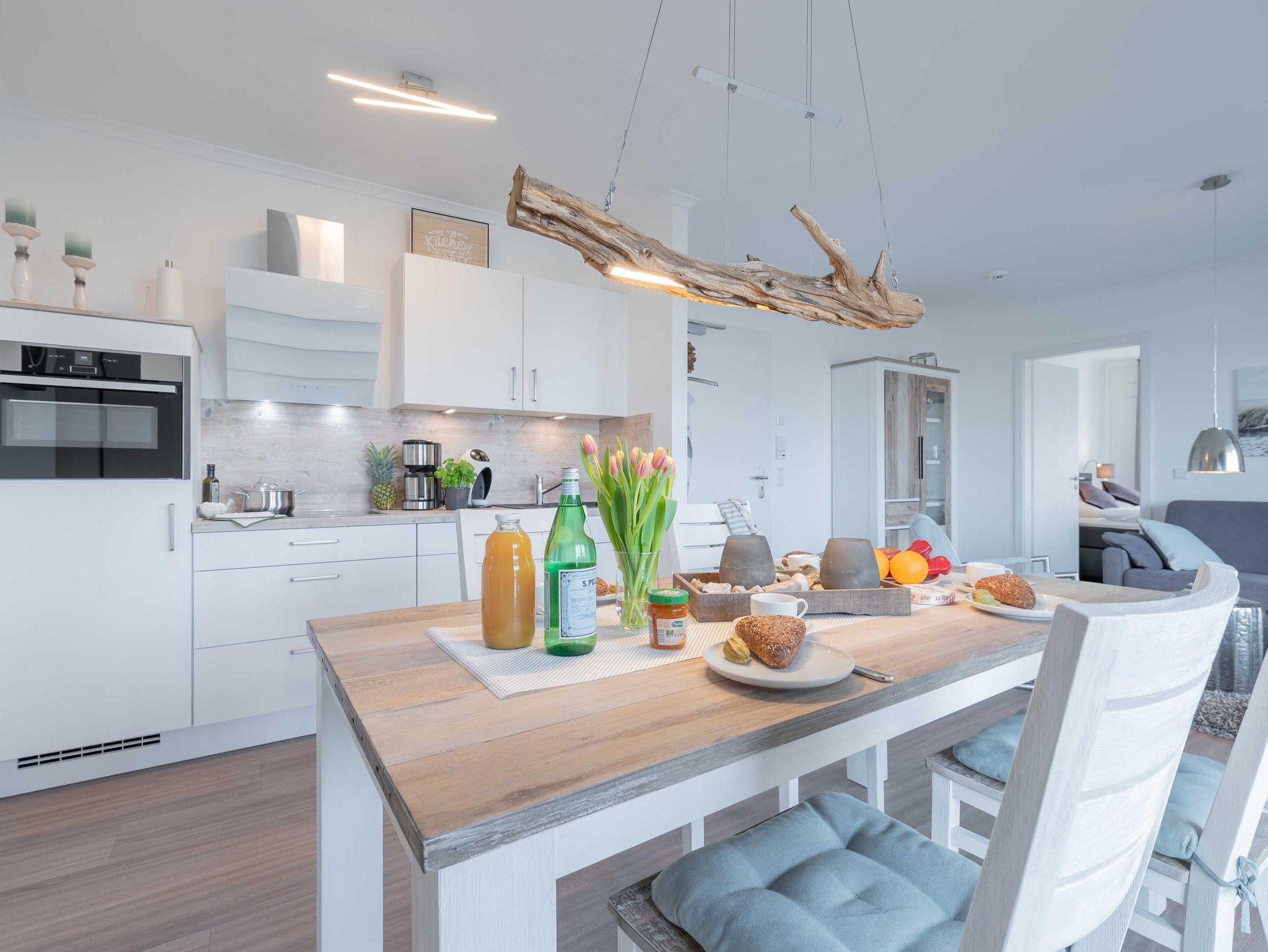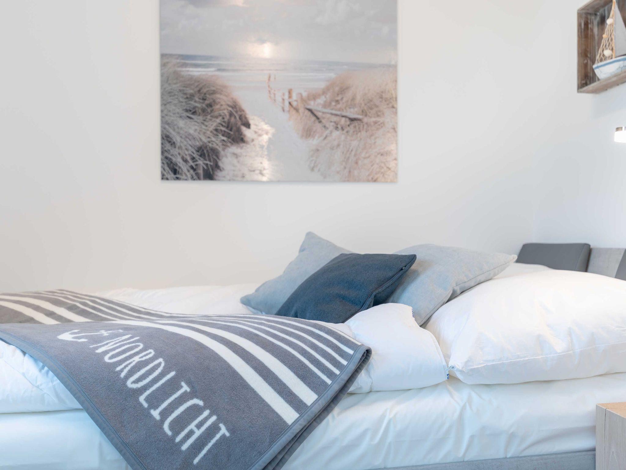 Die modern und liebevoll ausgestattete Unterkunft bietet ausreichend Platz für Familien oder Freundesgruppen mit bis zu vier Erwachsenen. Im Wohnzimmer sind eine Couch mit passendem Sessel und ein Esstisch mit vier Stühlen vorhanden. Zur Unterhaltung stehen ein 49 Zoll Flat-Screen-TV, ein Blu-Ray-Player und eine Mini-Stereoanlage zur Verfügung. In der voll ausgestatteten Küchenzeile finden Sie alles, was Sie für einen entspannten Aufenthalt benötigen: 4-Platten Cerankochfeld, Backofen mit integrierter Mikrowelle, Kühlschrank mit Tiefkühlfach, Geschirrspüler, Kaffeemaschine, Wasserkessel, Tassimo-Kapselmaschine und Toaster. Das erste Schlafzimmer ist mit einem komfortablen Boxspring Bett (180 x 200 cm) und einem Schwebetürenschrank sowie einem weiteren Flat-Screen-TV ausgestattet. Im zweiten Schlafzimmer befinden sich ein Doppelbett (140 x 200 cm) und ein eigener Kleiderschrank. Beide Schlafzimmer sind mit Verdunklungsplissees ausgestattet. Das Bad ist besticht mit einer bodengleichen Dusche mit Regenbrause, einem Handtuchheizkörper und einem Waschtisch mit großem Spiegel, Ablage und Fön. Vom Wohnraum aus haben Sie Zugang zum großzügigen Balkon mit Tisch und vier Stühlen. Von hier aus können Sie den Meerblick genießen und bei einem Glas Wein die herrliche Abendsonne beobachten. An kühlen Herbst- und Wintertagen sorgt eine Fußbodenheizung für Wärme und Gemütlichkeit.