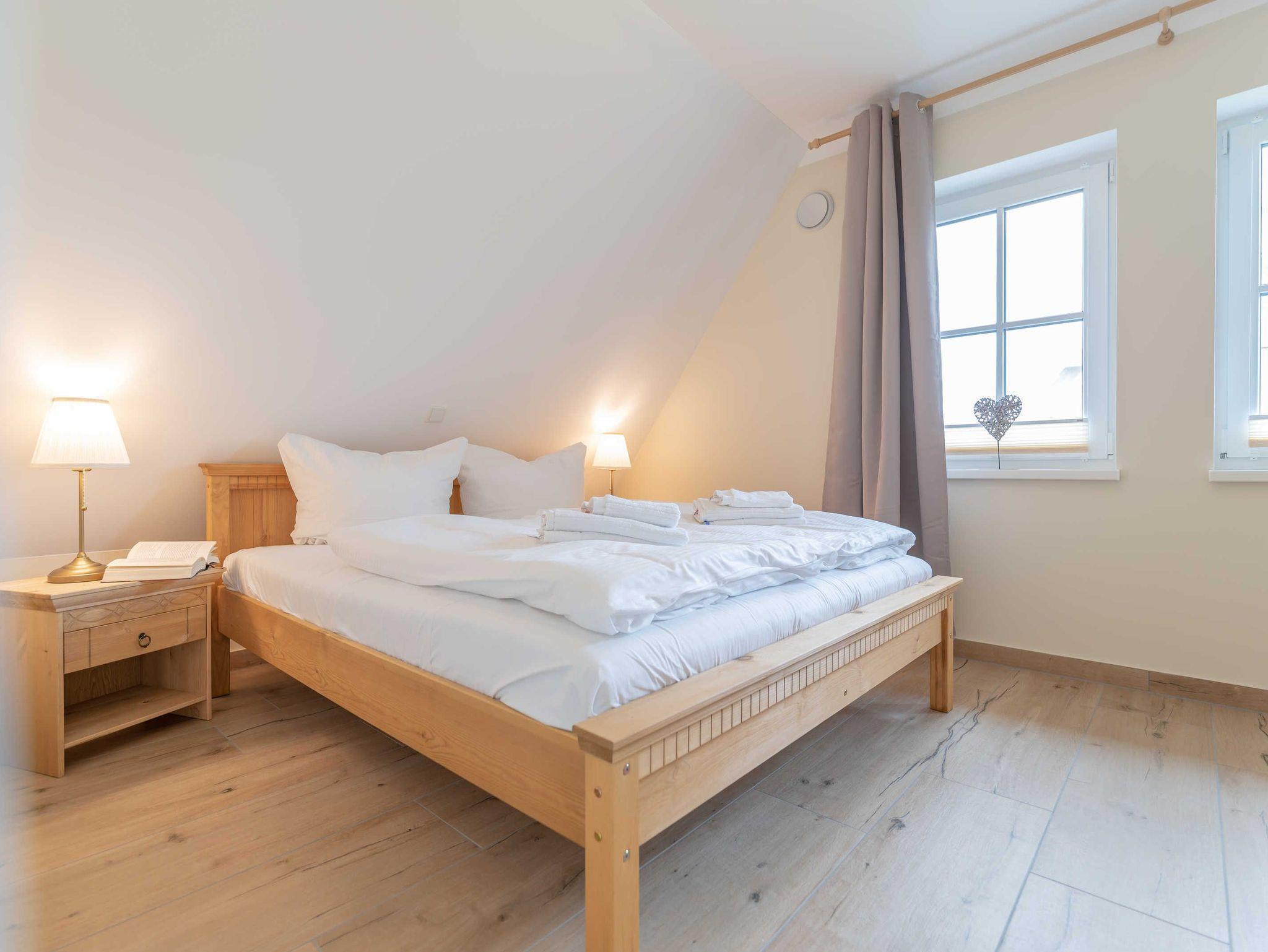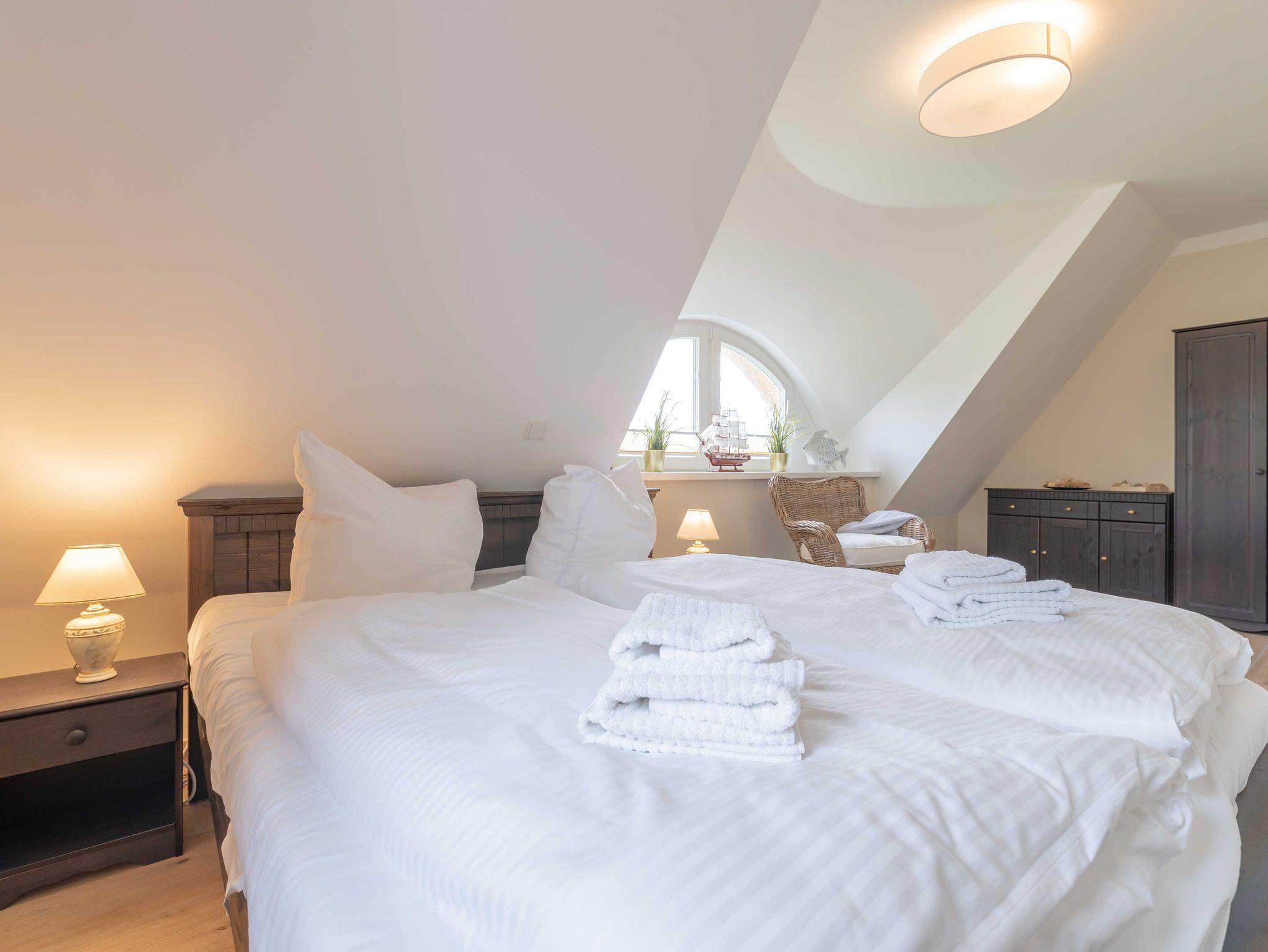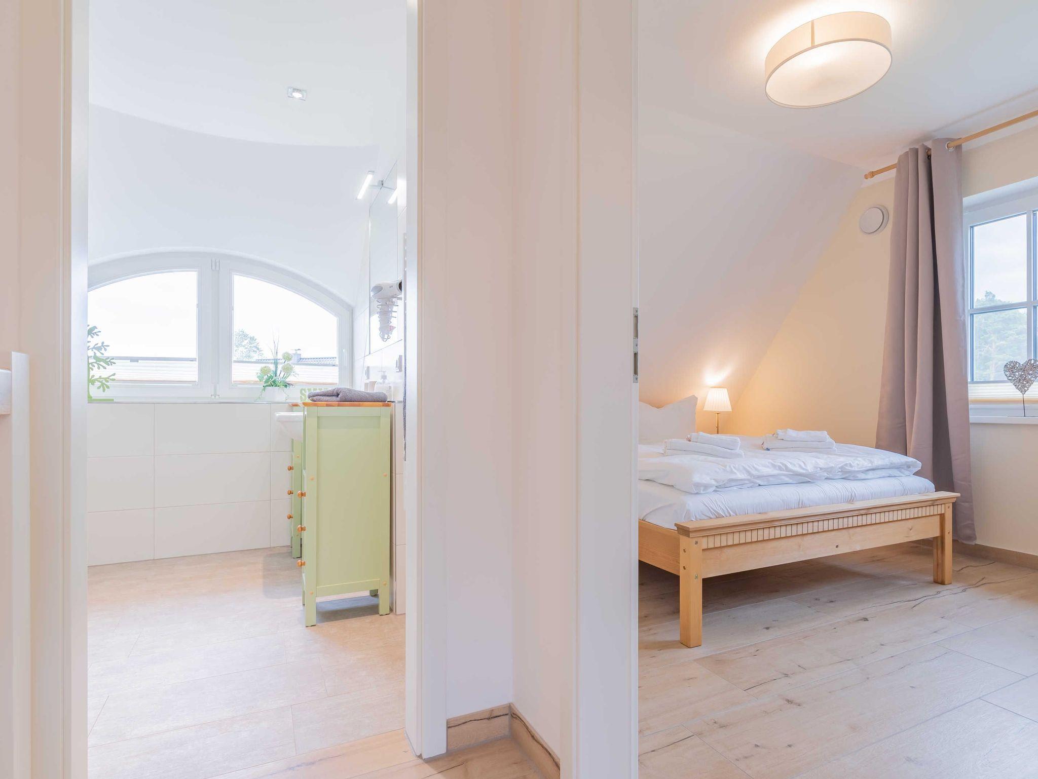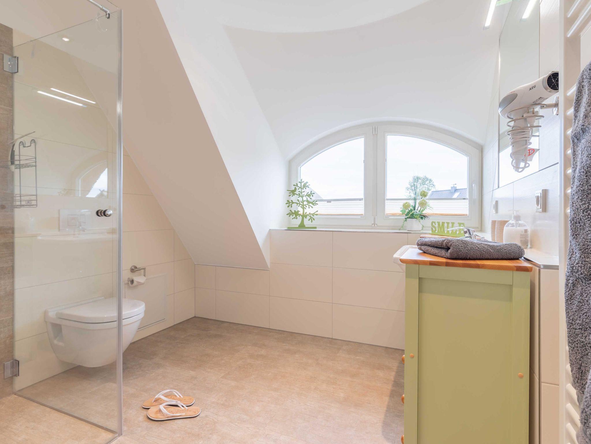 Im Obergeschoss befindet sich das zweite großzügig und hell angelegte Badezimmer mit Dusche und Handtuchtrockner. Beide sich im Obergeschoss befindlichen Schlafzimmer sind mit geräumigen Kleiderschränken, Sitzgelegenheiten und Kommoden, sowie zwei Doppelbetten (1,60 x 2,00 m) mit einer großen Matratze ausgestattet. Zum besseren Einschlafen kann im großen Schlafzimmer auf den installierten Flat-TV Fernsehen geschaut werden.