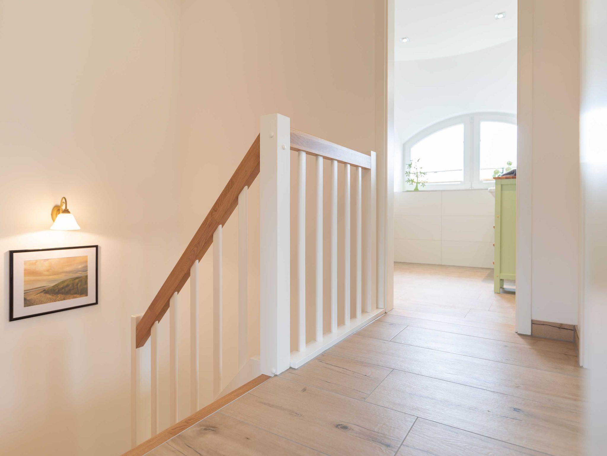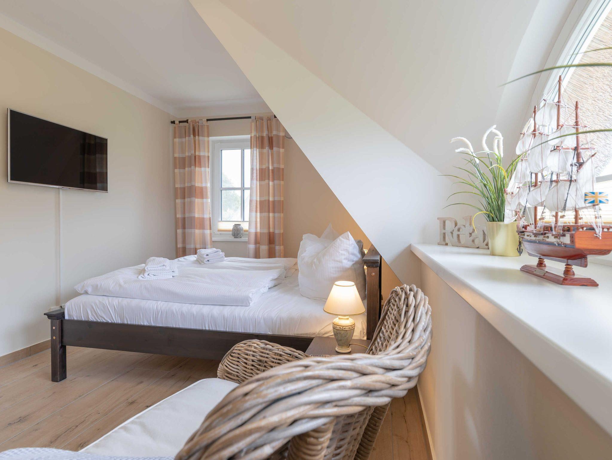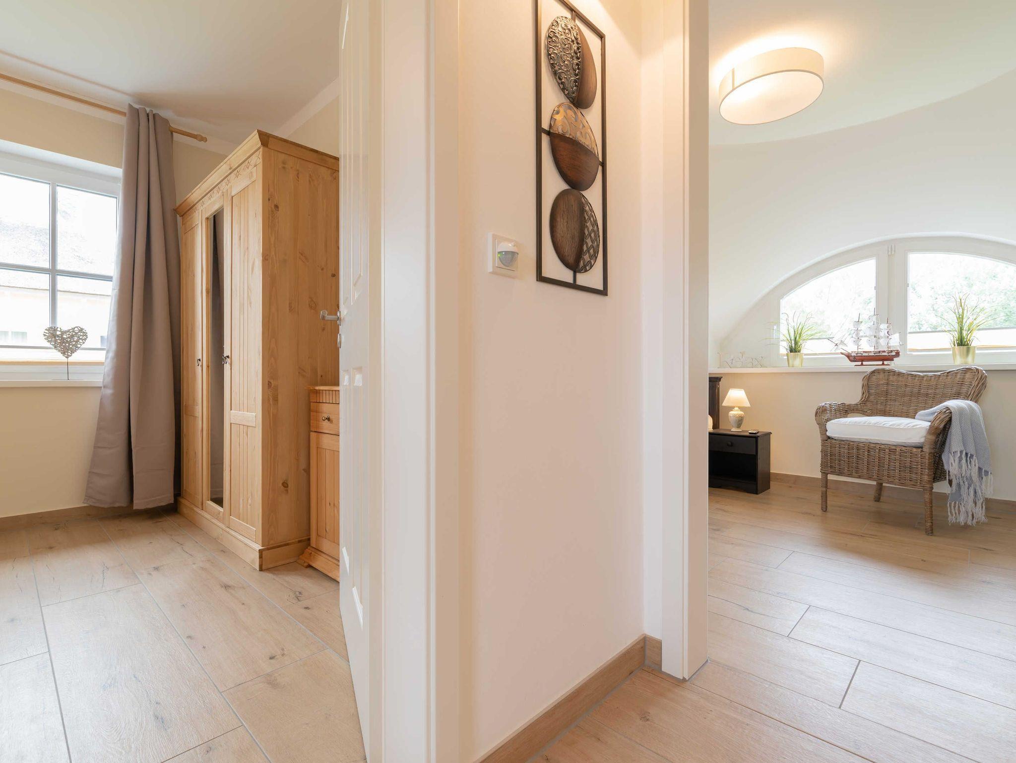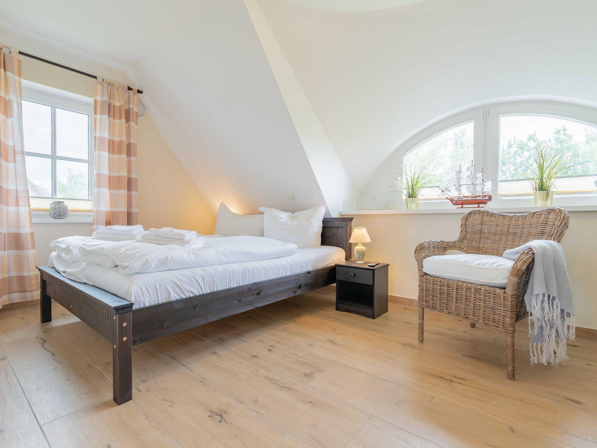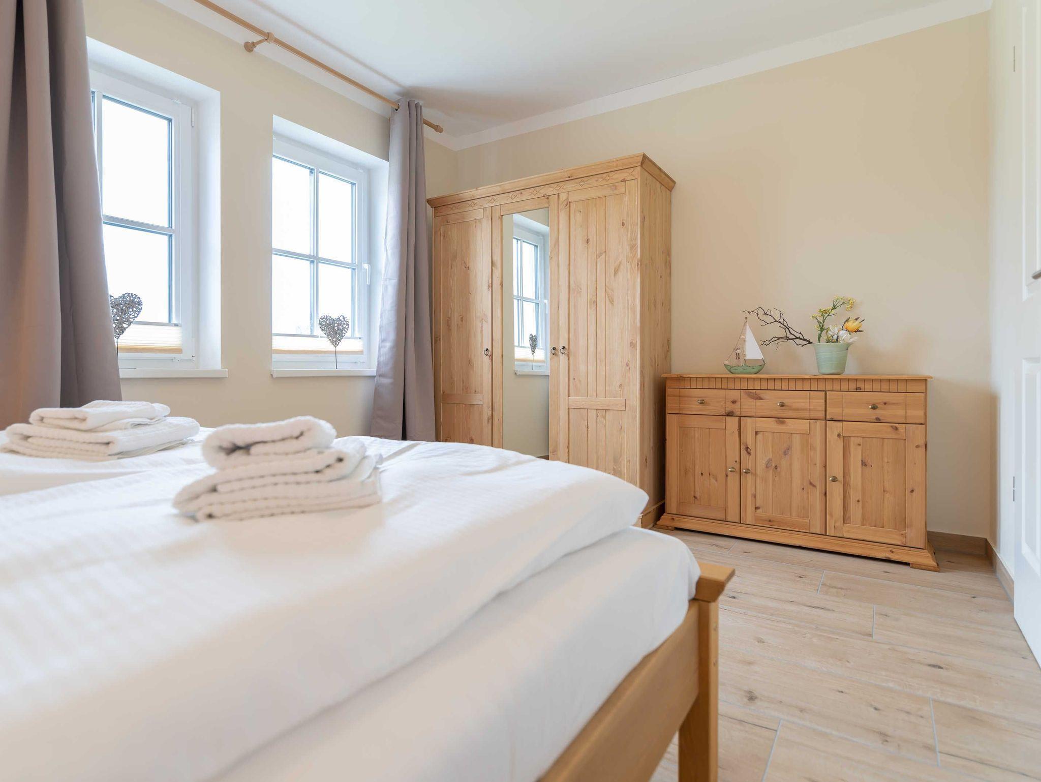 Im Obergeschoss befindet sich das zweite großzügig und hell angelegte Badezimmer mit Dusche und Handtuchtrockner. Beide sich im Obergeschoss befindlichen Schlafzimmer sind mit geräumigen Kleiderschränken, Sitzgelegenheiten und Kommoden, sowie zwei Doppelbetten (1,60 x 2,00 m) mit einer großen Matratze ausgestattet. Zum besseren Einschlafen kann im großen Schlafzimmer auf den installierten Flat-TV Fernsehen geschaut werden.