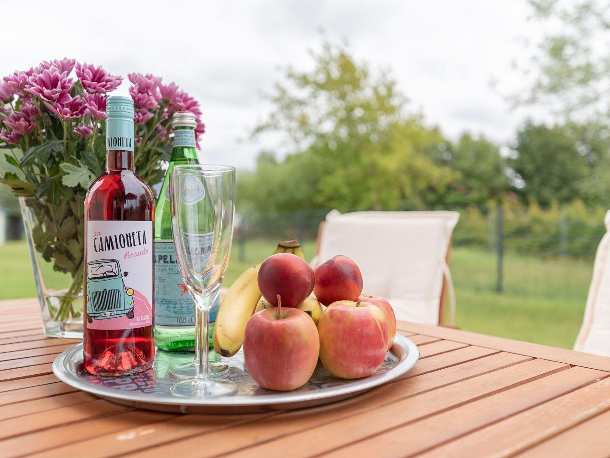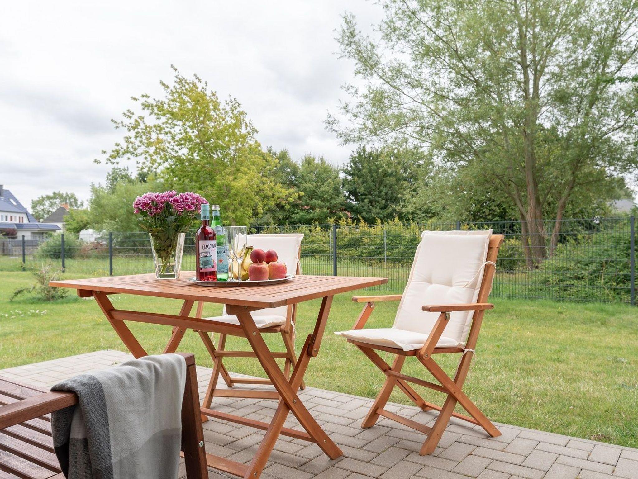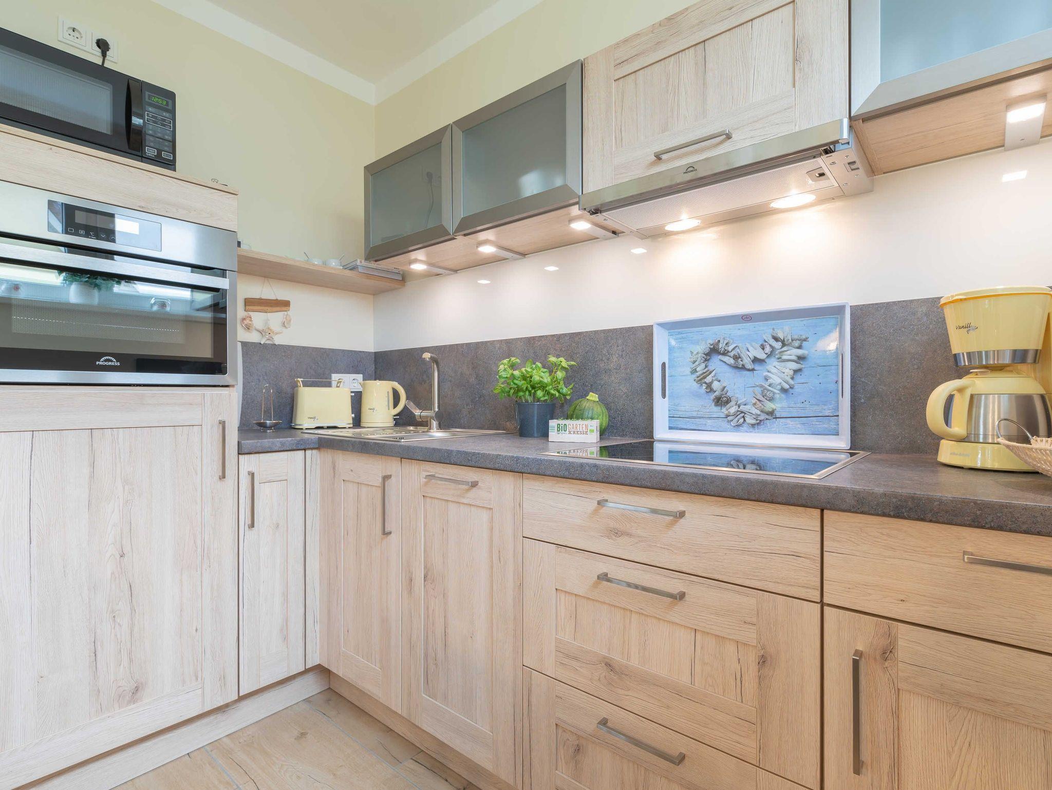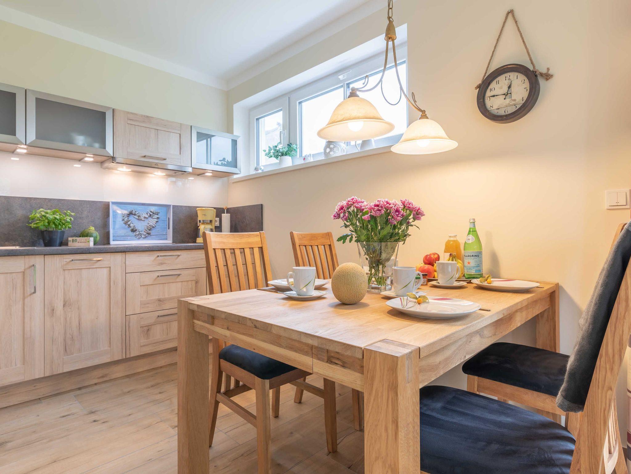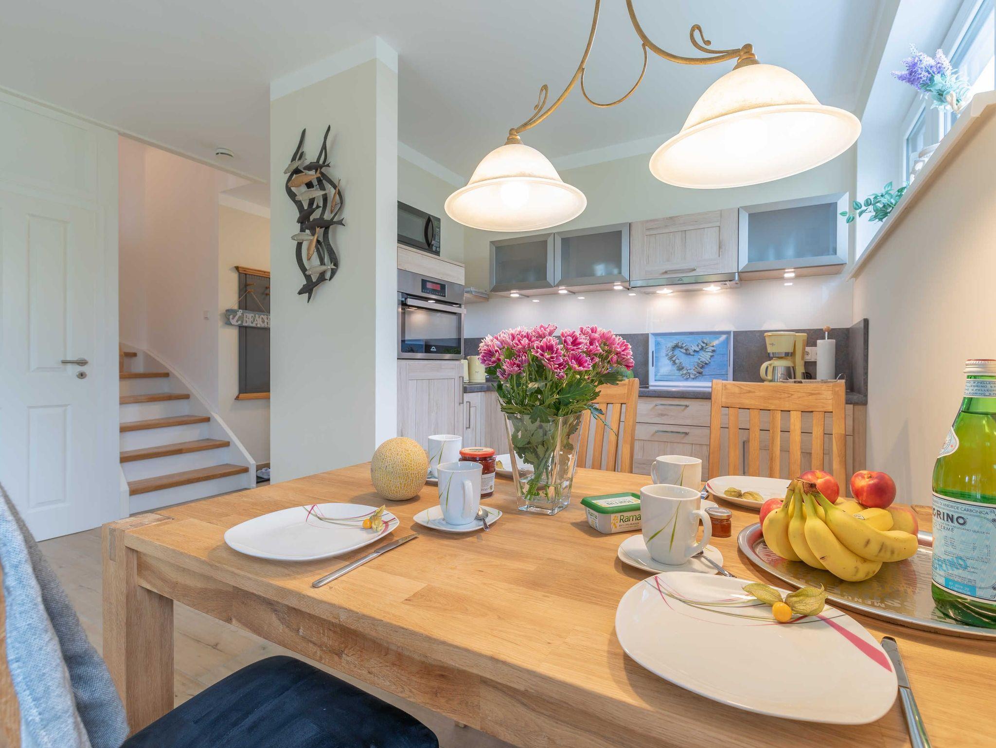 Der großzügig gestaltete Wohn-Essbereich befindet sich ebenfalls im Erdgeschoss. Die Einbauküche im klassischen Landhausstil sowie div. Küchengeräte wie Toaster, Eierkocher, Kaffeemaschine, Wasserkocher, Mikrowelle und Herd mit Cerankochfeld und Backofen bieten ambitionierten Hobbyköchen, auch im Urlaub, die Möglichkeit Essen nach eigenen Wünschen zu kochen. Im Küchenbereich rundet ein massiver Holztisch inkl. vier Stühlen das freundlich warme Design ab.
