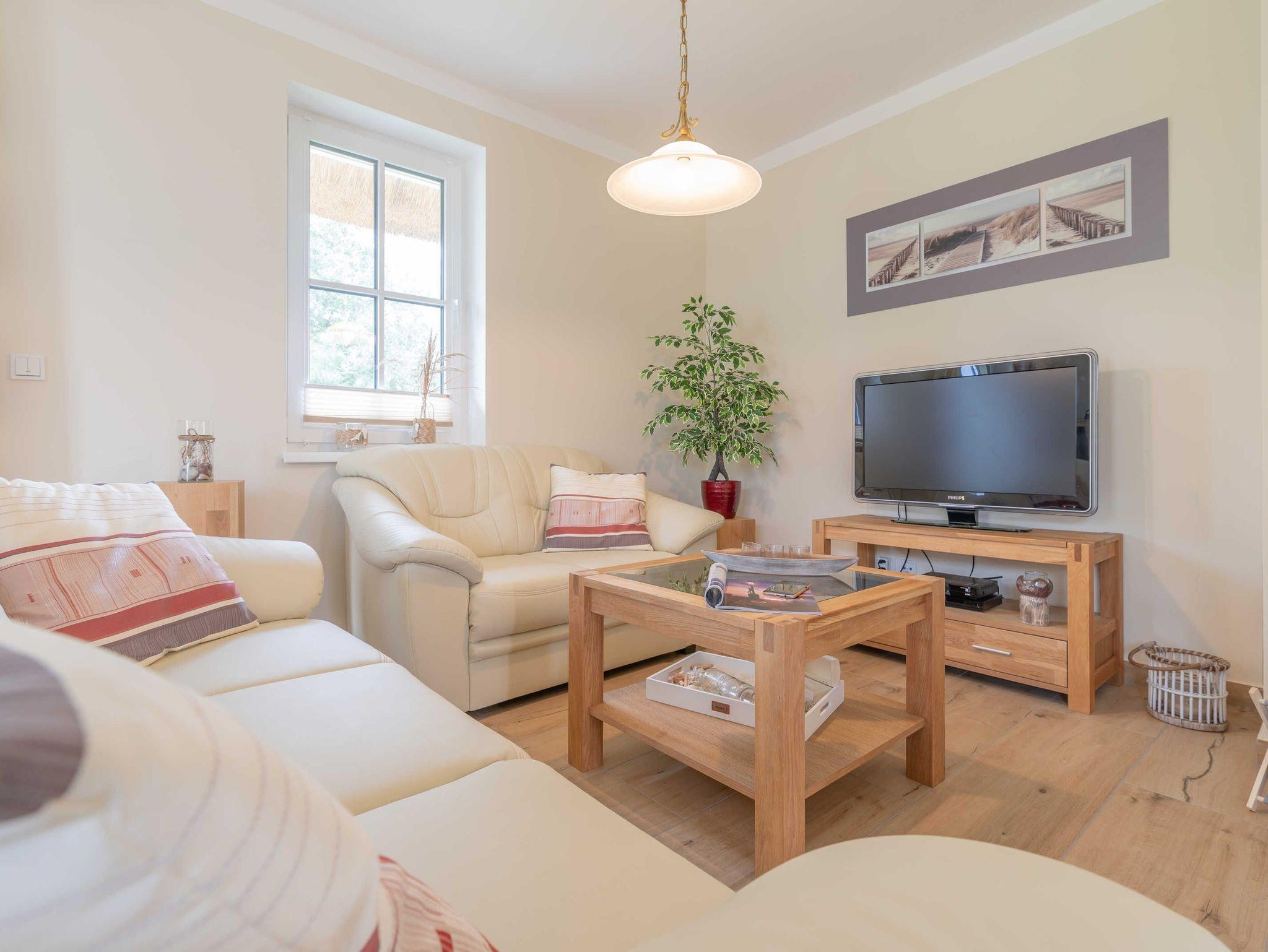 Die gemütliche Couchecke im Wohnbereich eignet sich ideal zum entspannen nach einen ausgedehnten Strandspaziergang.