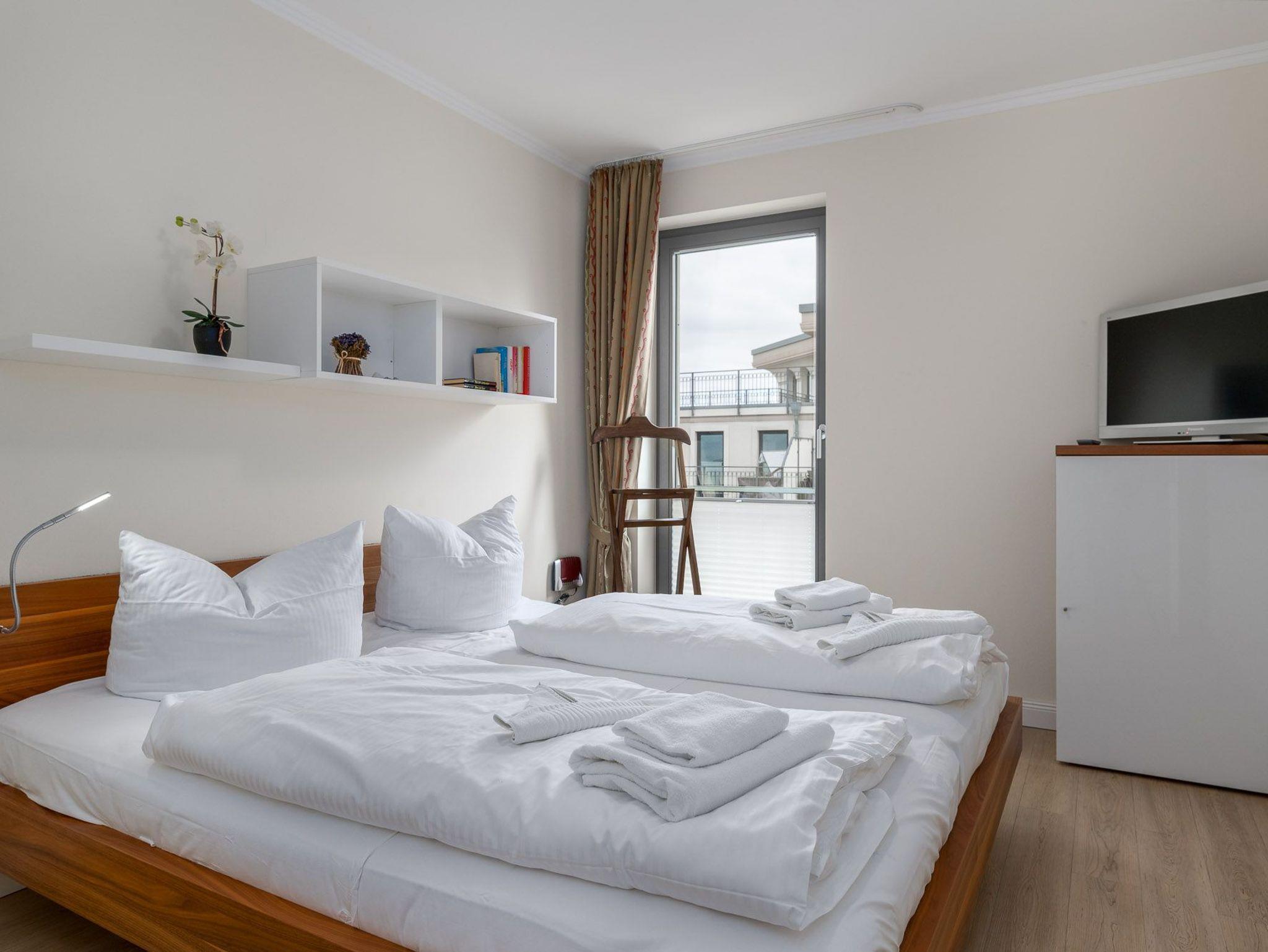 Die 2011 erbaute Unterkunft liegt nur 50 m vom Ostseestrand entfernt. Der helle, lichtdurchflutete Wohnraum empfängt Sie mit stilvollem Gas- Kamin, TV- Gerät, DVD-Spieler und gemütlicher Leder-Sitzecke. Im dortigen Essbereich, der mit einem Massivholz-Esstisch und bequemen Stühlen eingerichtet wurde, können gesellige Mahlzeiten und auch Spieleabende der ganzen Familie stattfinden. Die offene Einbauküche ist ausgestattet mit Siemens-Einbaugeräten (Geschirrspüler, Mikrowelle, Cerankochfeld, Backofen), Dunstabzugshaube, Kühlschrank mit Gefrierfach, Kaffeemaschine, Wasserkocher und Toaster. In den beiden wunderschönen Schlafzimmern sorgen je ein Doppelbett (hochwertige Kaltschaum-Matratzen auf Lattenrost) für den erholsamen Urlaubsschlaf. Für den nötigen Stauraum Ihrer Urlaubskleidung sind mehrere raumhohe Kleiderschränke eingebaut worden. Zusätzlich steht ein separater Abstellraum in der Wohnung bereit. Eines der Schlafzimmer verfügt zudem über ein weiteres TV-Gerät. Das elegante Duschbad besticht mit einer ebenerdigen Dusche, inklusive Glasabtrennung und Handtuchtrockner. Angrenzend befinden sich ein weiteres Gäste-WC. Zu einem sonnigen Frühstück lockt der charmante Eck-Balkon mit Meerblick in Nord-Ost-Ausrichtung. Eine Fußbodenheizung in allen Räumen ist für angenehme Wärme zuständig. Zur Wohnung gehören zudem ein kostenfreier Tiefgaragenstellplatz und eine Abstellmöglichkeit für Fahrräder. Bitte beachten Sie die Durchfahrtshöhe von max. 1,90 m der Tiefgarage. Mit dem Personenaufzug gelangen Sie von der Tiefgarage aus direkt zu Ihrer Wohnung. Im Erdgeschoss der Wohnung befindet sich ein gekennzeichneter Abstellbereich für Kinderwagen. Hier noch einige Hinweise: Es handelt sich um eine Nichtraucherwohnung. Haustiere sind nicht erlaubt. Das kostenfreie WLAN in der Unterkunft ist ausschließlich für die Verwendung von Social Media und den Austausch von Bildern mit Familie und Freunden gedacht. Die Nutzung zum Streamen von Filmen ist nicht vorgesehen. Wäschesets, Kinderreisebett und Kinderhochstuhl können kostenpflichtig zugebucht werden. Eine Waschmaschine und ein Trockner stehen im separaten Hauswirtschaftsraum im Untergeschoss der Villa zu Ihrer Verfügung (gegen Gebühr / 1,00 € Münzen). Sichern Sie sich einen der begehrten Strandkörbe nur ein paar Meter entfernt von den rauschenden Wellen der Ostsee (Anfang Mai - Ende August) und buchen Sie jetzt zu besonderen Konditionen (12,00 € pro Tag oder 75,00 € pro Woche.)