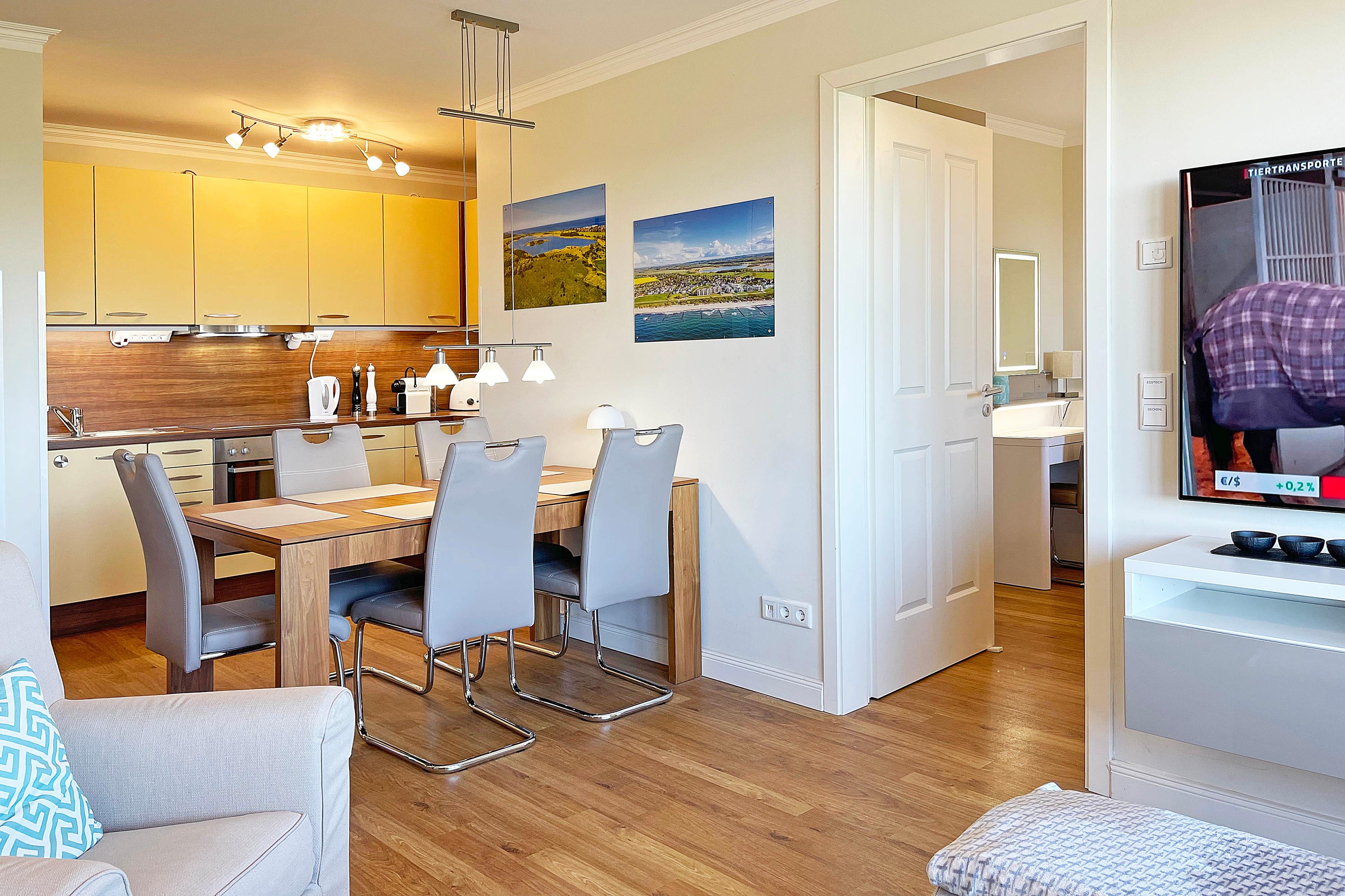 Eine komplett eingerichtete Küche und ein grosser Esstisch.