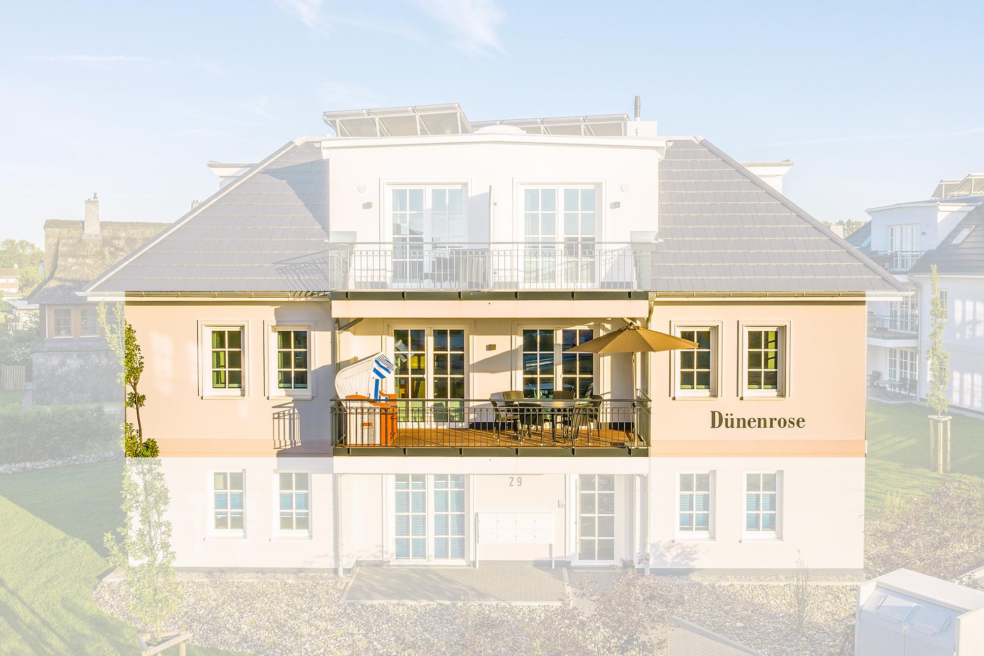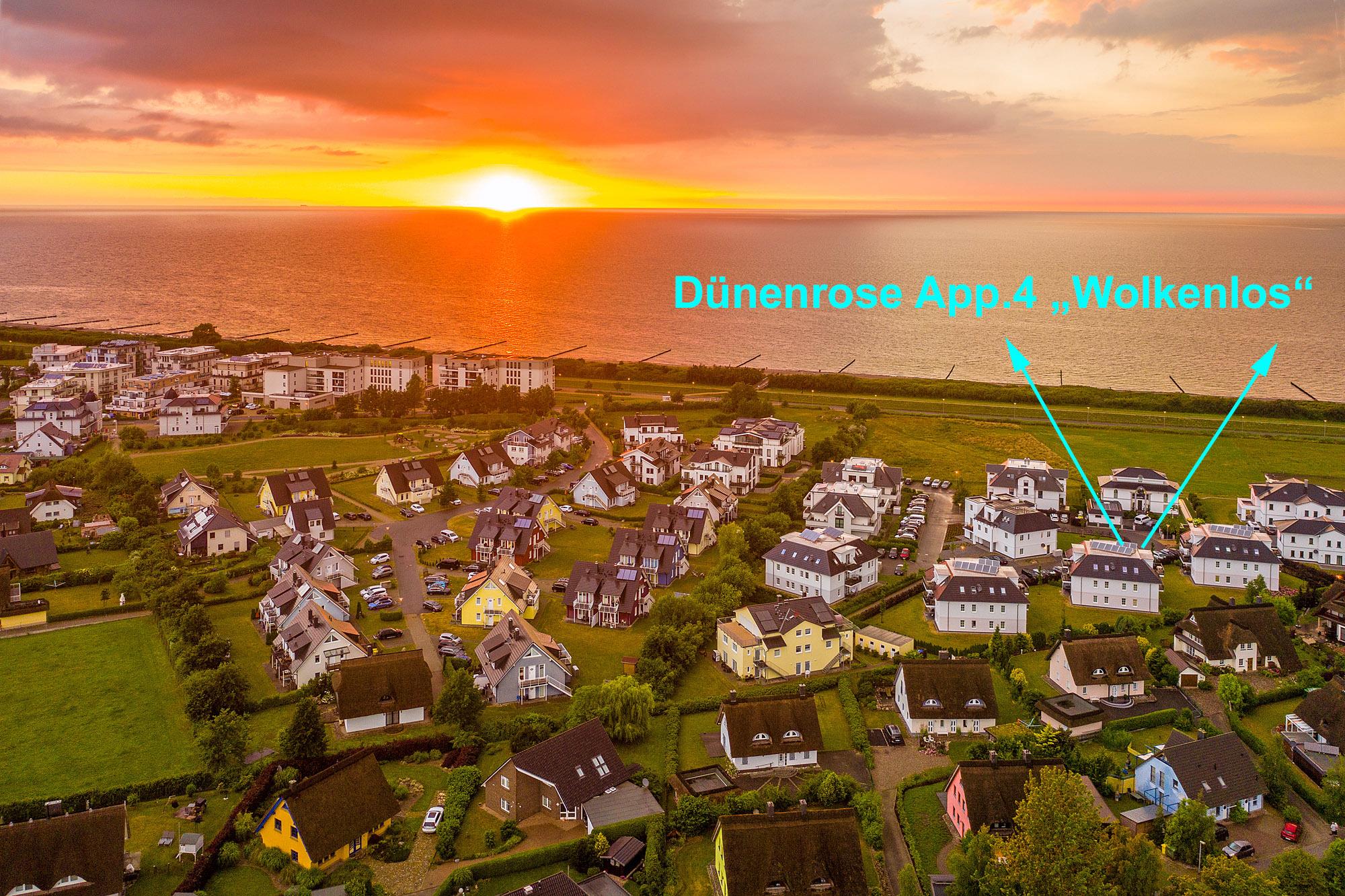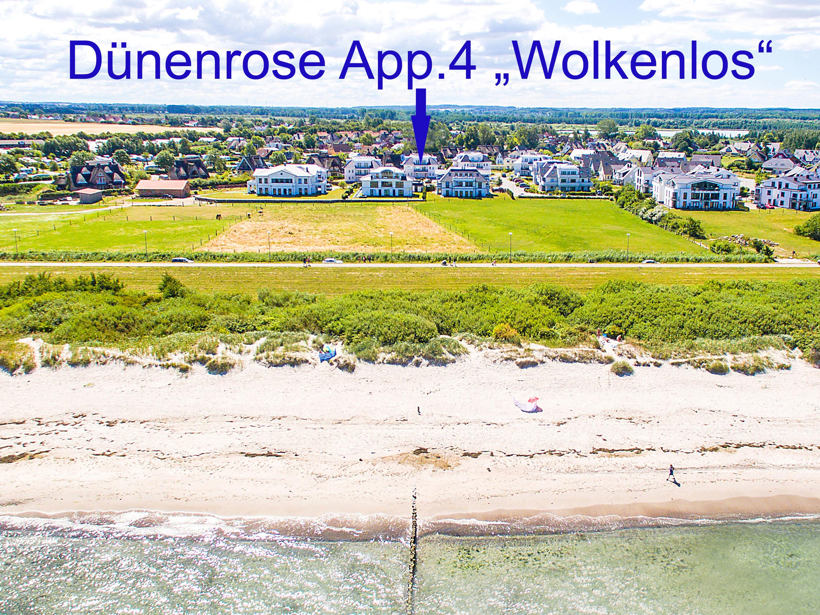 Haus Dünenrose 4 "Wolkenlos" – Meerblick, Nichtraucher, keine Haustiere. Die modern und liebevoll ausgestattete 3-Zimmer-Ferienwohnung wurde im Herbst 2018 fertiggestellt. Geeignet ist die 64 m² große Wohnung mit einer voll ausgestatteten Küchenzeile im ersten Obergeschoss für bis zu maximal 6 Personen. Besonders hervorzuheben für diese Ferienwohnung ist der grosszügige und geschützte Balkon (13 m²) mit einem Strandkorb. Hier genießen Sie einen direkten Blick auf die nahe Ostsee.