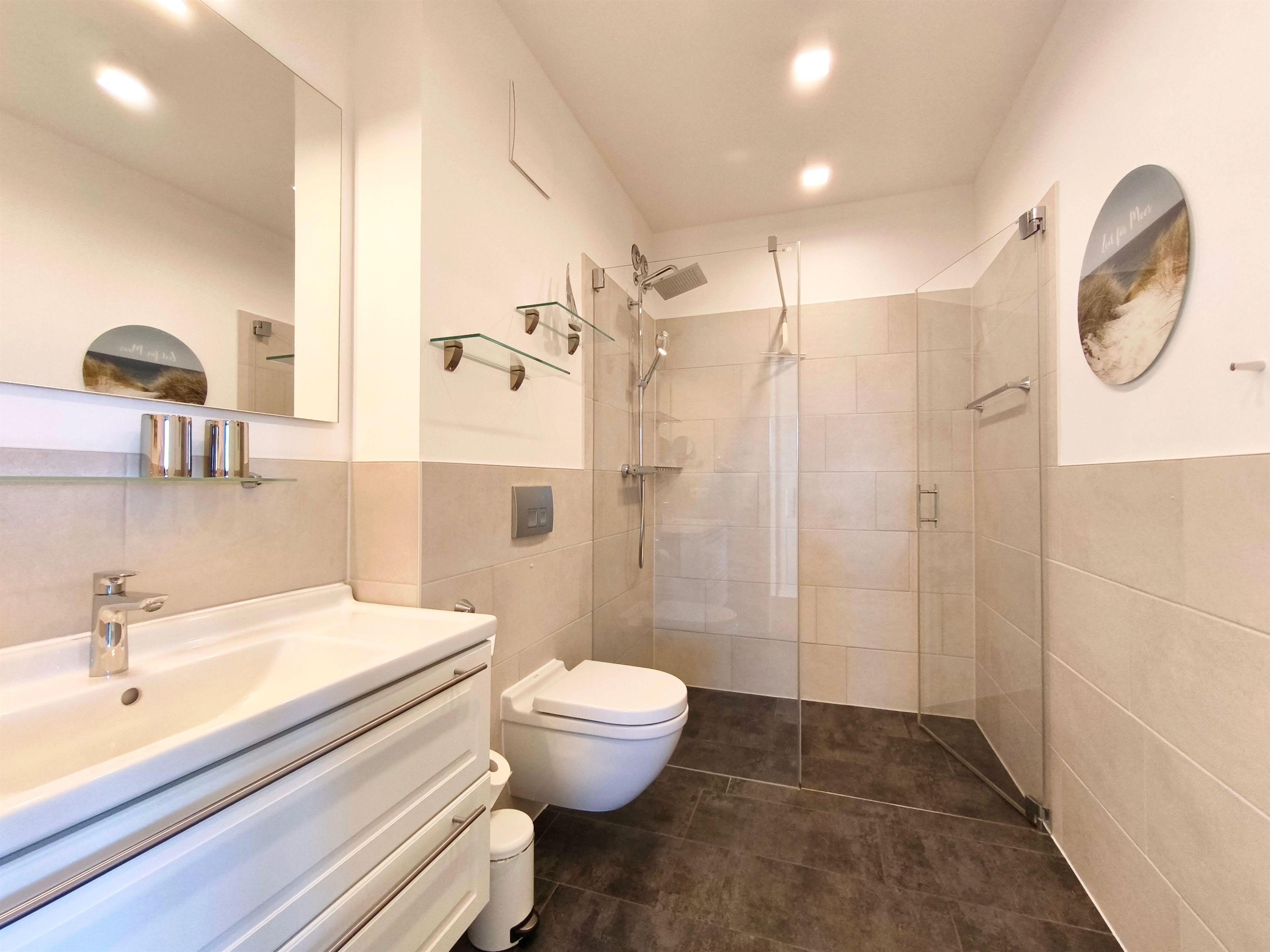 Im geräumigen Bad befinden sich eine großzügige, ebenerdige Regendusche, ein Handtuchtrockner, ein Waschtisch mit Föhn und Kosmetikspiegel.