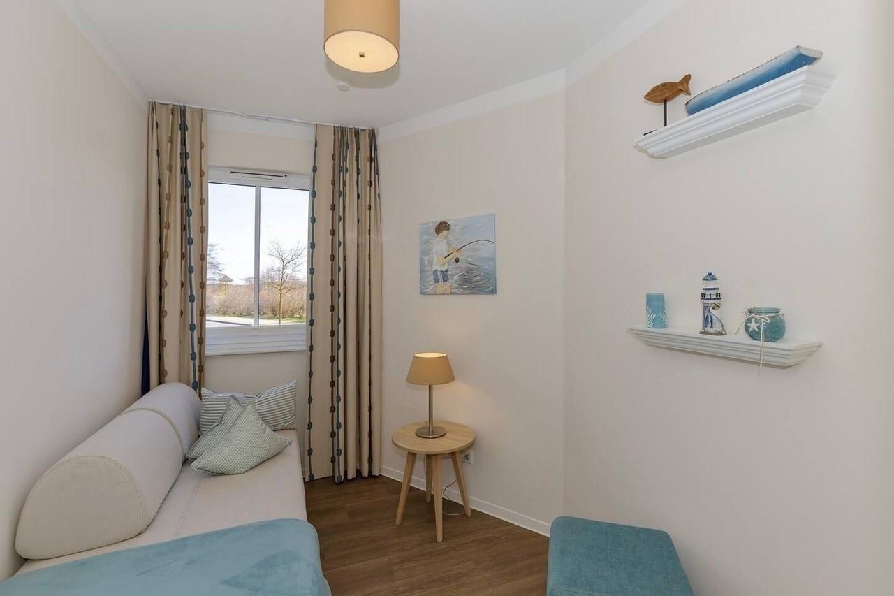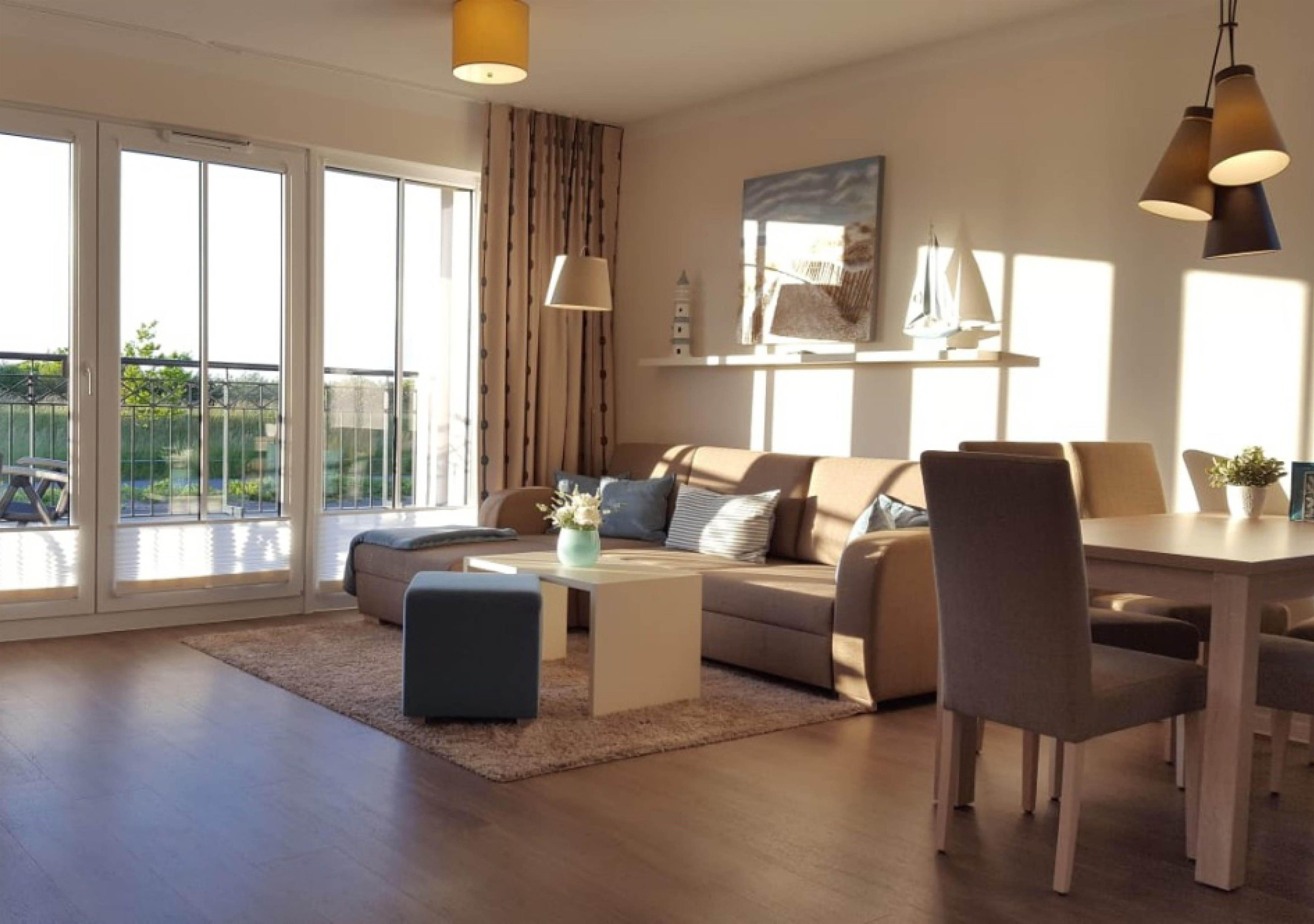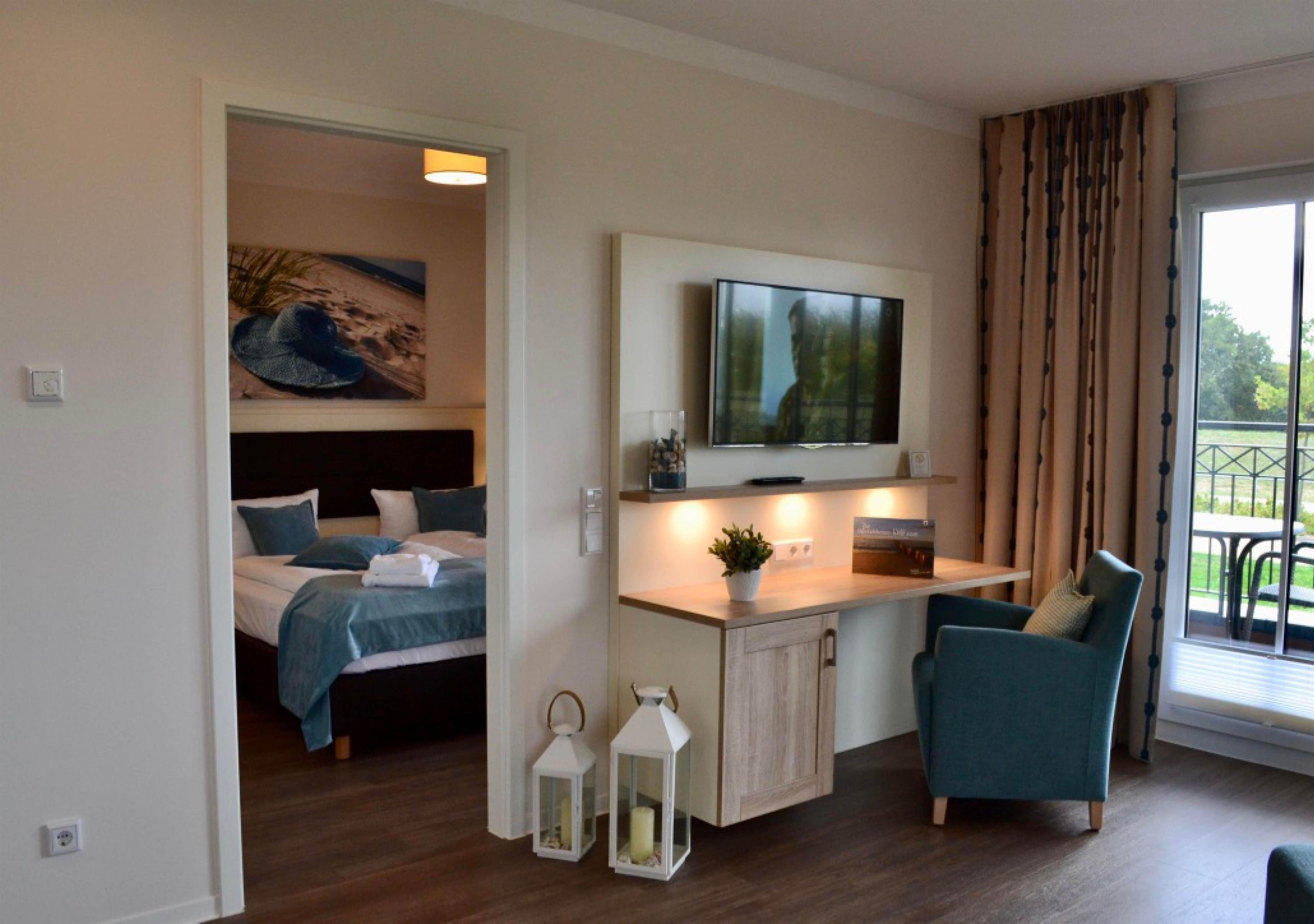 Die exklusive lichtdurchflutete Ferienwohnung befindet sich im östlichen Flügel im Erdgeschoss des Aparthotels und bietet auf 68m² viel Platz für bis zu 5 Personen. Der gemütliche Wohnbereich mit großen Fenstern zur Meerseite besitzt ein bequemes Eck-Sofa, welches sich mit wenigen Handgriffen zu einer Doppelschlafcouch (1,50m x 2,00m) umfunktionieren lässt, und sorgt mit einem Flatscreen-TV für reichlich Entertainment.