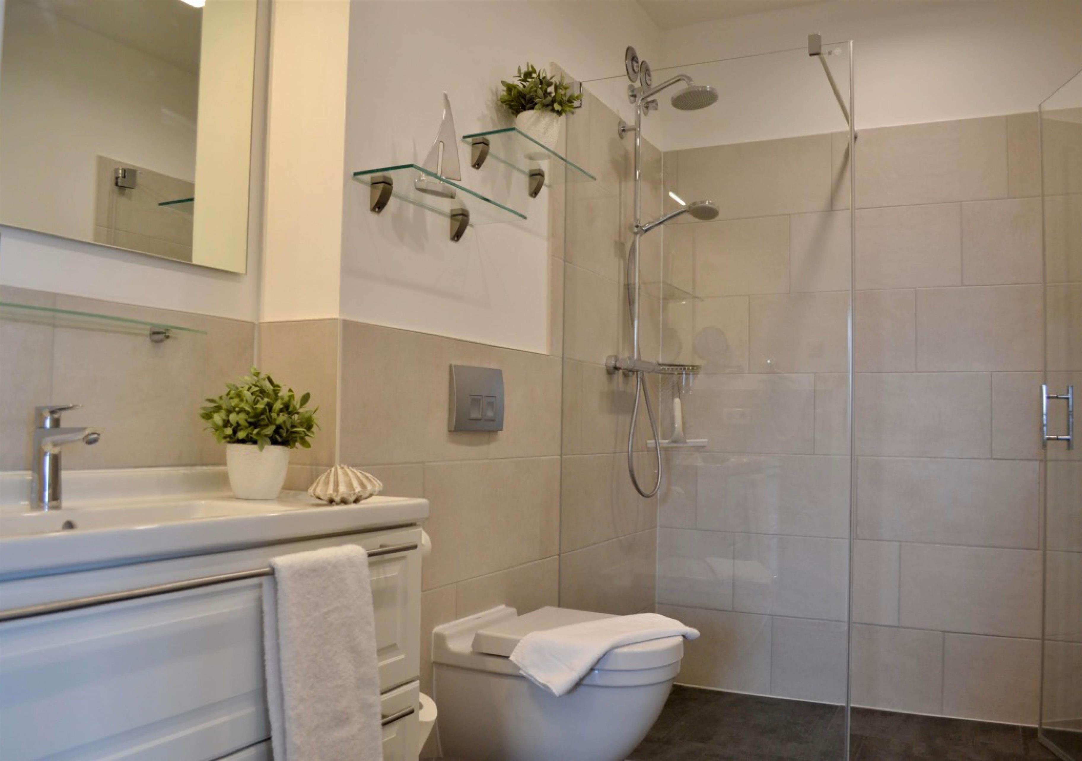 Die offene Regendusche ist das Highlight des Badezimmers und ausgestattet mit einem Handtuchwärmer, einem Waschtisch mit Kosmetikspiegel und einem Haartrockner.