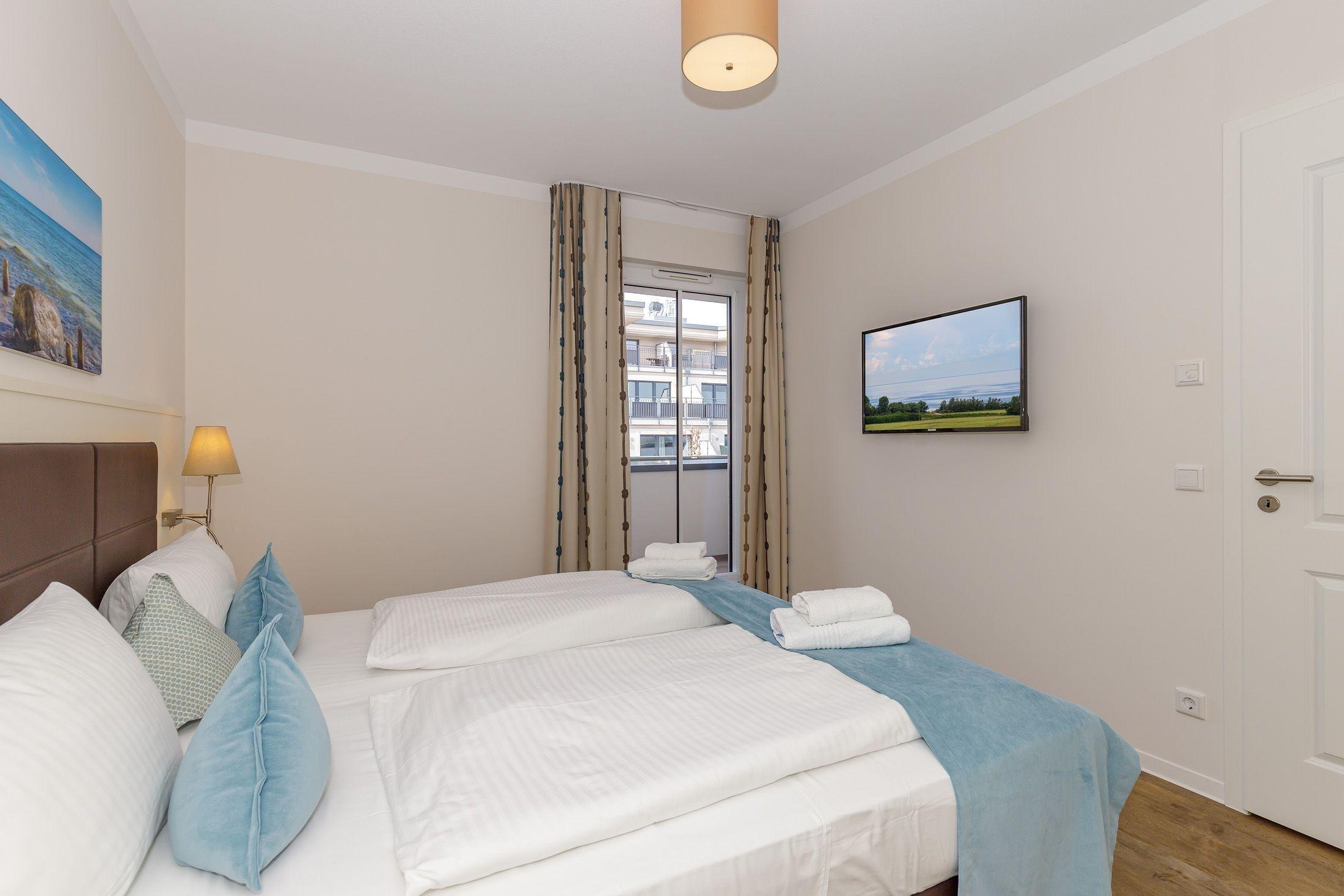 Die exklusive Ferienwohnung befindet sich in westlicher Lage in der 1. Etage des Aparthotels und bietet auf 49 m² viel Platz für bis zu 4 Personen. Der gemütliche Wohnbereich besitzt ein bequemes Sofa, welches sich mit wenigen Handgriffen zu einer Doppelschlafcouch (1,40m x 2,00m) umfunktionieren lässt, und sorgt mit einem Flatscreen-TV für reichlich Entertainment.