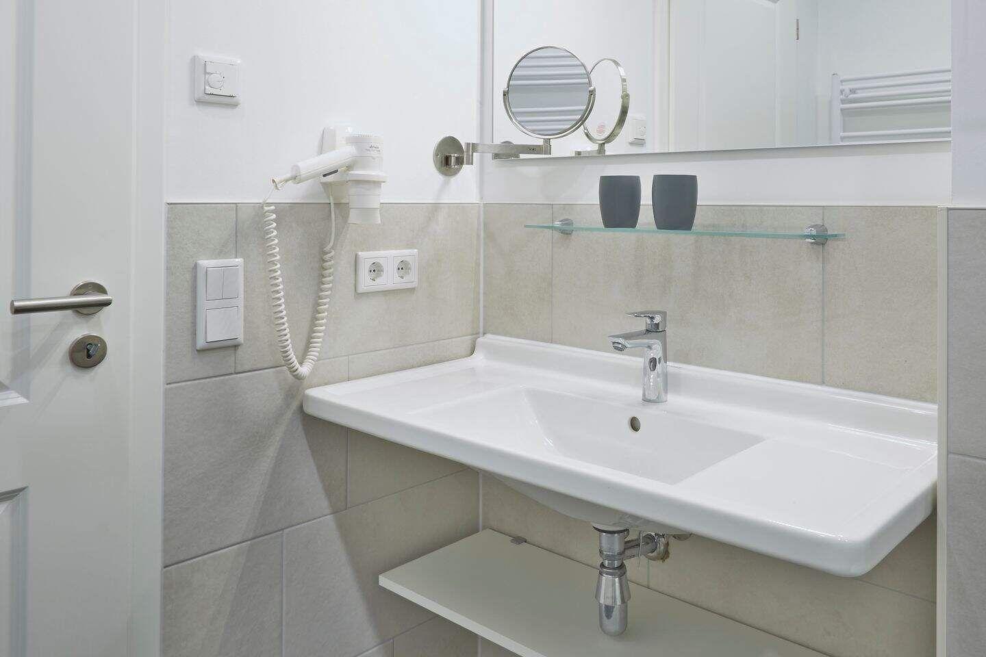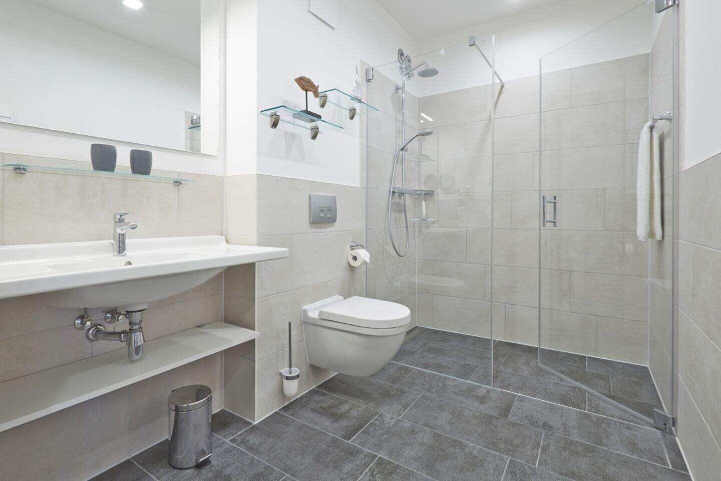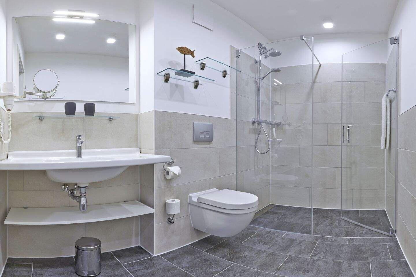 Die offene Regendusche ist das Highlight des Badezimmers und ausgestattet mit einem Handtuchwärmer, einem Waschtisch mit Kosmetikspiegel und einem Haartrockner.