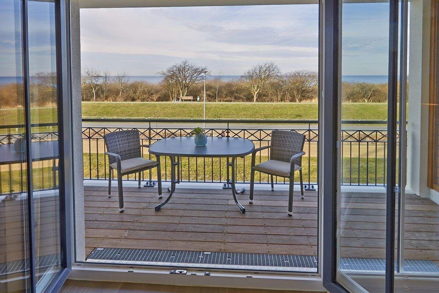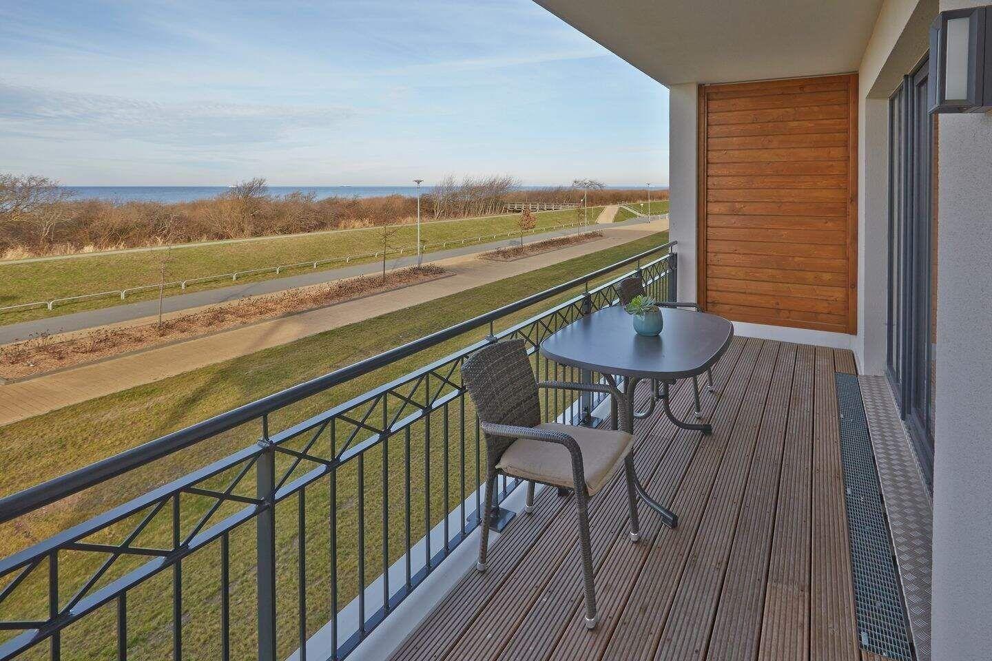 Der überdachte Balkon ist sowohl vom Wohnzimmer als auch vom Schlafzimmer aus begehbar. Natürlich stehen Ihnen hier auch Terrassenmöbel zur Verfügung, sodass Sie beispielsweise Ihr Frühstück oder Ihr Abendessen ganz privat im Sonnenschein zu sich nehmen können. Die Waterkant Suites liegen an der Promenade in Börgerende und somit direkt am Meer.