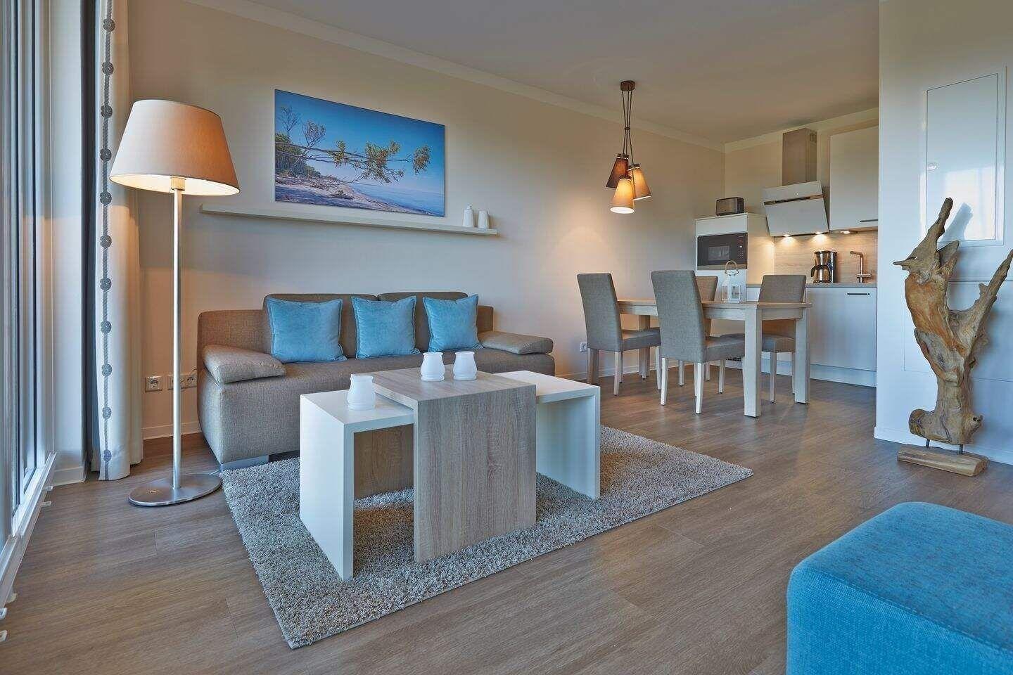 Die exklusive Ferienwohnung bietet auf 49 m² viel Platz für bis zu 4 Personen. Der gemütliche Wohnbereich besitzt ein bequemes Sofa, welches sich mit wenigen Handgriffen zu einer Doppelschlafcouch (1,40m x 2,00m) umfunktionieren lässt, und sorgt mit einem Flatscreen-TV für reichlich Entertainment.