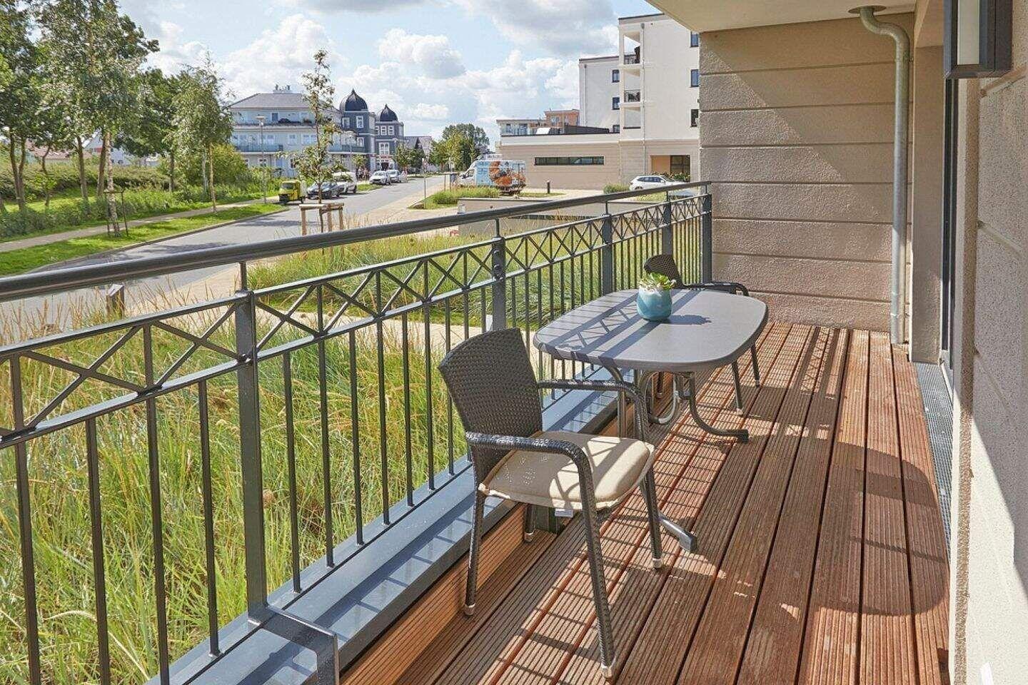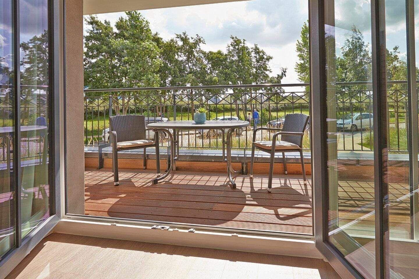 Der überdachte Balkon ist sowohl vom Wohnzimmer als auch vom Schlafzimmer aus begehbar. Natürlich stehen Ihnen hier auch Terrassenmöbel zur Verfügung, sodass Sie beispielsweise Ihr Frühstück oder Ihr Abendessen ganz privat im Sonnenschein zu sich nehmen können. Die Waterkant Suites liegen an der Promenade in Börgerende und somit direkt am Meer.