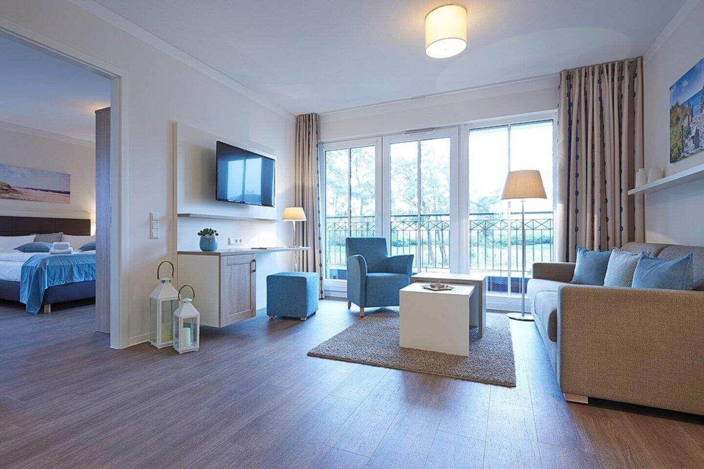 Die exklusive Suite bietet auf 50 m² viel Platz für bis zu 4 Personen. Der gemütliche Wohnbereich besitzt ein bequemes Sofa, welches sich mit wenigen Handgriffen zu einer Doppelschlafcouch (1,40m x 2,00m) umfunktionieren lässt, und sorgt mit einem