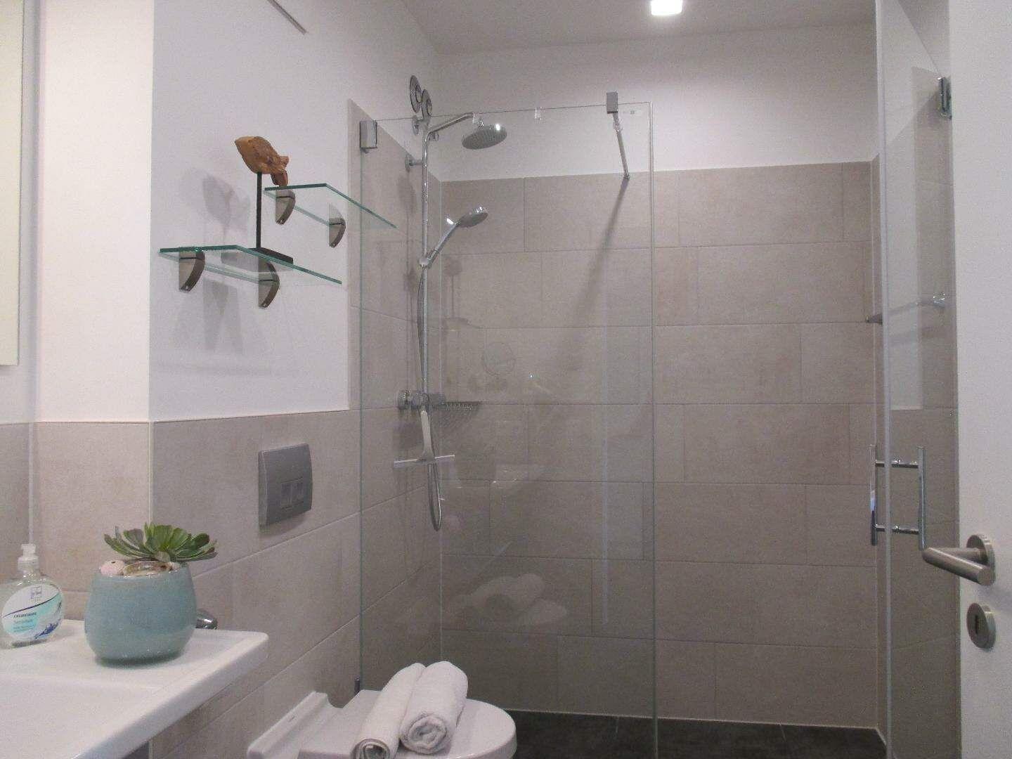 Im geräumigen Bad befinden sich eine großzügige, ebenerdige Regendusche, ein Handtuchtrockner, ein Waschtisch mit Föhn und Kosmetikspiegel.