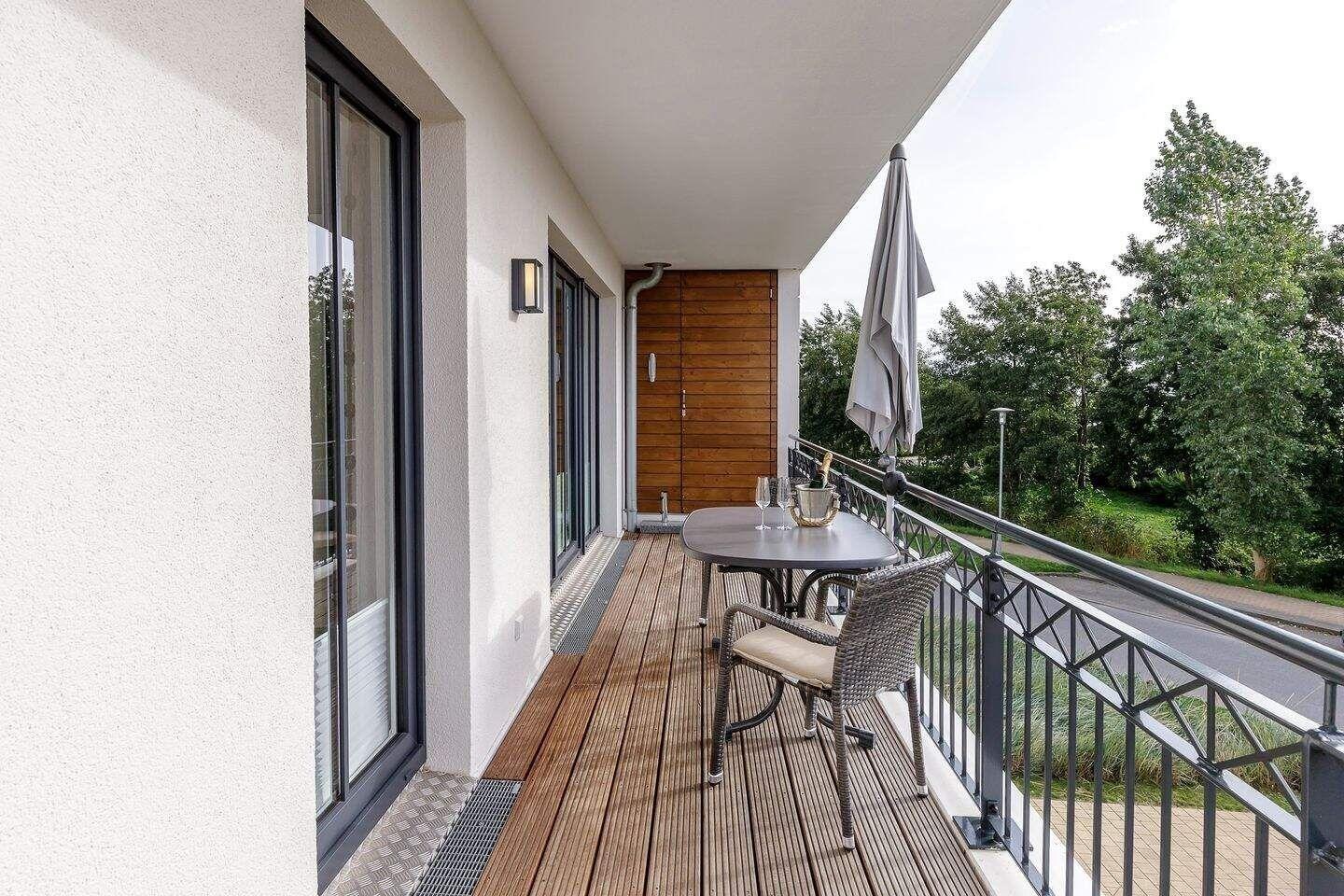 Ihr überdachter und möblierter Balkon zur ruhigen Straße ist sowohl vom Wohnzimmer als auch vom Schlafzimmer aus begehbar und bietet Ihnen wunderschöne Sonnenstunden am Nachmittag. Entspannen Sie hier bei einem Kaffee und Stück Kuchen vom Alltag und lassen Sie die Seele baumeln.