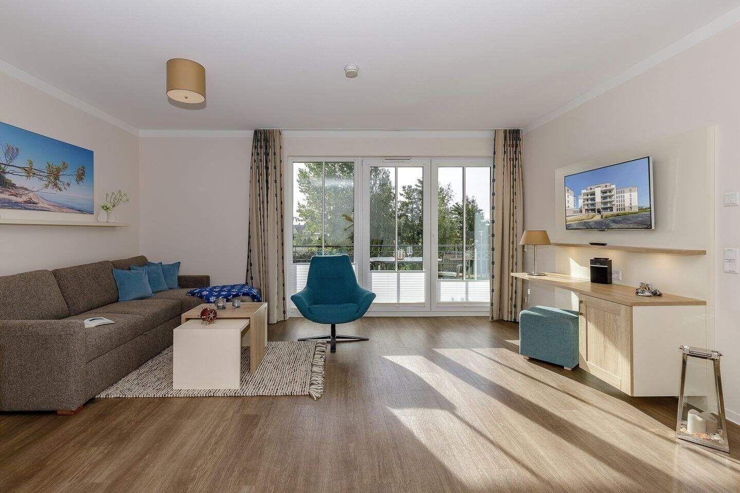 Die exklusive und kinderfreundliche Ferienwohnung befindet sich in der 1. Etage des Aparthotels und bietet auf 57 m² viel Platz für bis zu 4 Personen. Der gemütliche Wohnbereich besitzt ein bequemes Ecksofa, welches sich mit wenigen Handgriffen zu einer Doppelschlafcouch (1,50m x 2,00m) umfunktionieren lässt, und sorgt mit einem Flatscreen-TV für reichlich Entertainment.