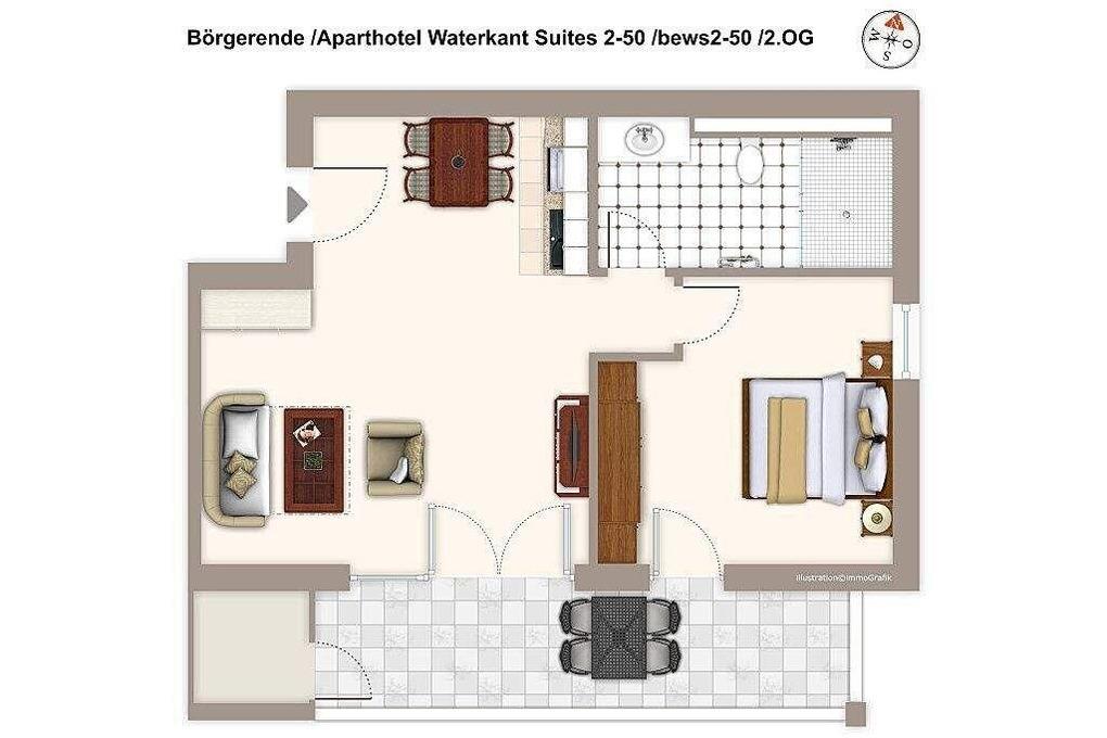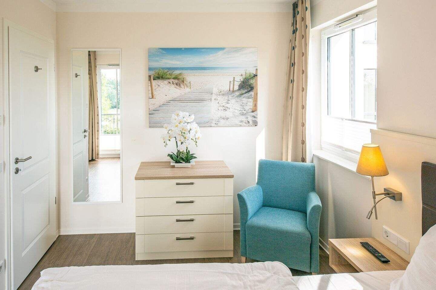 Mit 58 m² gehört die Suite 2-50 zu den größten Zweiraumapartments im Waterkant Aparthotel und ist für bis zu 4 Personen geeignet. Das Apartment befindet sich im zweiten Obergeschoss vom vorgelagerten Ostgebäude und ist bequem mit dem Fahrstuhl erreichbar. Dieser Gebäudebereich hat einen zusätzlichen separaten Eingang.