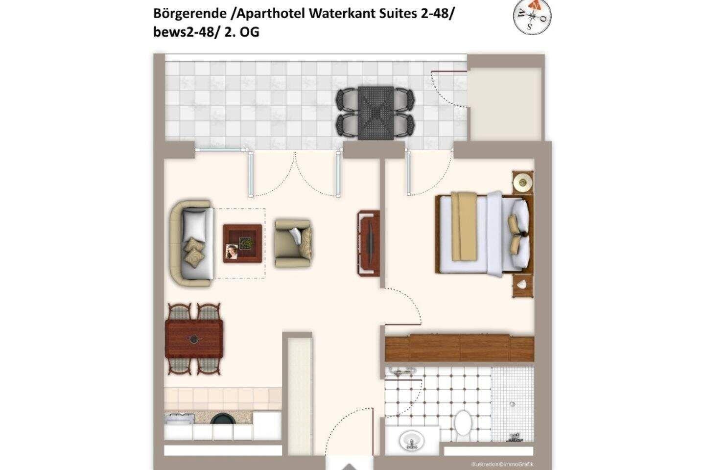 Der überdachte Balkon ist sowohl vom Wohnzimmer als auch vom Schlafzimmer aus begehbar. Natürlich stehen Ihnen hier auch Terrassenmöbel zur Verfügung, sodass Sie beispielsweise Ihr Frühstück oder Ihr Abendessen ganz privat im Sonnenschein zu sich nehmen können. Die Waterkant Suites liegen an der Promenade in Börgerende und somit direkt am Meer.