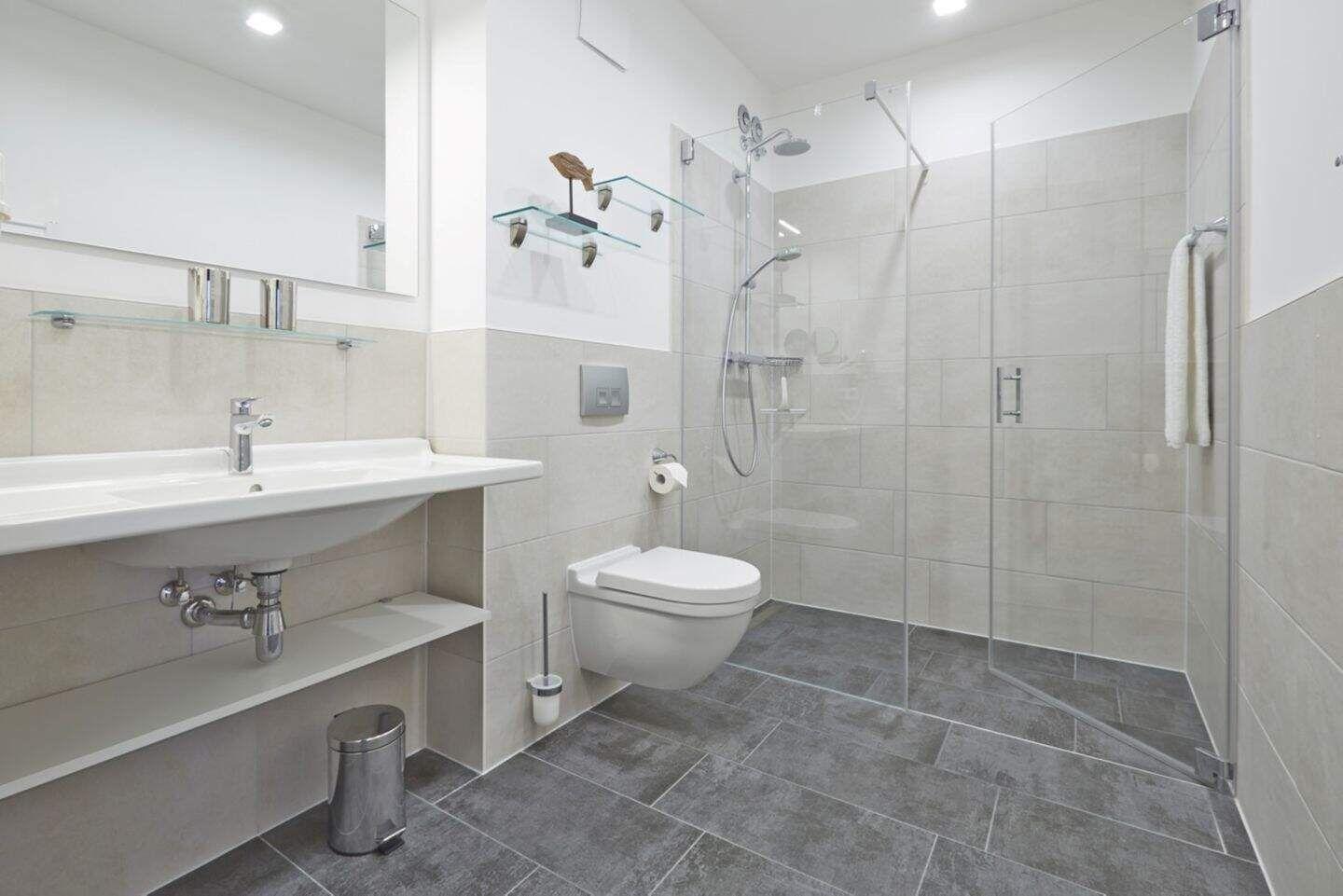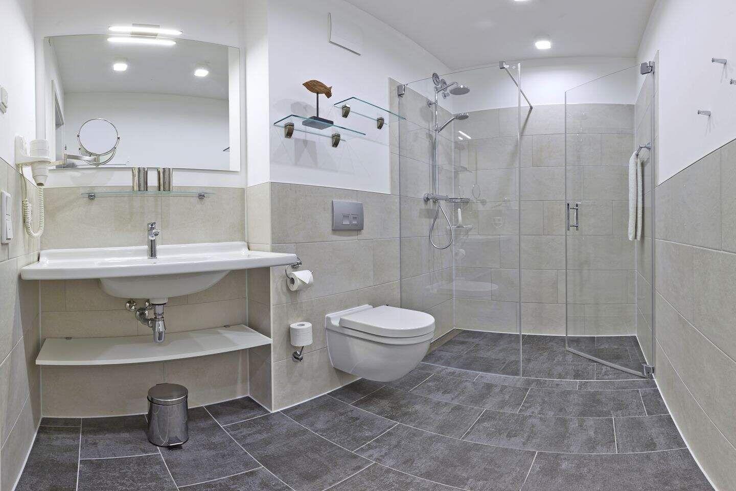 Die offene Regendusche ist das Highlight des Badezimmers. Es ist weiterhin ausgestattet mit einem Handtuchwärmer, einem Waschtisch mit Kosmetikspiegel und einem Haartrockner.