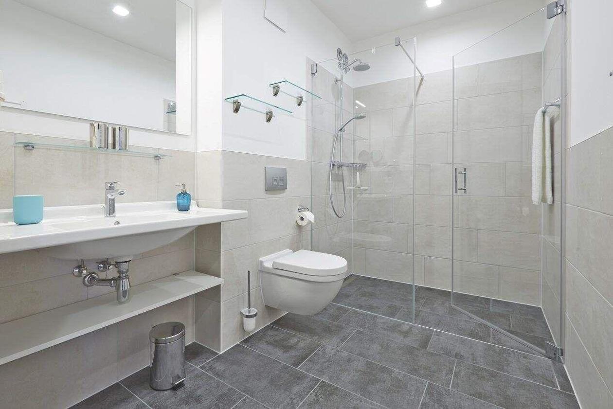 Die offene Regendusche ist das Highlight des Badezimmers. Es ist weiterhin ausgestattet mit einem Handtuchwärmer, einem Waschtisch mit Kosmetikspiegel und einem Haartrockner.