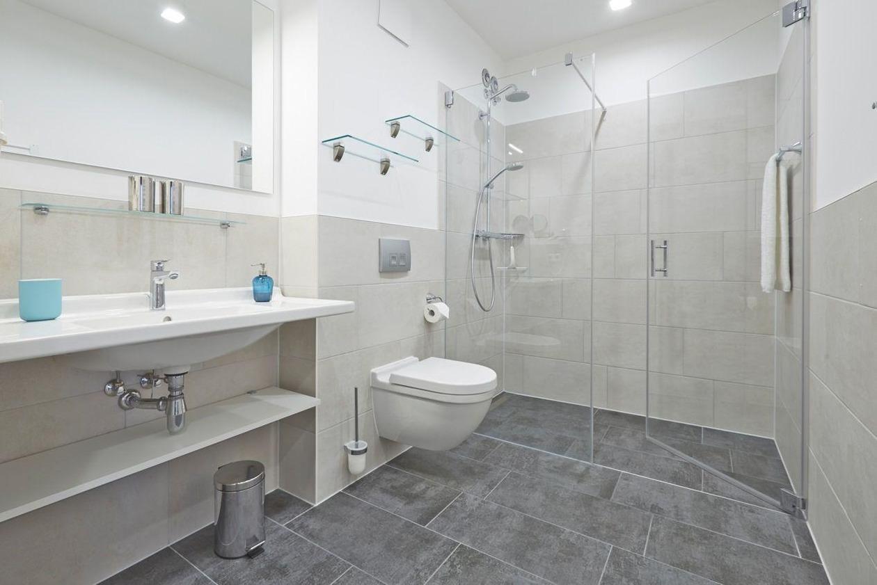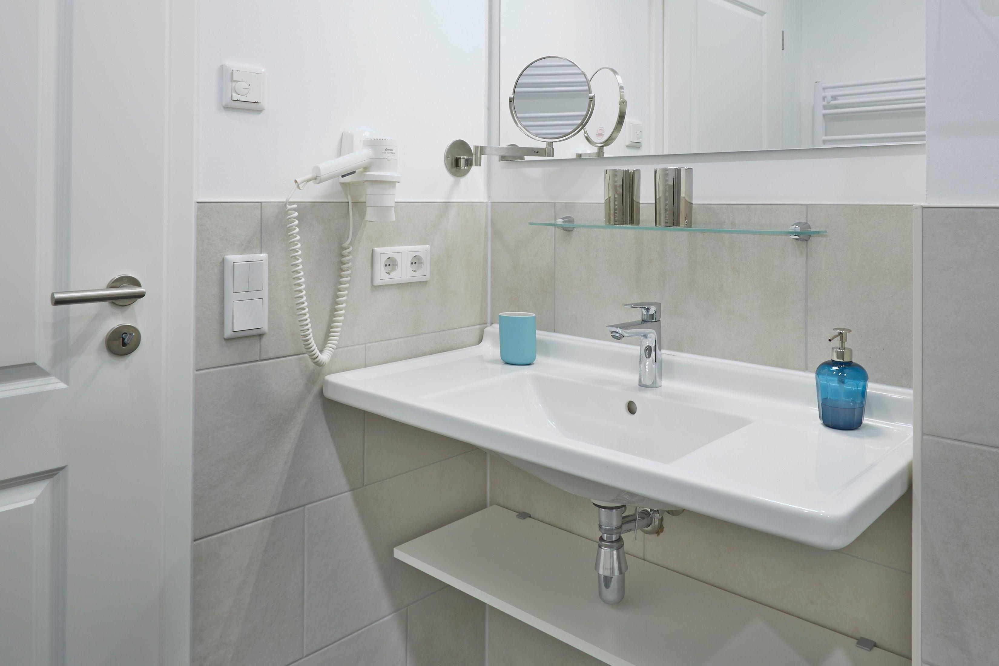 Im geräumigen Bad befinden sich eine großzügige, ebenerdige Regendusche, ein Handtuchtrockner, ein Waschtisch mit Föhn und Kosmetikspiegel.