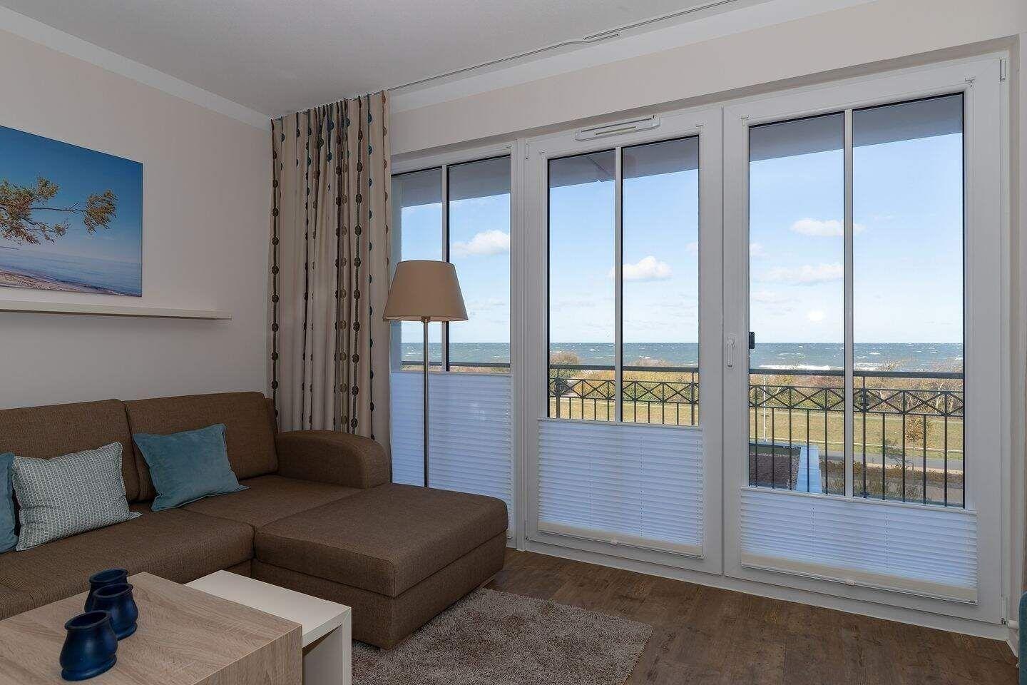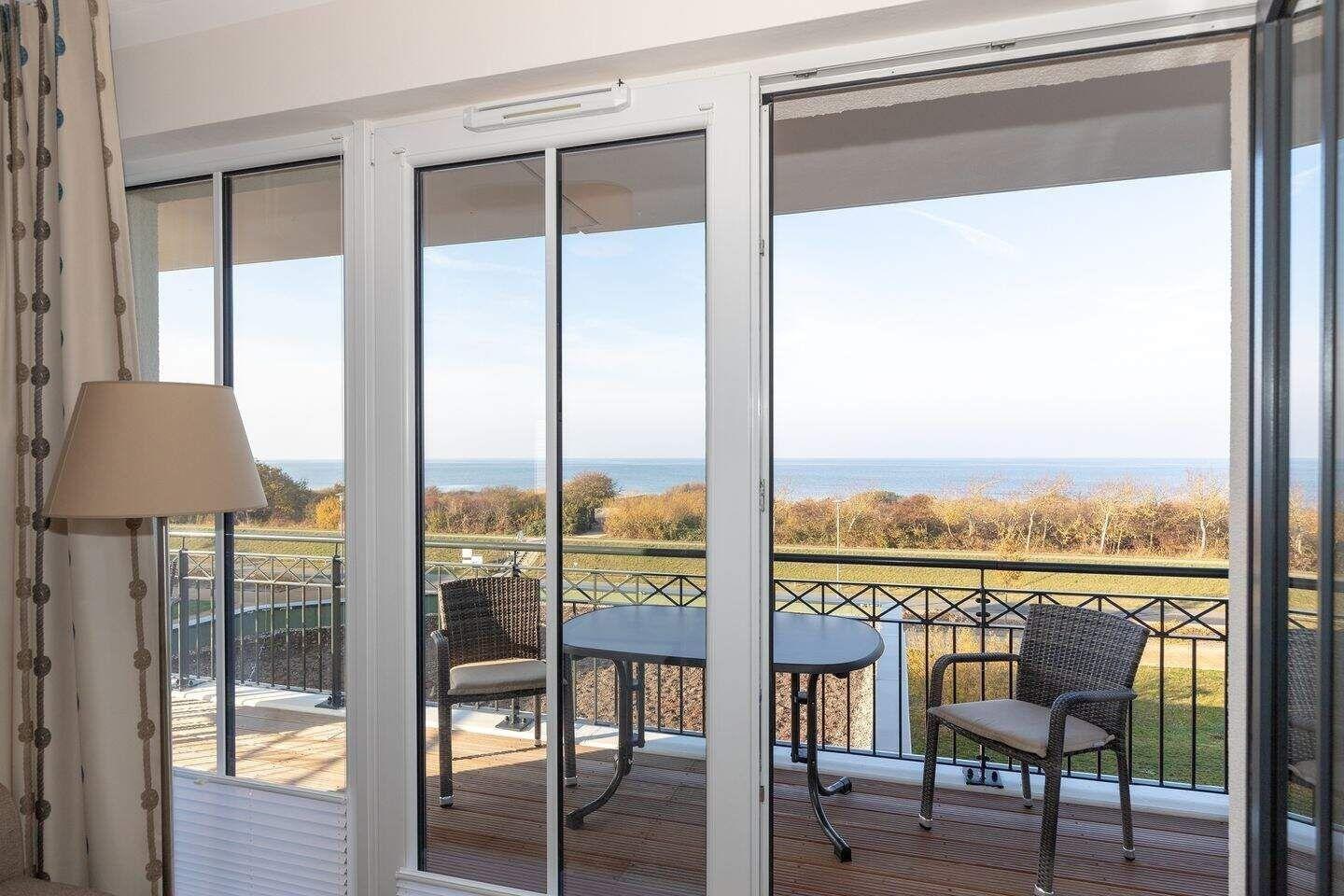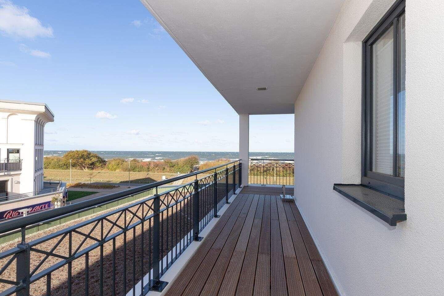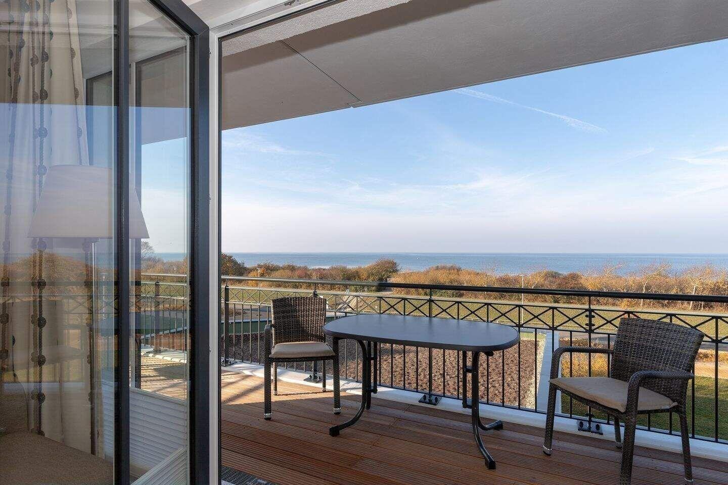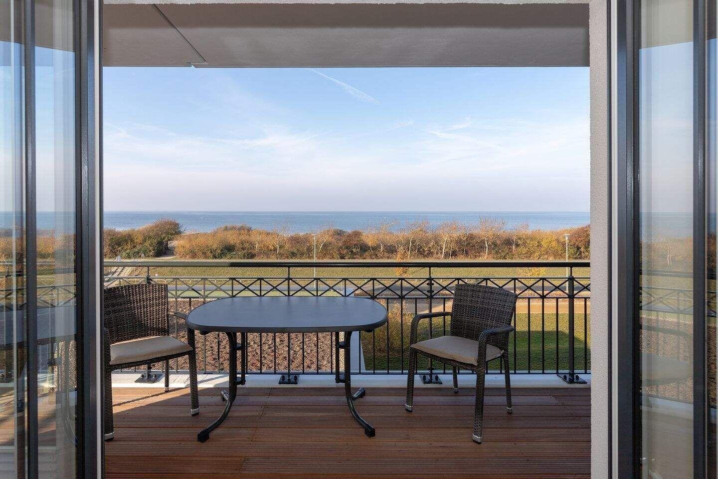 Auf dem überdachten Balkon, der zur Meerseite gelegen ist, stehen Ihnen Terrassenmöbel zur Verfügung. Hier können Sie mit Blick auf die Ostsee entspannen.