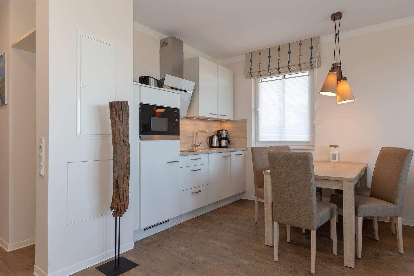 Im kombinierten Wohn-Essbereich befindet sich eine voll ausgestattete Küchenzeile, bequeme Sitzmöbel, ein Esstisch, eine Schlafcouch (140cm x 200cm) sowie ein Flat Screen-TV.