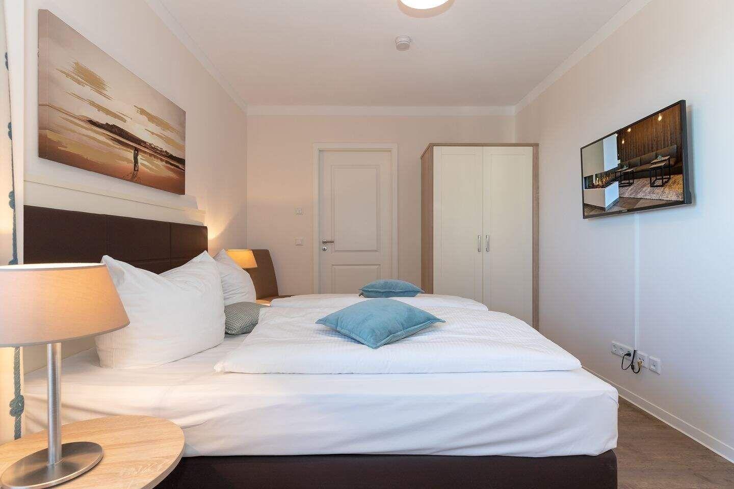 Die beiden separaten Schlafzimmer sind mit einem modernen Boxspringbett (180cm x 210cm), einem Flat Screen-TV und einem Safe ausgestattet. Der geräumige Kleiderschrank bietet genügend Platz für die mitgebrachte Urlaubsgarderobe.