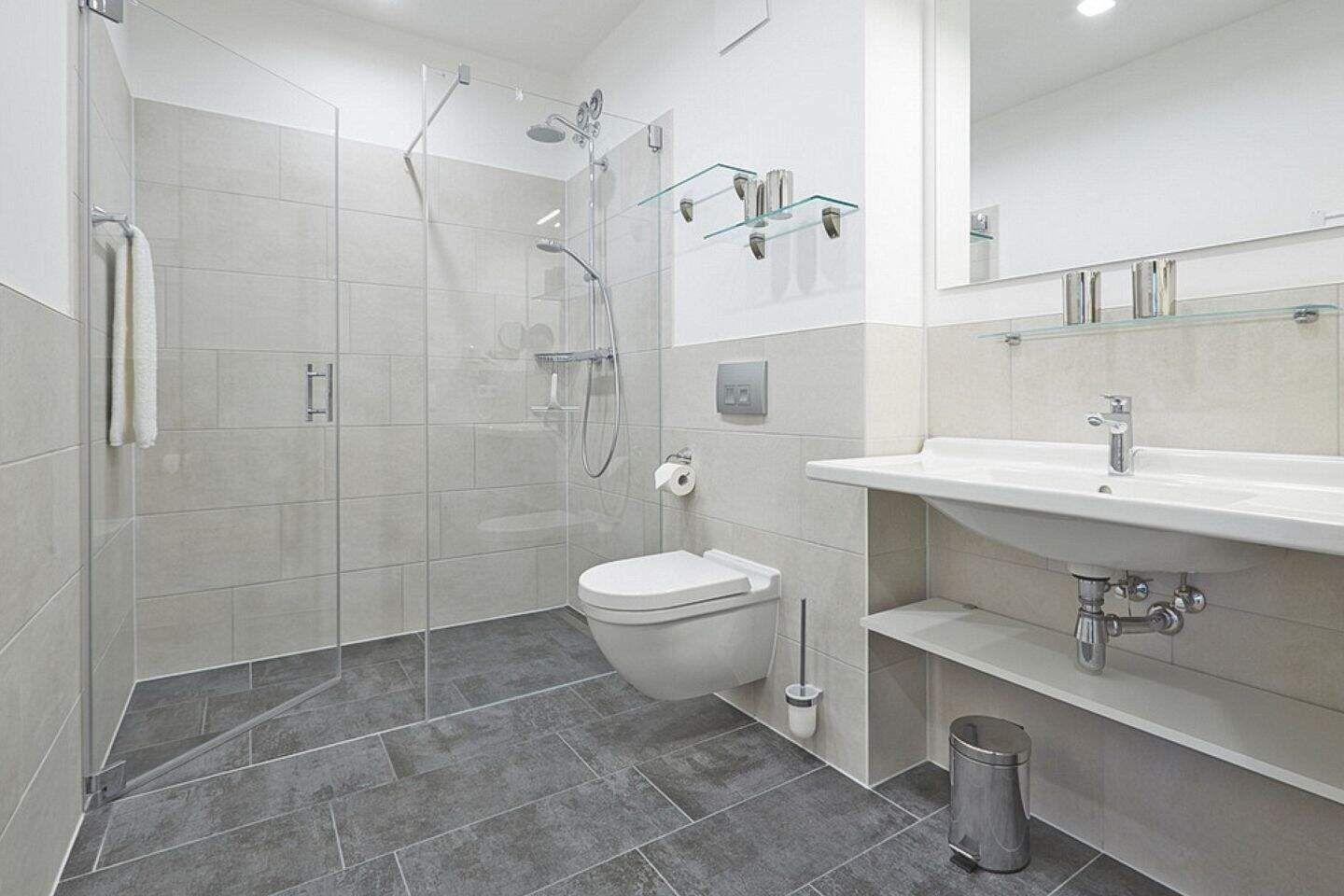 Die offene Regendusche ist das Highlight der Wohnung. Das Badezimmer ist ausgestattet mit einem Handtuchwärmer, einem Waschtisch mit Kosmetikspiegel und einem Haartrockner.