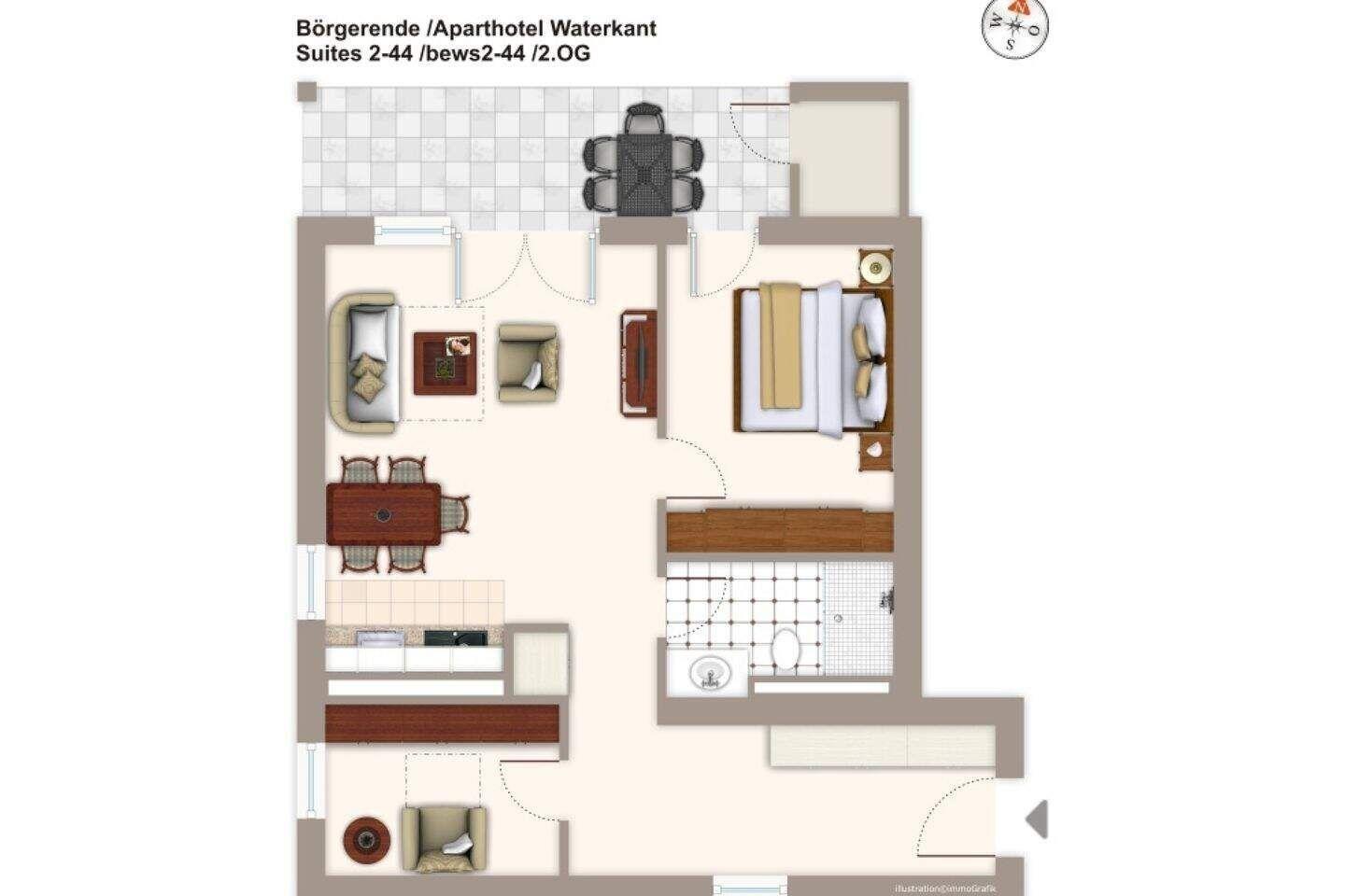 Der überdachte Balkon ist sowohl vom Wohnzimmer als auch vom Schlafzimmer aus begehbar. Natürlich stehen Ihnen hier auch Terrassenmöbel zur Verfügung, sodass Sie beispielsweise Ihr Frühstück oder Ihr Abendessen ganz privat im Sonnenschein zu sich nehmen können. Die Waterkant Suites liegen an der Promenade in Börgerende und somit direkt am Meer.