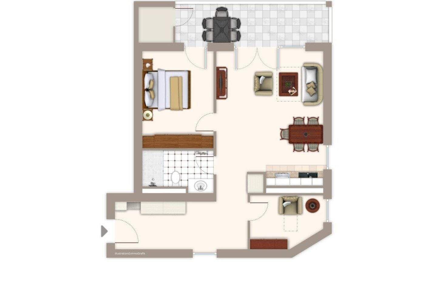 Diese exklusive Suite befindet sich in der dritten Etage und bietet auf 68 m² viel Platz für bis zu 5 Personen. Der gemütliche Wohnbereich besitzt ein bequemes Sofa, welches sich mit wenigen Handgriffen zu einer Doppelschlafcouch (1,50m x 2,00m) umfunktionieren lässt, und sorgt mit einem Flatscreen-TV für reichlich Entertainment.