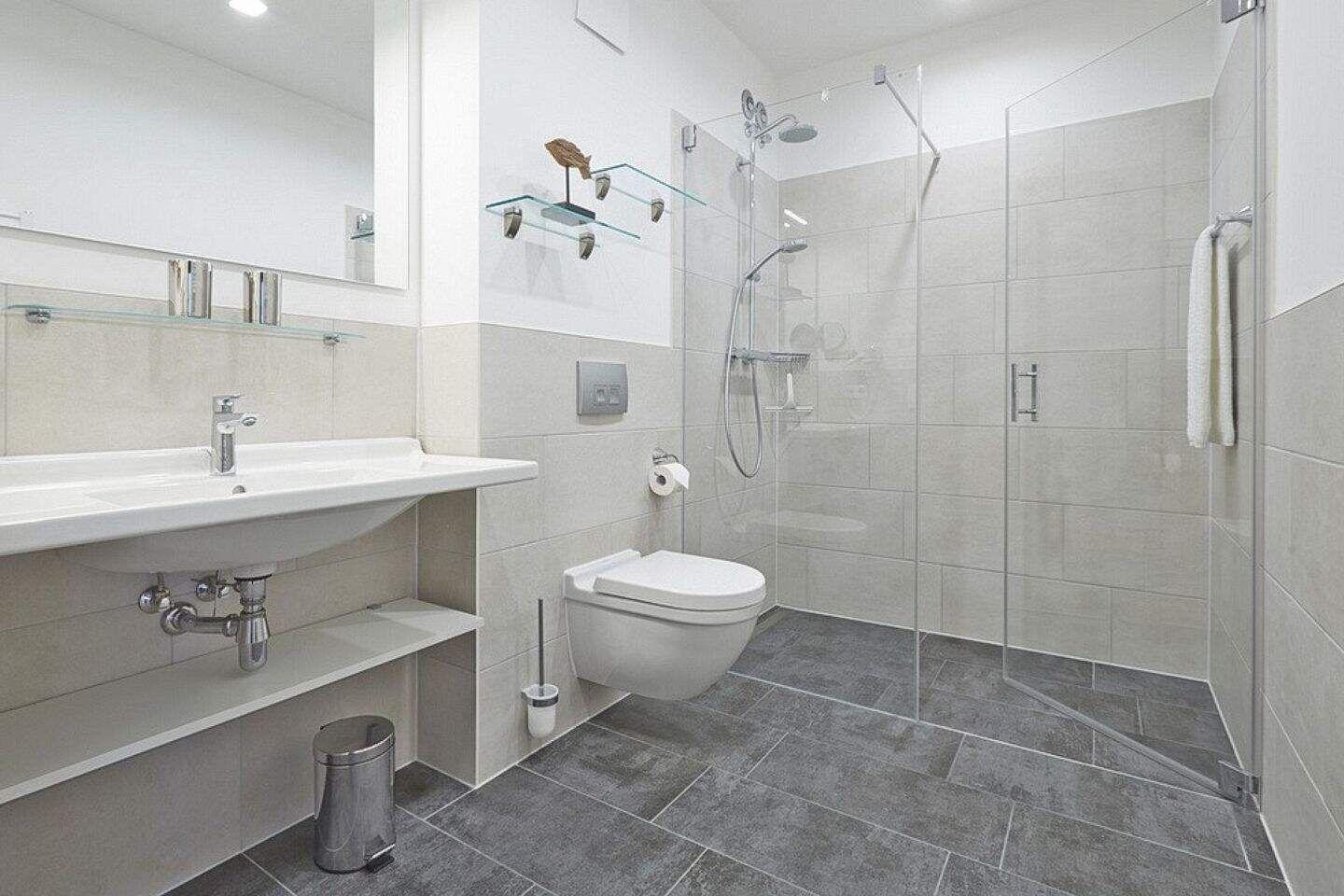 Die offene Regendusche ist das Highlight des Badezimmers. Es ist weiterhin ausgestattet mit einem Handtuchwärmer, einem Waschtisch mit Kosmetikspiegel und einem Haartrockner.