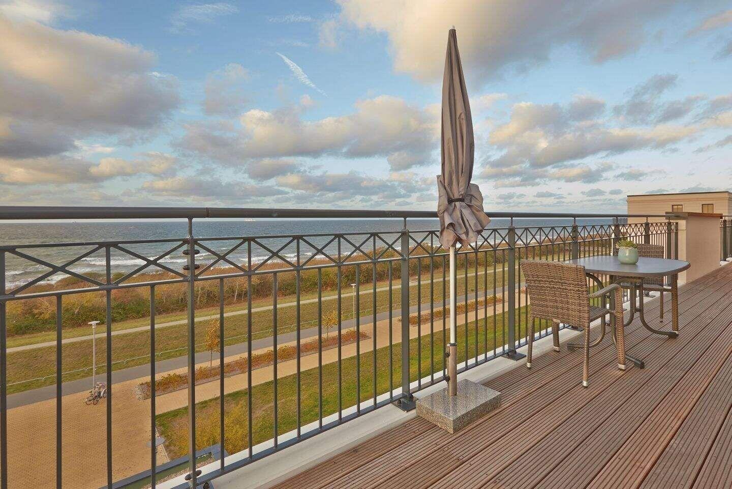 Die Dachterrasse ist sowohl vom Wohnzimmer als auch vom Schlafzimmer aus begehbar. Natürlich stehen Ihnen hier auch Terrassenmöbel zur Verfügung sodass Sie beispielsweise Ihr Frühstück oder Ihr Abendessen ganz privat im Sonnenschein und mit Blick auf die Ostsee zu sich nehmen können. Die Waterkant Suites liegen an der Promenade in Börgerende und somit direkt am Meer.